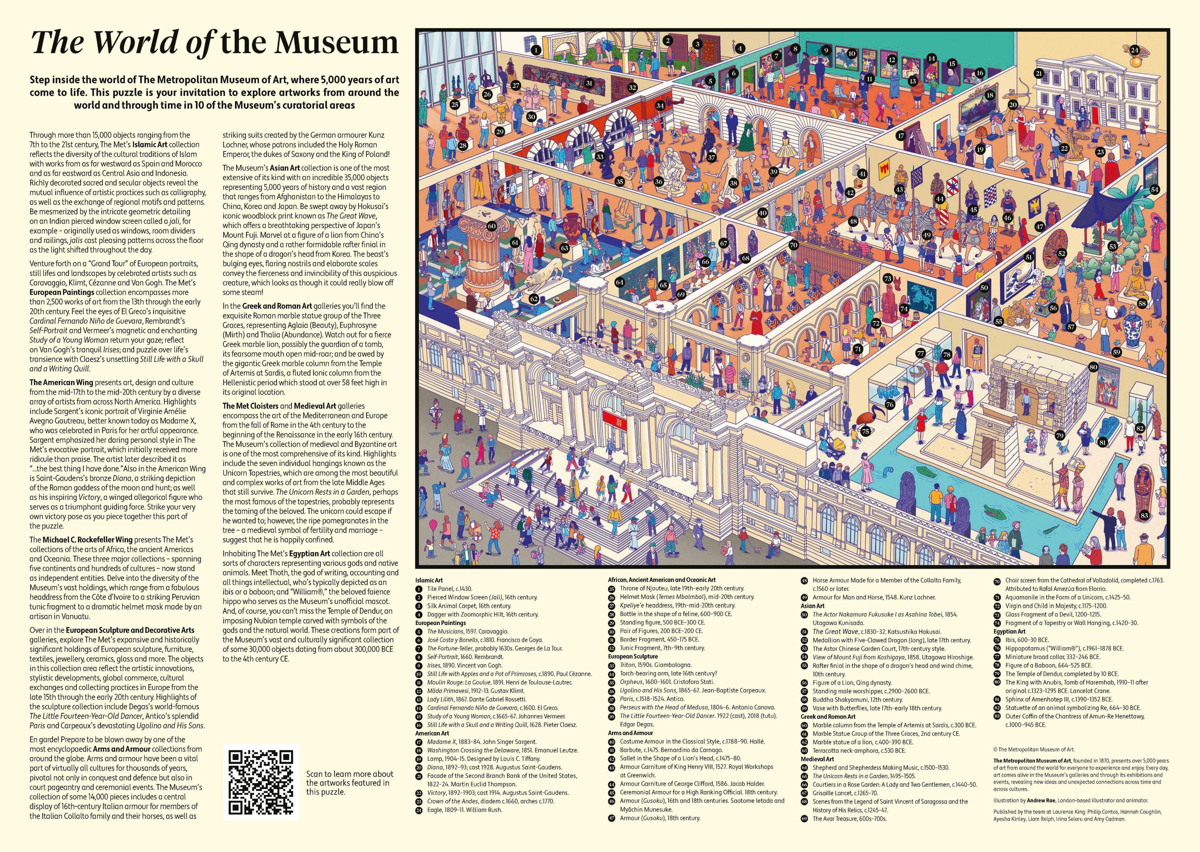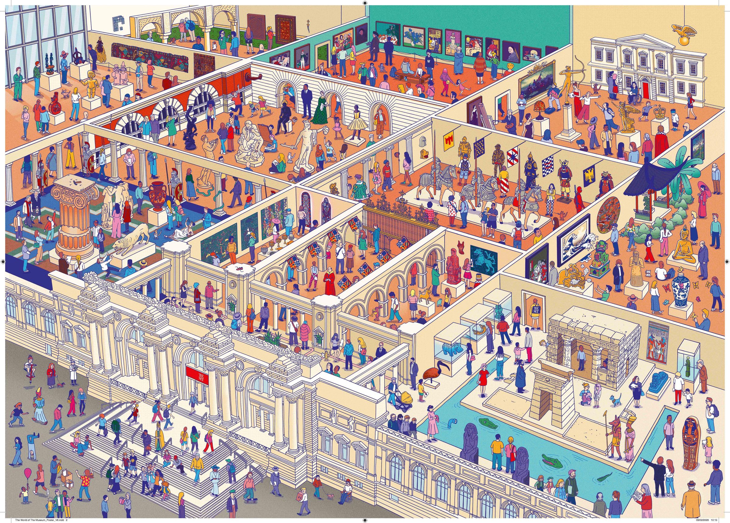 Flanieren Sie durch ein Museum, in dem Künstler*innen aus Vergangenheit und Gegenwart ihre Meisterwerke betrachten, Besucher*innen Unfug treiben und Kunstwerke zum Leben erweckt werden. Entdecken Sie großartige Kunst aus aller Welt, von japanischen Holzschnitten über antike griechische Skulpturen und niederländische Ölgemälde bis hin zu französischen Aquarellen. Diese lebhafte Museumsszene gibt Ihnen die einmalige Gelegenheit die Schätze des MET bequem von zuhause aus zu entdecken. Auf dem Poster finden Sie einen Text des Kurators zu den dargestellten Werken.