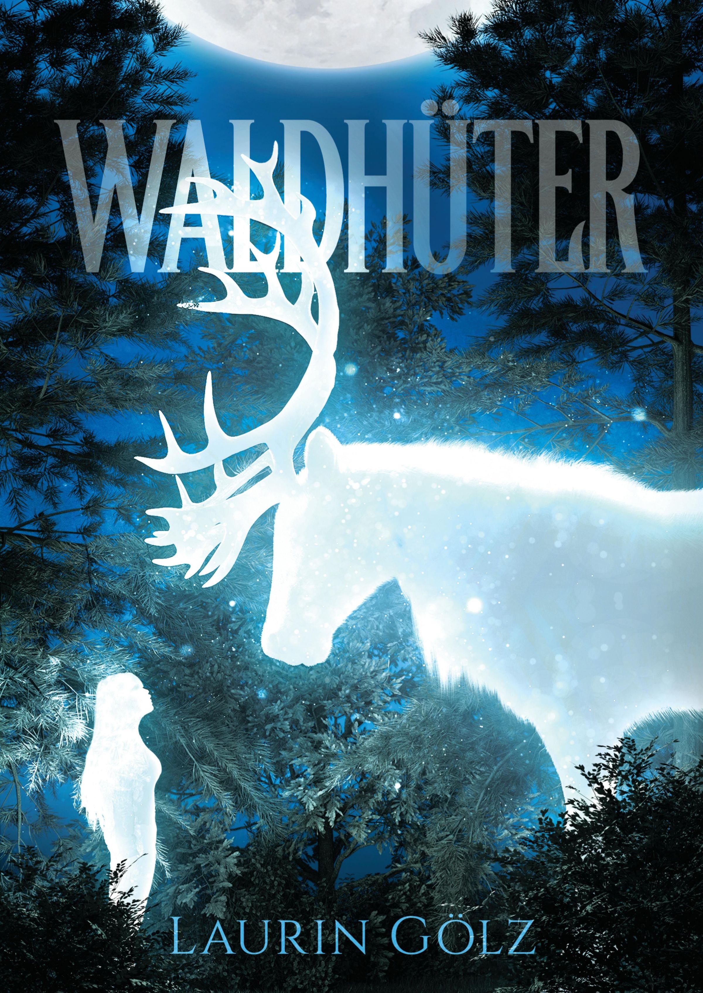 Text: WALDHÜTER, Laurin Gölz. Leuchtender Hirsch im Wald, neben einer menschlichen Silhouette, Mond im Hintergrund., Buch