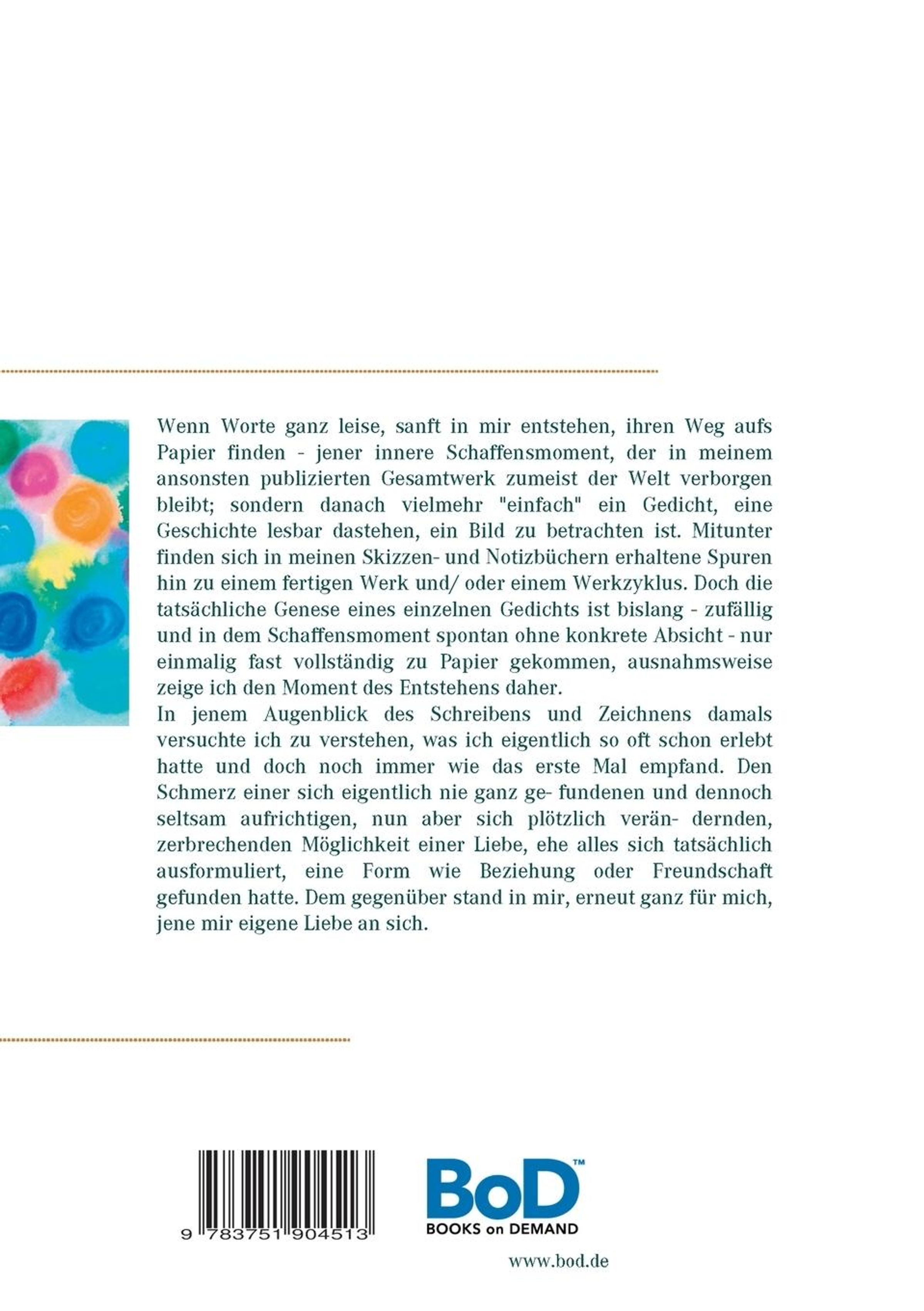 Wenn Worte ganz leise, sanft in mir entstehen, ihren Weg aufs Papier finden - jener innere Schaffensmoment, der in meinem ansonsten publizierten Gesamtwerk zumeist der Welt verborgen bleibt; sondern danach vielmehr "einfach" ein Gedicht, eine Geschichte lesbar dastehen, ein Bild zu betrachten ist. Mitunter finden sich in meinen Skizzen- und Notizbüchern erhaltene Spuren hin zu einem fertigen Werk und/ oder einem Werkzyklus. Doch die tatsächliche Genese eines einzelnen Gedichts ist bislang - zufällig und in dem Schaffensmoment spontan ohne konkrete Absicht - nur einmalig fast vollständig zu Papier gekommen, ausnahmsweise zeige ich den Moment des Entstehens daher. In jenem Augenblick des Schreibens und Zeichnens damals versuchte ich zu verstehen, was ich eigentlich so oft schon erlebt hatte und doch noch immer wie das erste Mal empfand. Den Schmerz einer sich eigentlich nie ganz ge- fundenen und dennoch seltsam aufrichtigen, nun aber sich plötzlich verän- dernden, zerbrechenden Möglichkeit einer Liebe, ehe alles sich tatsächlich ausformuliert, eine Form wie Beziehung oder Freundschaft gefunden hatte. Dem gegenüber stand in mir, erneut ganz für mich, jene mir eigene Liebe an sich.