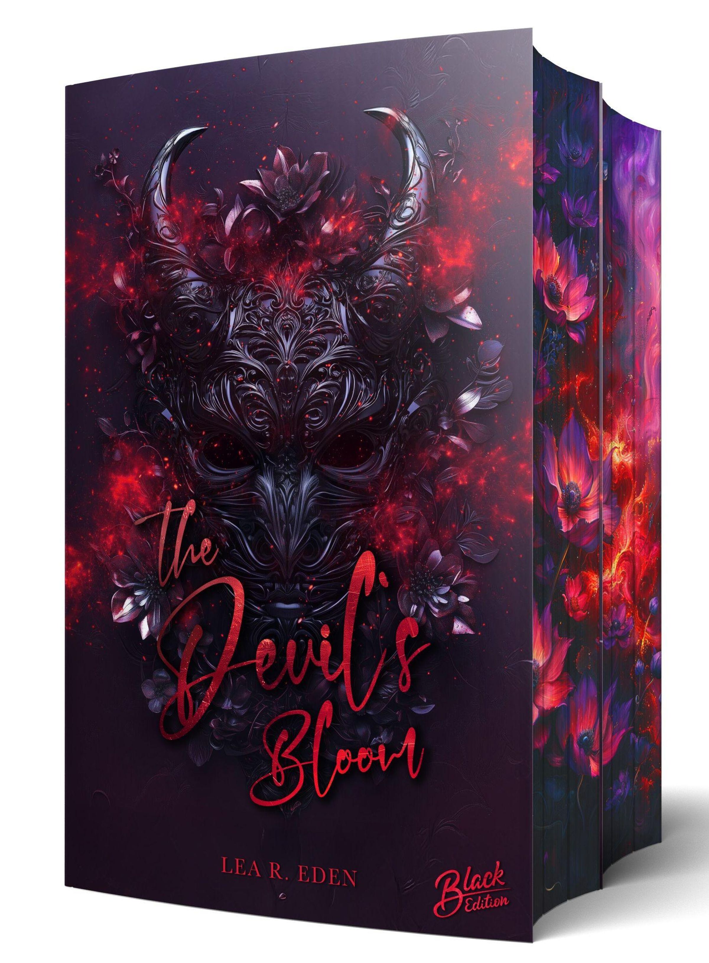 "The Devil's Bloom", Lea R. Eden. Dunkles Design mit floralen und teuflischen Elementen, rote Blumenakzente., Buch