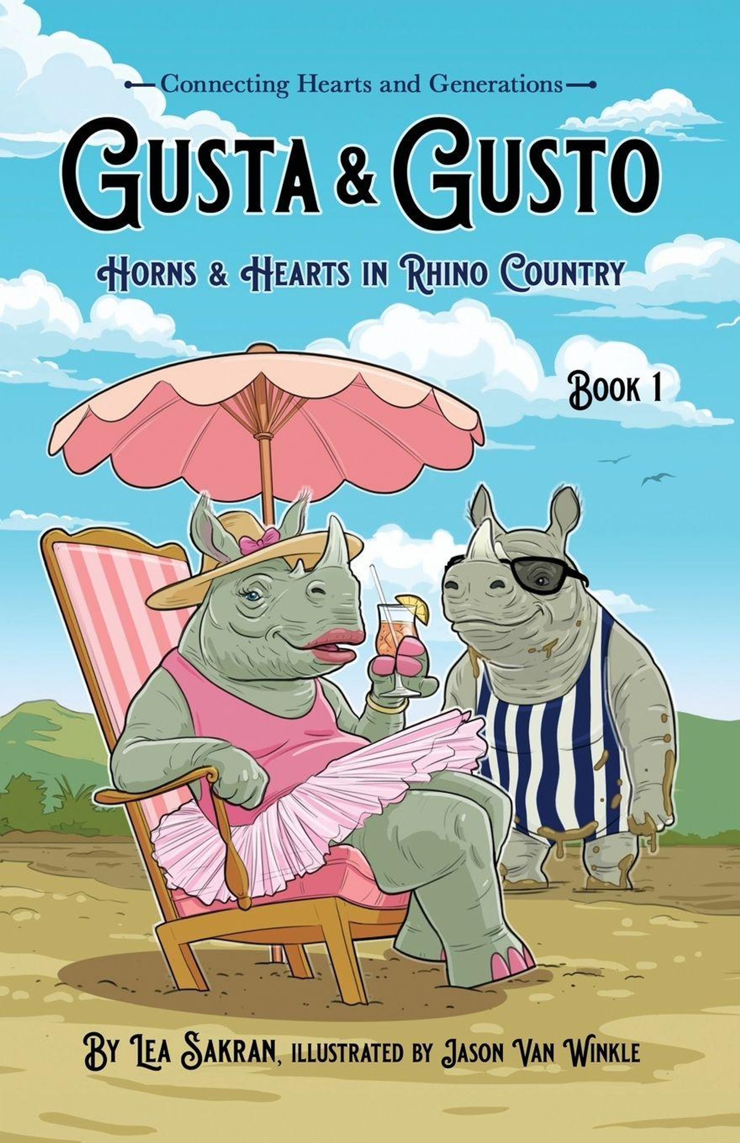 „Gusta & Gusto: Hörner und Herzen im Nashornland“, Buch 1. Zwei Nashörner in sommerlicher Kleidung am Strand., Buch