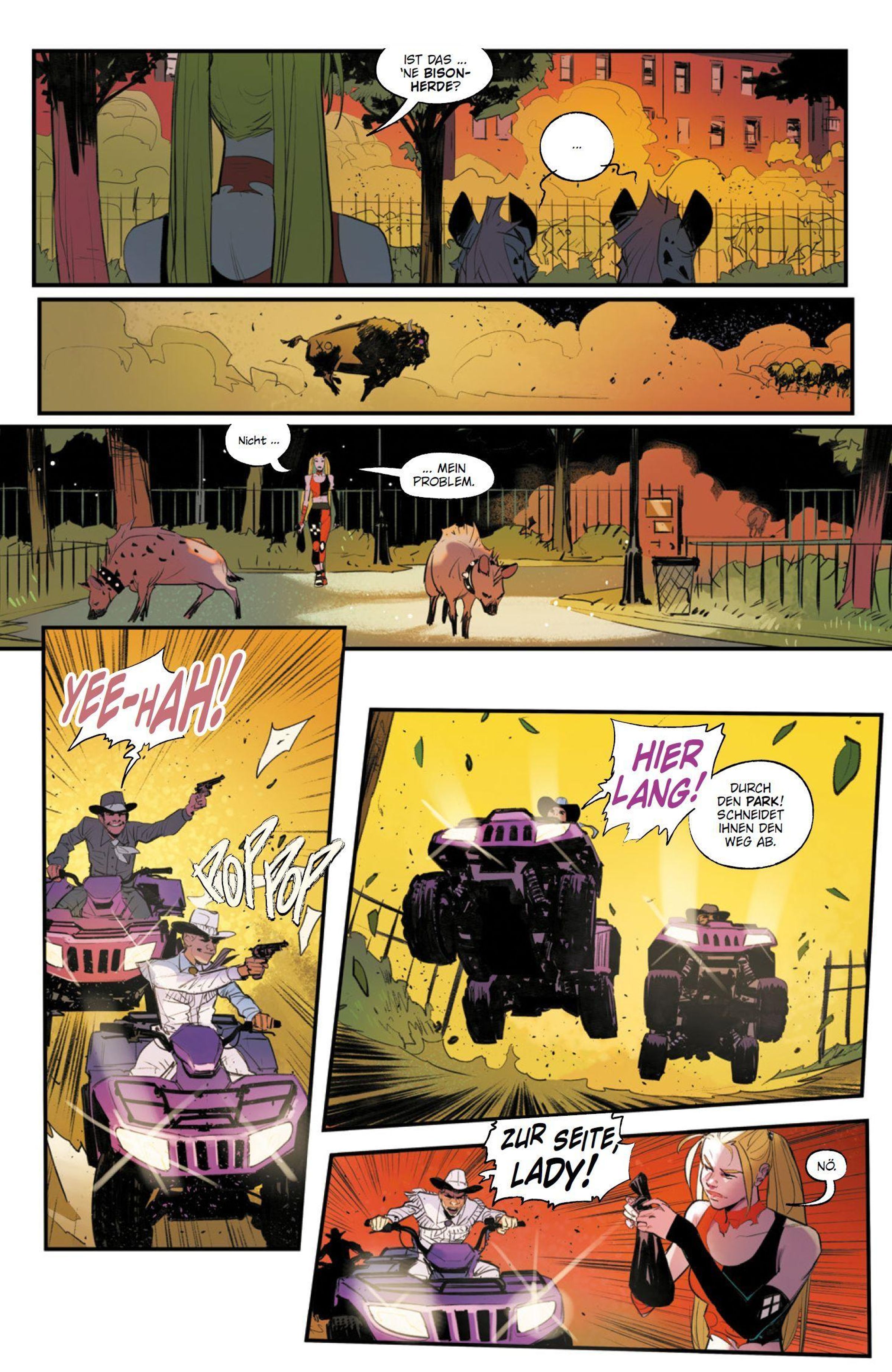 DIE SIRENS GEGEN DURCHGEKNALLTE COWBOY-AVATARE! Schnallt euch an für einen wilden Ritt! Die lang erwartete Rückkehr des Kult-Trios Catwoman, Poison Ivy und Harley Quinn übertrifft alle Erwartungen. Ein pferder Überlebenswettbewerb rund um den illegalen Energydrink XO Punch rockt Gotham City. Das Gesöff sorgt für Chaos und wilde Jagdszenen. Und biomechanische Bestien nehmen die Zivilbevölkerung im Auftrag von Superschurkin Punchline aufs Korn. Die Antiheldinnen treffen auf durchgeknallte Cowboy-Avatare, anzügliche Streamer und die Schurkin White Rabbit.