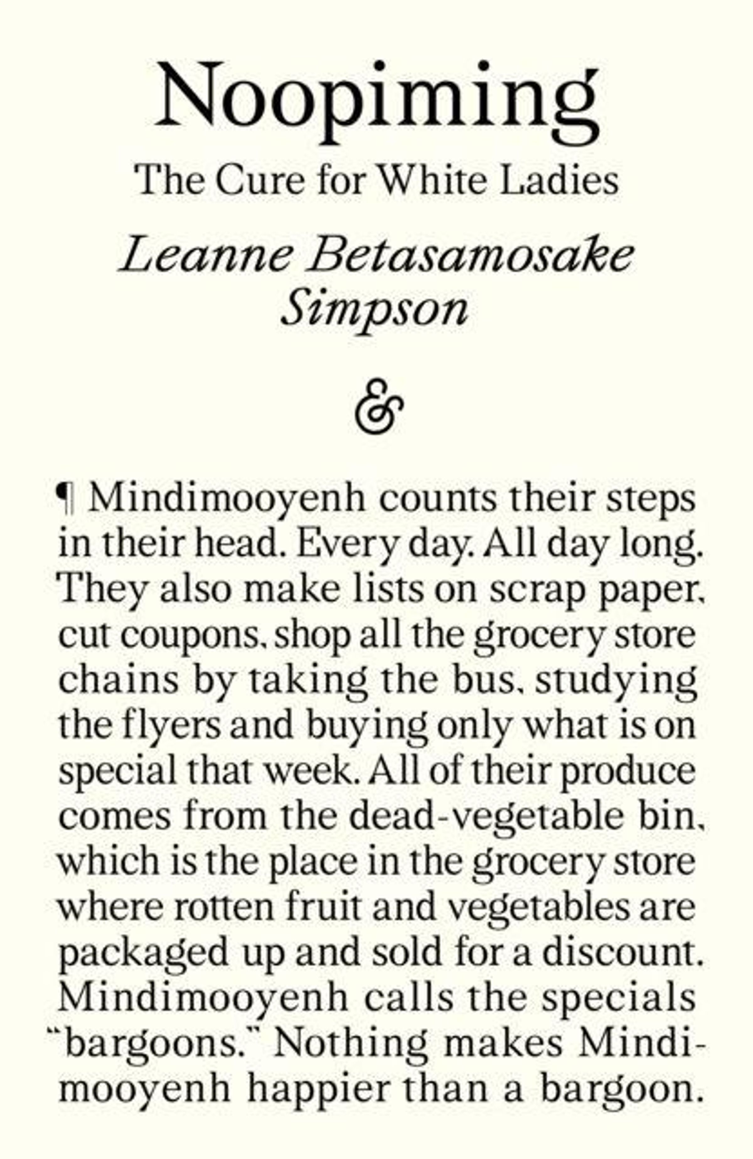 Noopiming is Anishinaabemowin for 'in the bush.' In it, Simpson and a cast of seven - Akiwenzii, the old man; Ninaatig, the maple tree; Mindimooyenh, the old woman; Sabe, the giant; Adik, the caribou; and Asin and Lucy, younger humans - turn the tables on colonial myth-making, exposing the unnatural strangeness at the heart of settler-capitalism. With warm humour and canny observation, The Cure for White Ladies breaks open the self to a world still alive with people, animals, ancestors, and spirits.