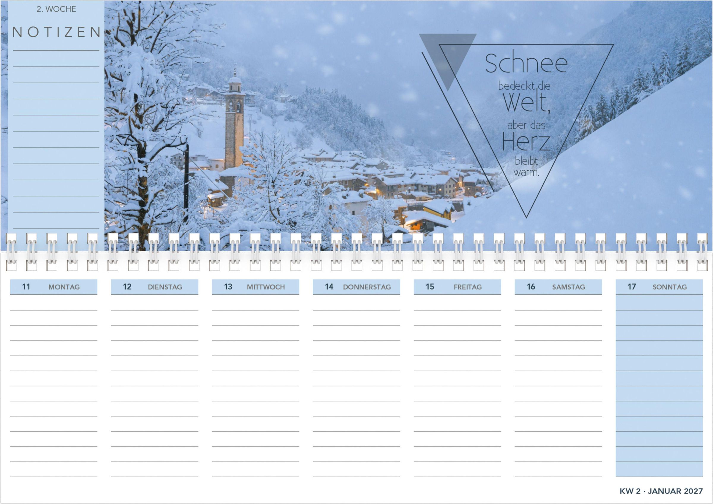 Der Tischquerkalender „Lebensweisheiten 2027" von Alpha Edition verbindet Woche für Woche inspirierende Lebensweisheiten mit stimmungsvollen Motiven -- und bietet zugleich viel Platz zum Planen. Durch das Layout „1 Woche auf 2 Seiten" behalten Sie Termine und To-dos übersichtlich im Blick. Zusätzlich gibt es jede Woche ein extra Notizfeld für persönliche Gedanken, Erinnerungen oder individuelle Eintragungen -- ideal für Schreibtisch, Homeoffice oder Büro.