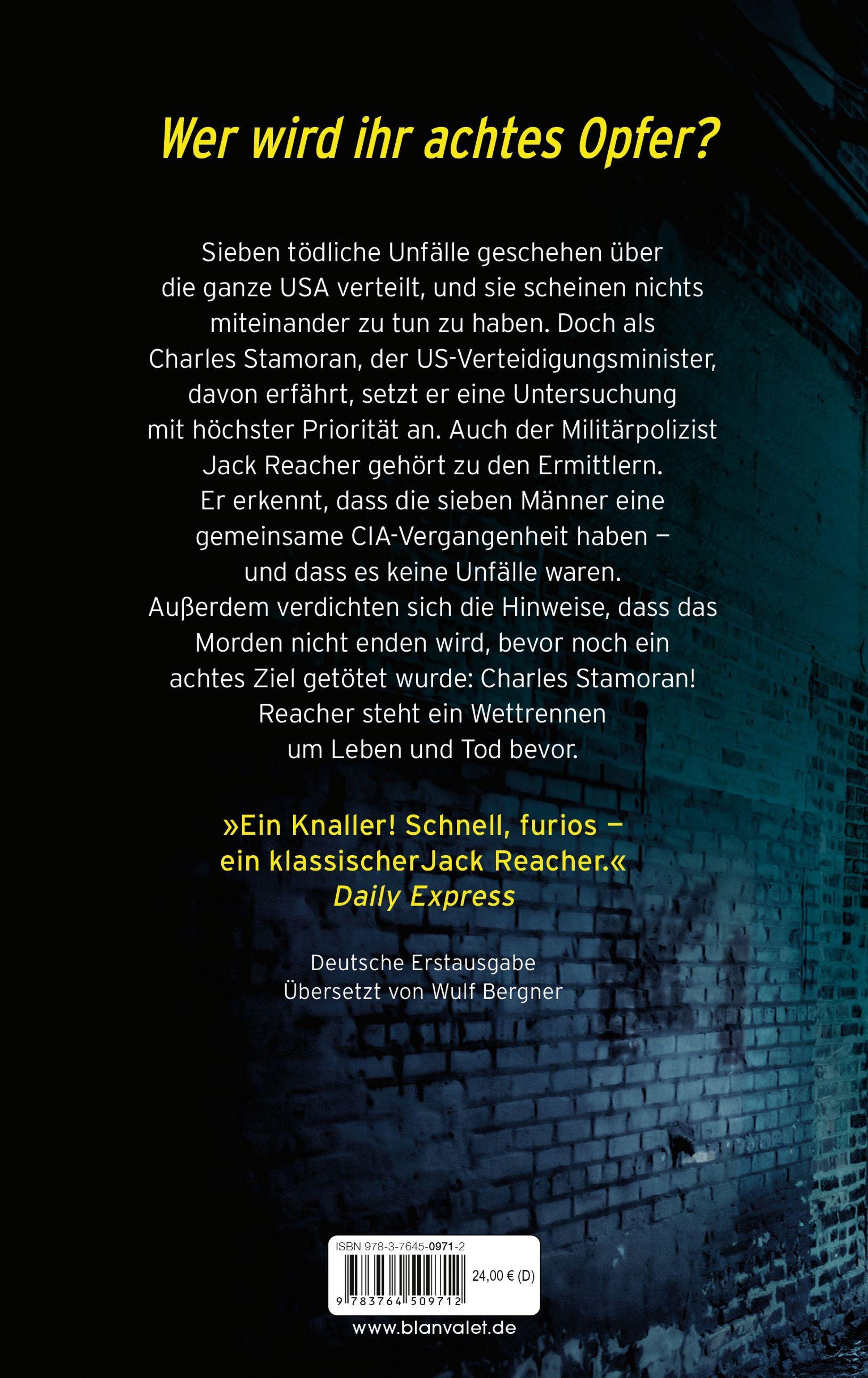 Sieben tödliche Unfälle geschehen über die ganze USA verteilt, und sie scheinen nichts miteinander zu tun zu haben. Doch als Charles Stamoran, der US-Verteidigungsminister, davon erfährt, setzt er eine Untersuchung höchster Priorität an. Auch der Militärpolizist Jack Reacher gehört zu den Ermittlern. Er erkennt, dass die sieben Männer eine gemeinsame CIA-Vergangenheit haben - und dass es keine Unfälle waren. Außerdem verdichten sich die Hinweise, dass das Morden nicht enden wird, bevor noch ein achtes Ziel getötet wurde: Charles Stamoran! Reacher steht ein Wettrennen um Leben und Tod bevor.