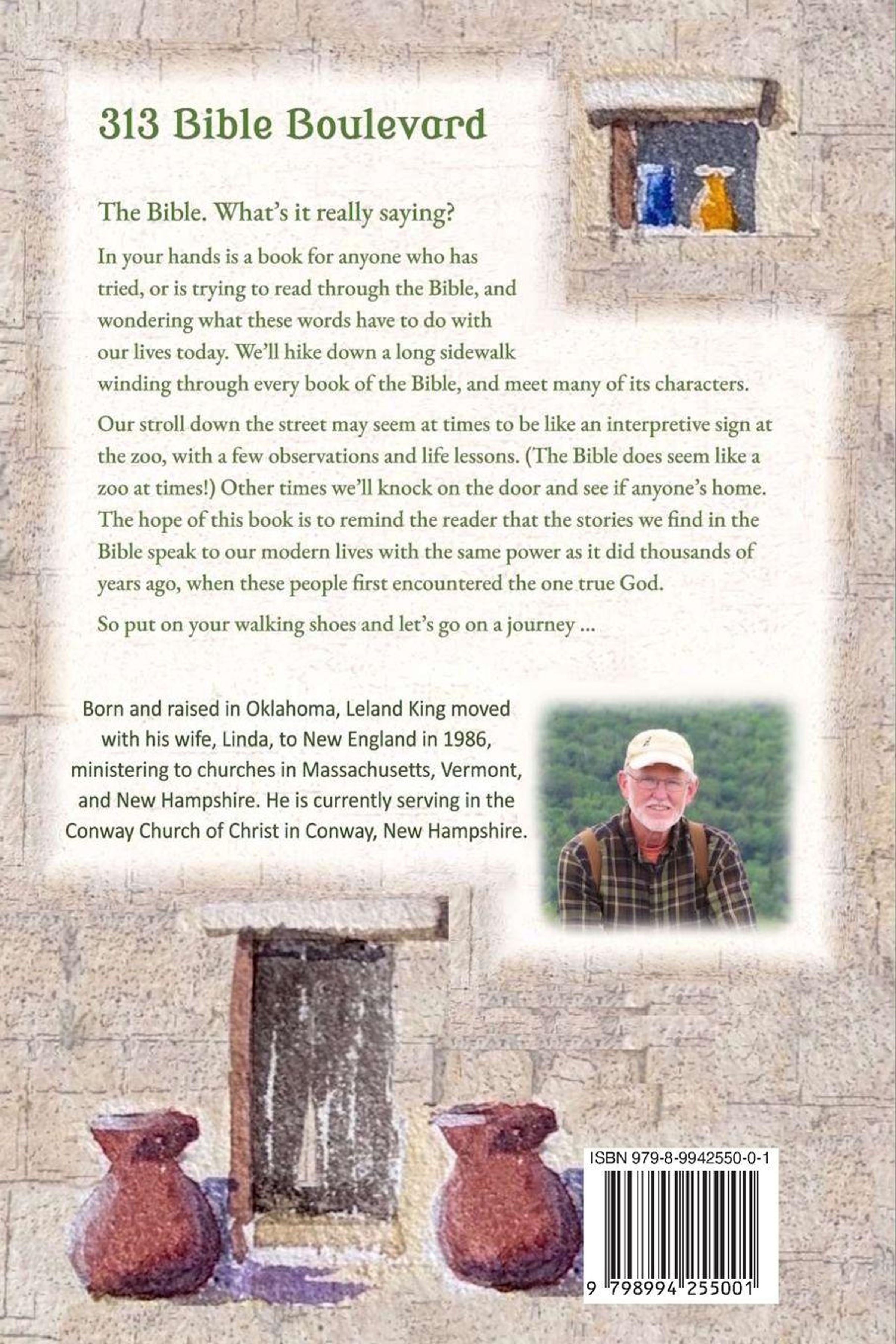 "313 Bible Boulevard. The Bible. What’s it really saying? Born and raised in Oklahoma, Leland King moved..." Illustration: Steinwand mit Fenstern und Krügen., Buch