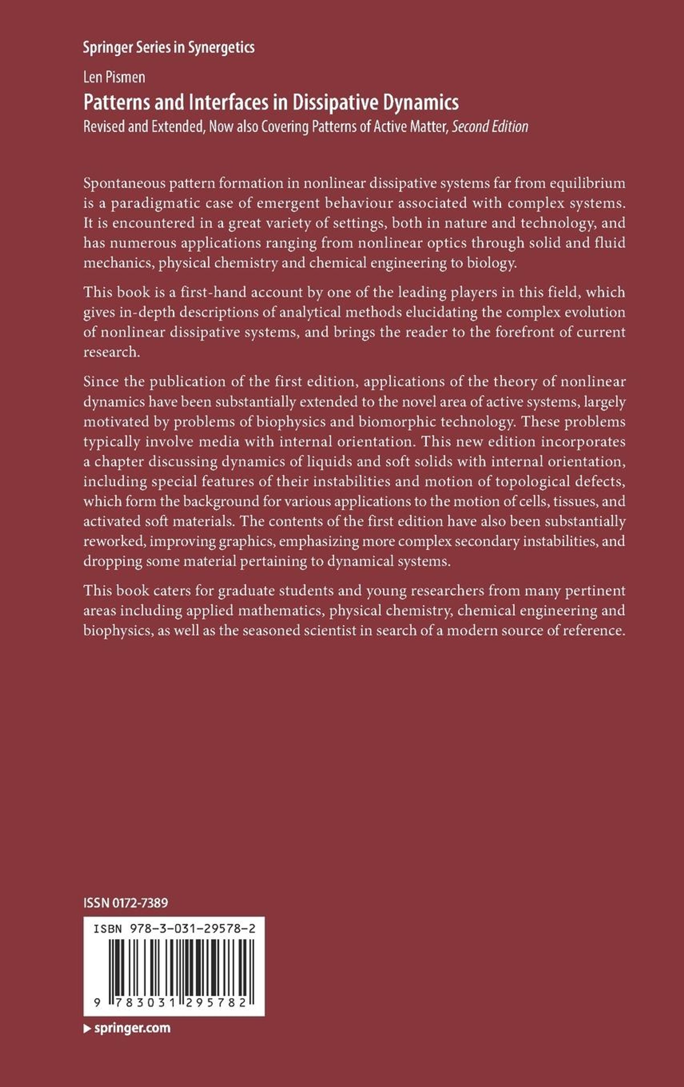 Spontaneous pattern formation in nonlinear dissipative systems far from equilibrium is a paradigmatic case of emergent behaviour associated with complex systems. It is encountered in a great variety of settings, both in nature and technology, and has numerous applications ranging from nonlinear optics through solid and fluid mechanics, physical chemistry and chemical engineering to biology. This book is a first-hand account by one of the leading players in this field, which gives in-depth descriptions of analytical methods elucidating the complex evolution of nonlinear dissipative systems, and brings the reader to the forefront of current research. Since the publication of the first edition, applications of the theory of nonlinear dynamics have been substantially extended to the novel area of active systems, largely motivated by problems of biophysics and biomorphic technology. These problems typically involve media with internal orientation. This new edition incorporates a chapter discussing dynamics of liquids and soft solids with internal orientation, including special features of their instabilities and motion of topological defects, which form the background for various applications to the motion of cells, tissues, and activated soft materials. The contents of the first edition have also been substantially reworked, improving graphics, emphasizing more complex secondary instabilities, and dropping some material pertaining to dynamical systems. This book caters for graduate students and young researchers from many pertinent areas including applied mathematics, physical chemistry, chemical engineering and biophysics, as well as the seasoned scientist in search of a modern source of reference.