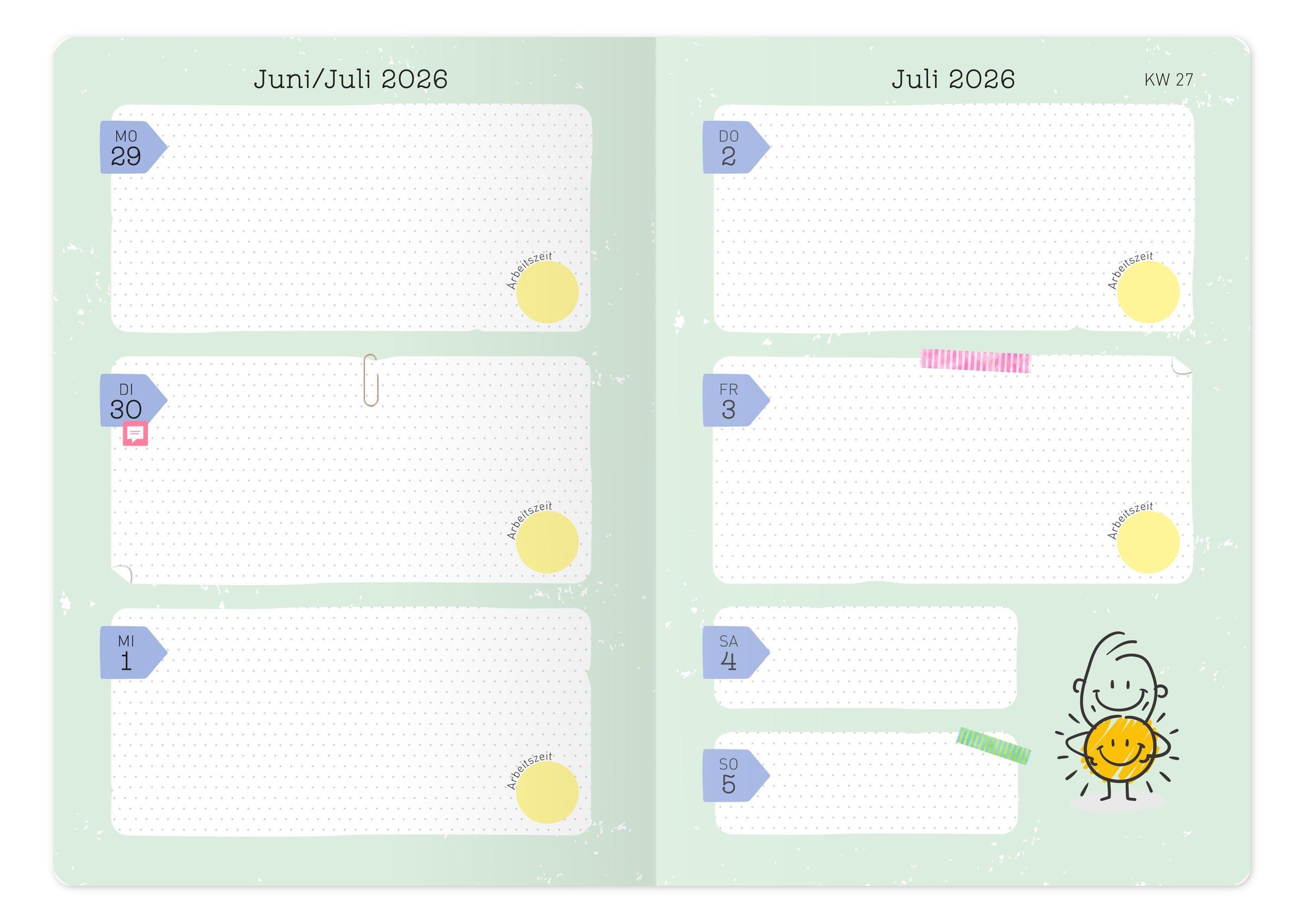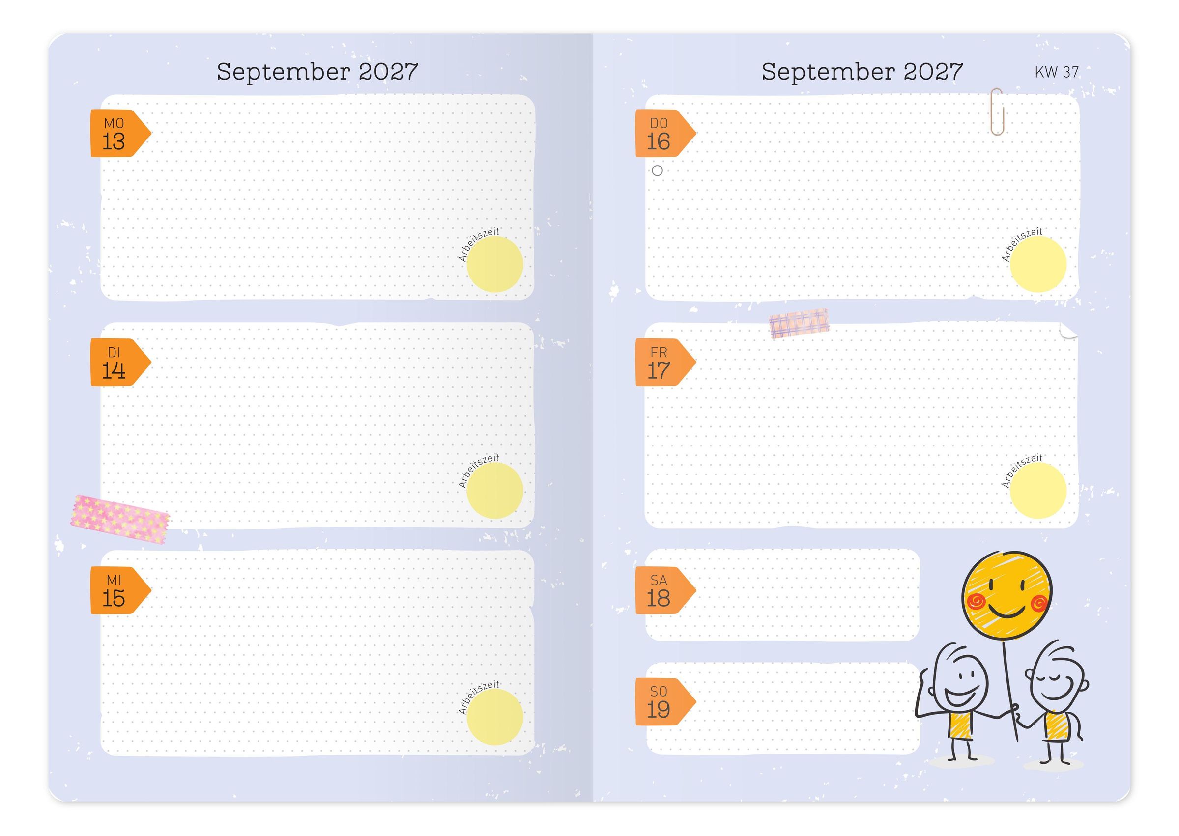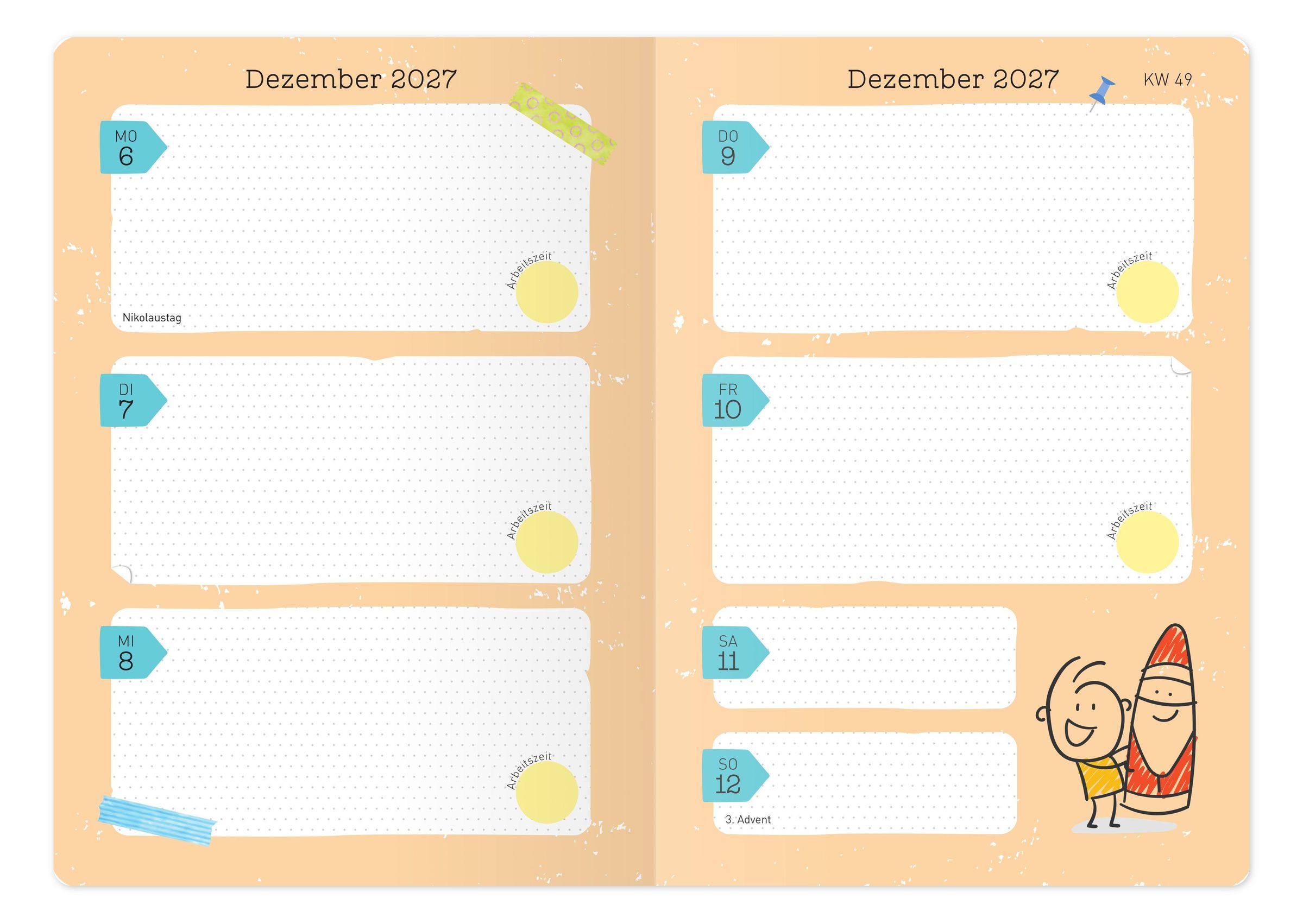 Mit diesem handlichen Terminplaner behalten Erzieherinnen, Tagesmütter und Pädagoginnen jederzeit den Überblick über den Kita-Alltag. Das übersichtliche Kalendarium von Juli 2026 bis Dezember 2027 bietet Platz für alle wichtigen Termine, Notizen und Eintragungen. Zudem hält der Planer viele praktische Infos und Inspirationen bereit, die den Alltag im Kindergarten oder der Kita erleichtern. Jeden Monat finden Sie kleine Entspannungsideen, die helfen, Ruhepausen bewusst zu gestalten.