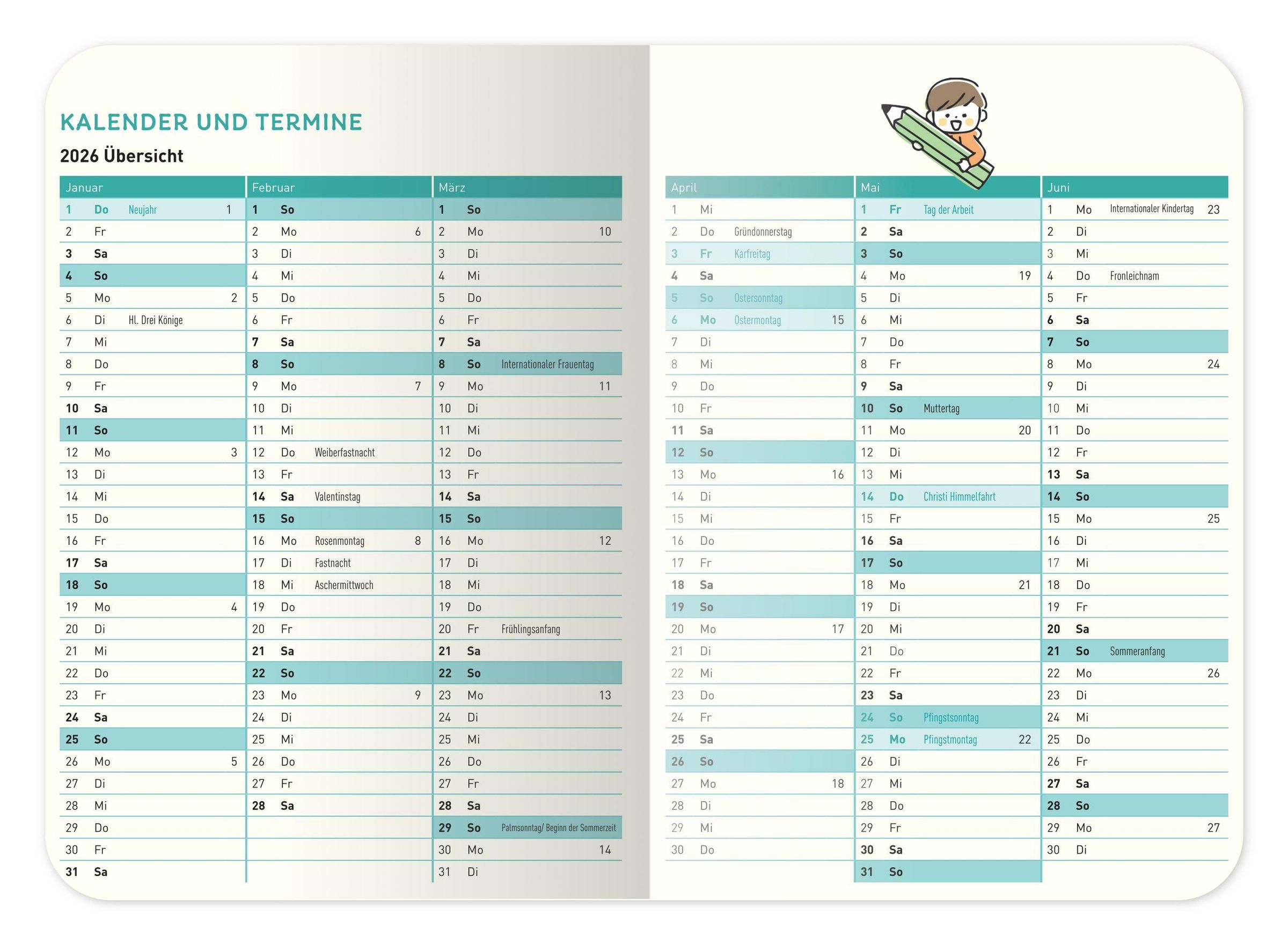 Dieser handliche Kalender ist mehr als nur ein Planer: Er ist ein wertvoller Begleiter durch den Kita- und Kindergartenalltag. Mit einem übersichtlichen Kalendarium von Juli 2026 bis Dezember 2027 bietet er viel Platz für Termine, Notizen und wichtige Einträge. Gleichzeitig steckt er voller nützlicher Infos und kreativer Ideen, die den Alltag leichter machen und bereichern.