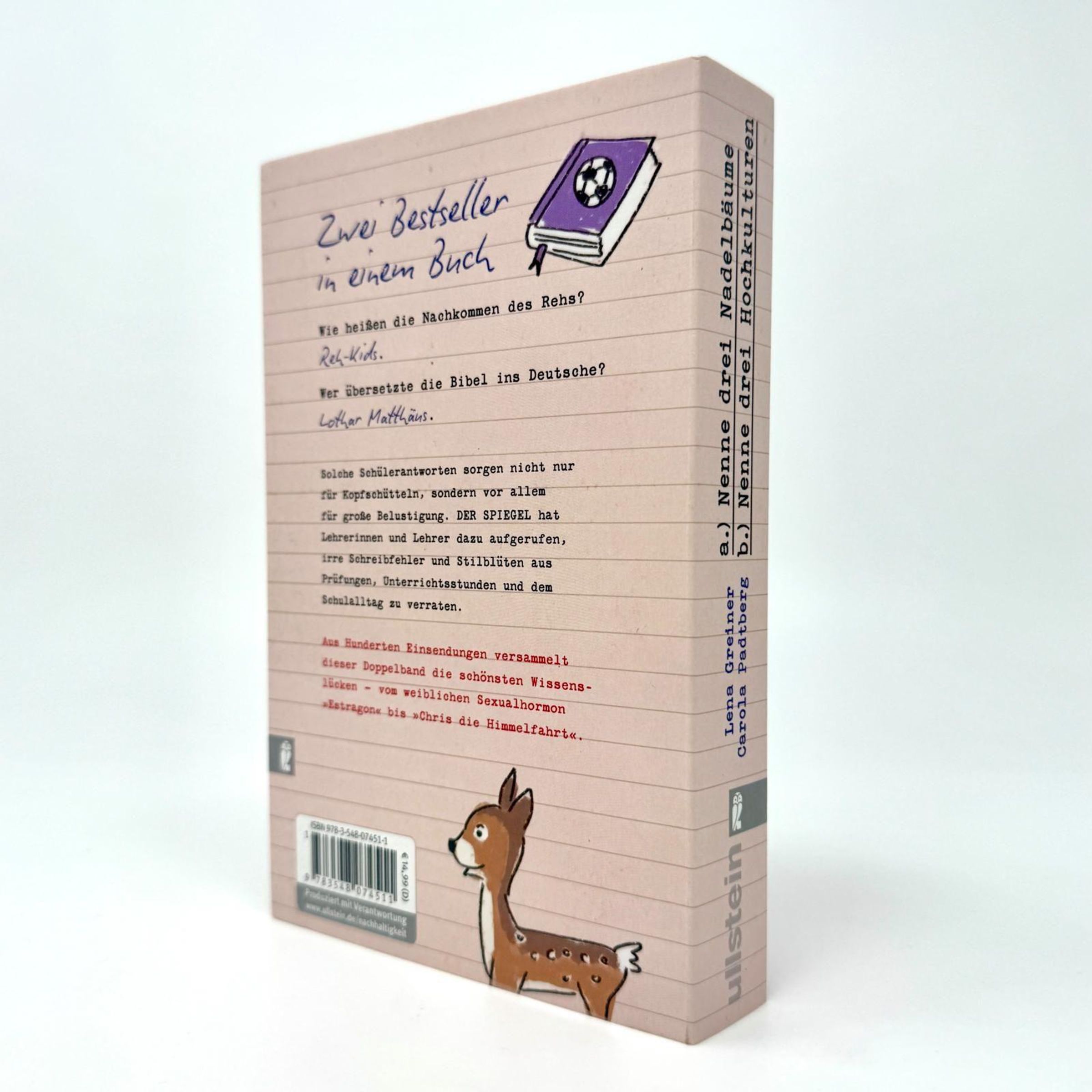 Wie heißen die Nachkommen des Rehs? Reh-Kids. Wer übersetzte die Bibel ins Deutsche? Lothar Matthäus. Solche Schülerantworten sorgen nicht nur für Kopfschütteln, sondern vor allem für große Belustigung. DER SPIEGEL hat Lehrerinnen und Lehrer dazu aufgerufen, irre Schreibfehler und Stilblüten aus Prüfungen, Unterrichtsstunden und dem Schulalltag zu verraten. Aus Hunderten Einsendungen versammelt dieser Doppelband die schönsten Wissenslücken - vom weiblichen Sexualhormon "Estragon" bis "Chris die Himmelfahrt".