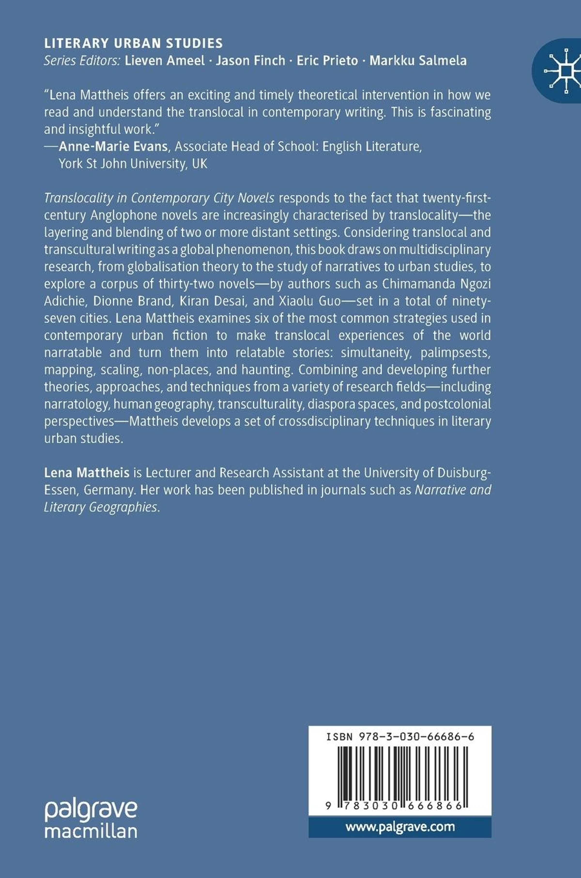 Translocality in Contemporary City Novels responds to the fact that twenty-first-century Anglophone novels are increasingly characterised by translocality¿the layering and blending of two or more distant settings. Considering translocal and transcultural writing as a global phenomenon, this book draws on multidisciplinary research, from globalisation theory to the study of narratives to urban studies, to explore a corpus of thirty-two novels¿by authors such as Chimamanda Ngozi Adichie, Dionne Brand, Kiran Desai, and Xiaolu Guöset in a total of ninety-seven cities. Lena Mattheis examines six of the most common strategies used in contemporary urban fiction to make translocal experiences of the world narratable and turn them into relatable stories: simultaneity, palimpsests, mapping, scaling, non-places, and haunting. Combining and developing further theories, approaches, and techniques from a variety of research fields¿including narratology, human geography, transculturality, diaspora spaces, and postcolonial perspectives¿Mattheis develops a set of cross-disciplinary techniques in literary urban studies.