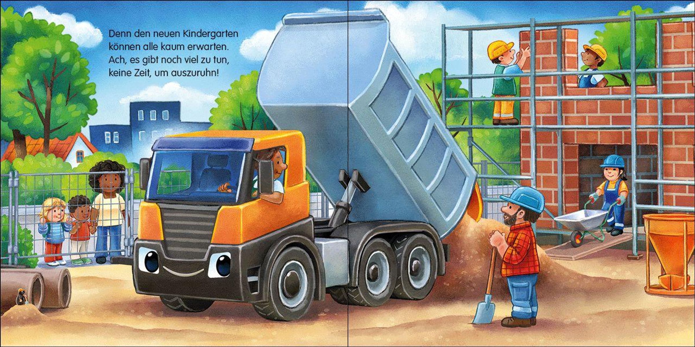 Illustration: Großer orangefarbener Lastwagen auf nächtlicher Baustelle, Mond und Sterne im Hintergrund., Buch