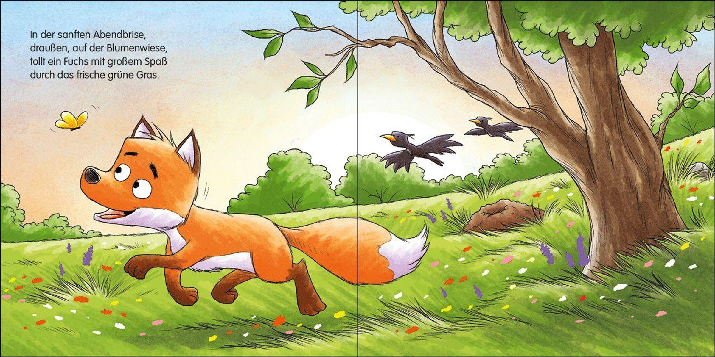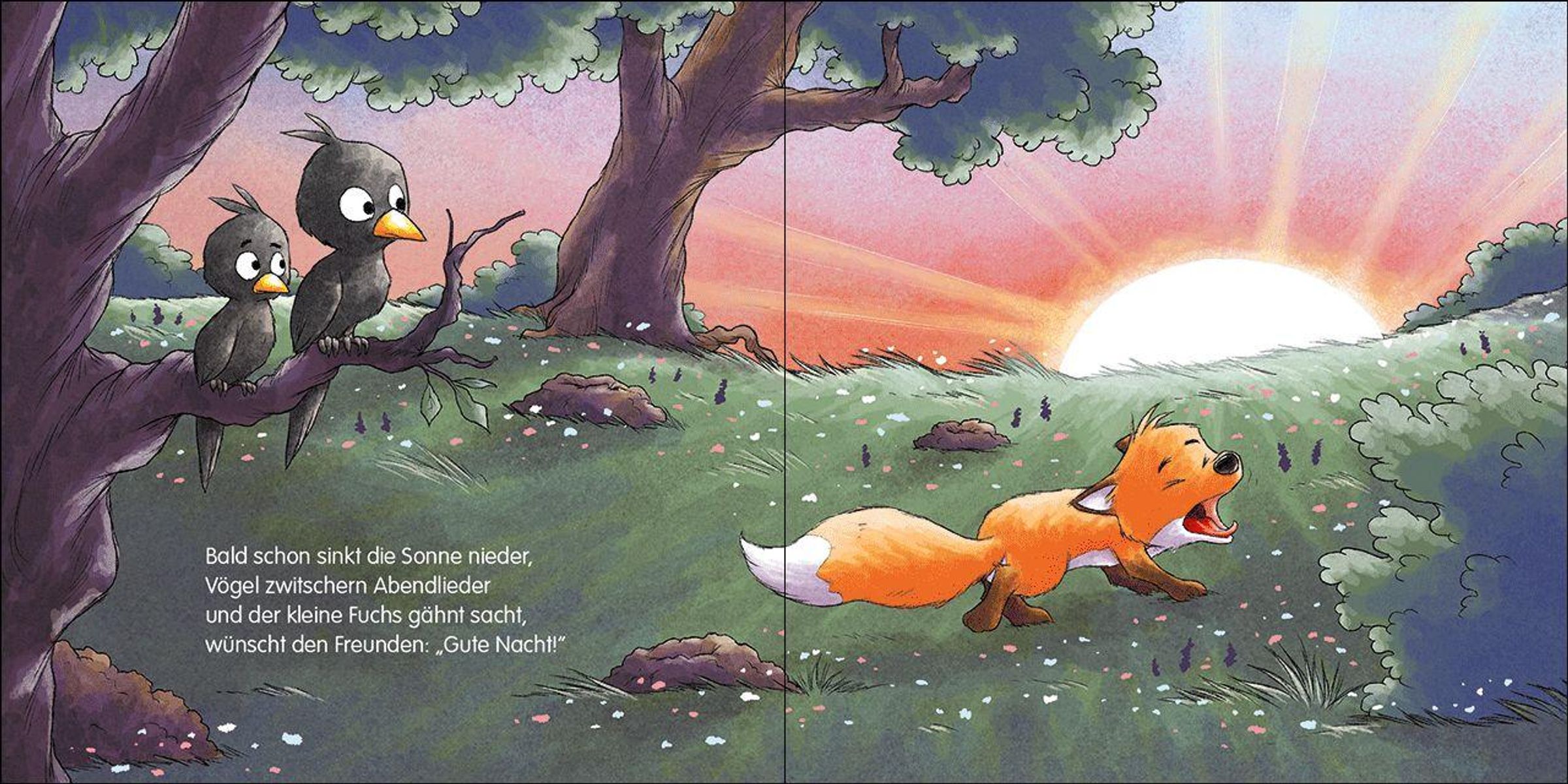 "Gute Nacht, liebe Tierkinder!" Ein Fuchs liegt im Gras unter einem Nachthimmel mit Mond. Tiere schlafen in einem Baum., Buch