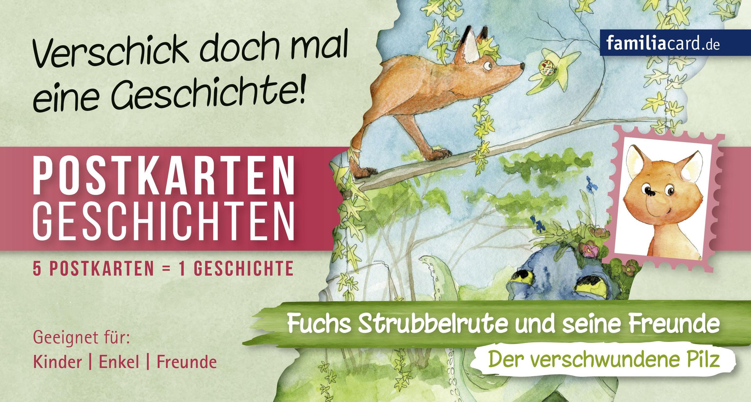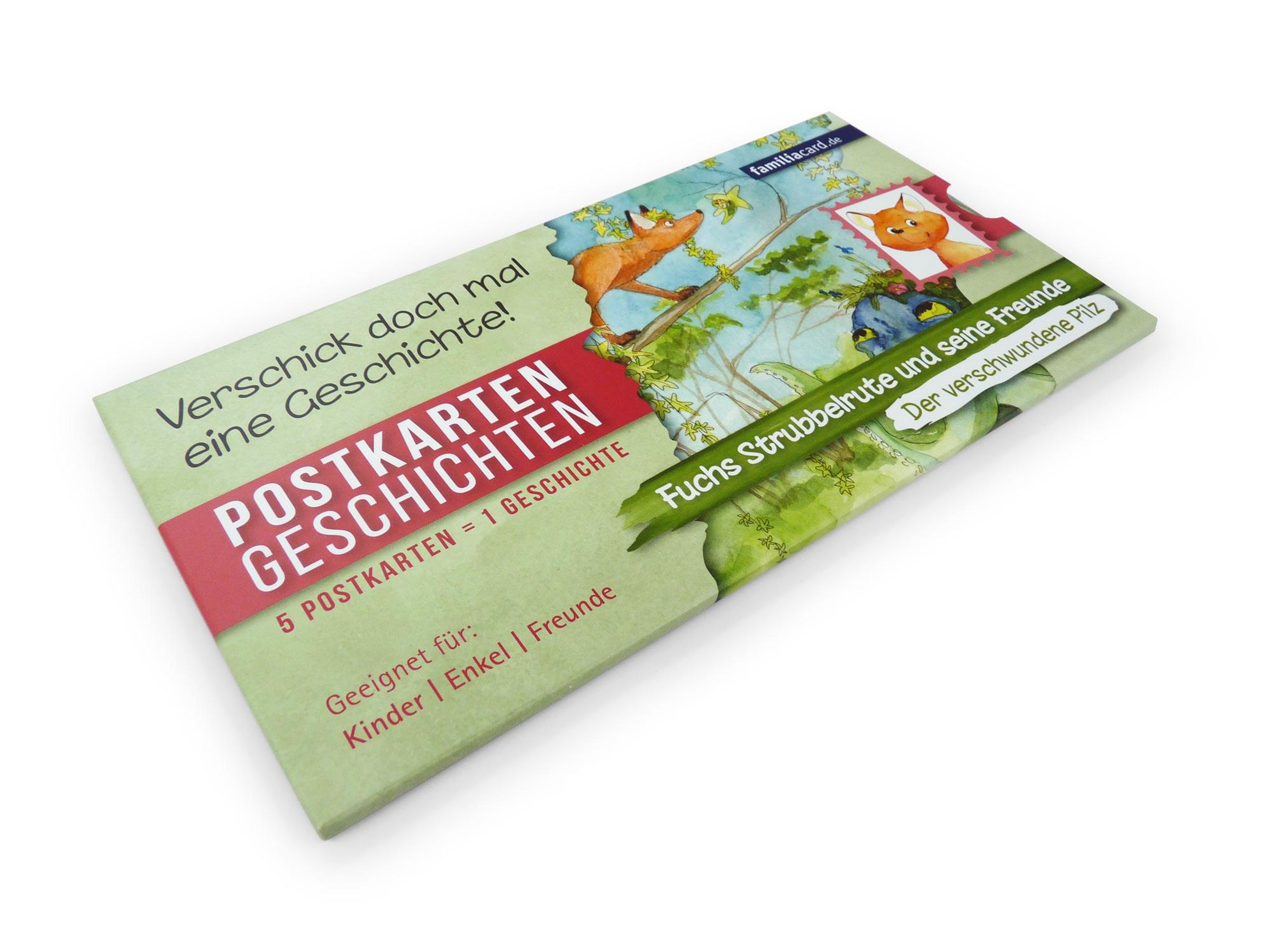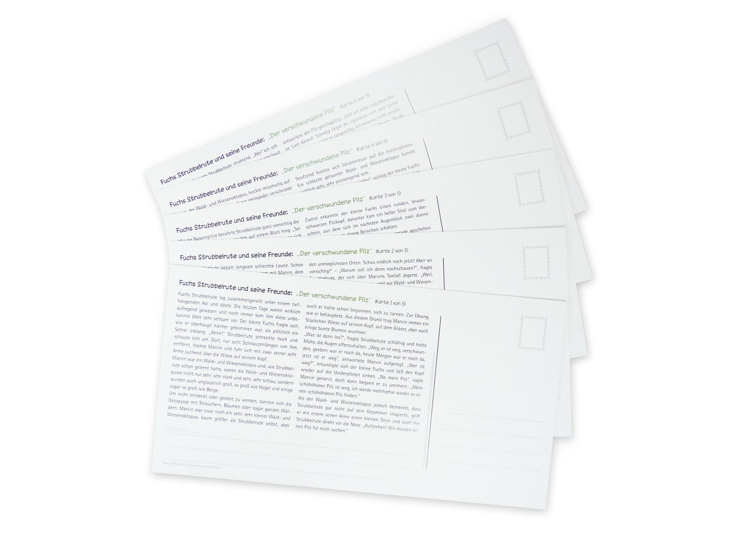 Liebe Grüße ¿ handgeschrieben auf Papier ¿ versus Chats, Emojis und Tweets Wie wäre es hiermit: Grüßt Eure Lieben mit 5 fantasievoll illustrierten Postkarten, die ein Abenteuer aus Fuchs Strubbelrutes Welt erzählen. Seine Abenteuer sind nun ganz originell als Postkartengeschichten erhältlich, denn schöne Geschichten müssen nicht immer Buchform daherkommen. Begebt euch gemeinsam mit dem quirligen Fuchs, seinem neuen Freund, dem Wald- und Wiesenoktopus, und weiteren Tieren, auf eine spannende Entdeckungsreise. Jedes Set ist einerseits kindgerechte Vorlesegeschichte, andererseits ein wunderbares Geschenk, z. B. für liebe Freunde und Verwandte. Mit den mittlerweile 4 erhältlichen Postkartensätzen begeistert Strubbelrute seine großen und kleinen Fans.