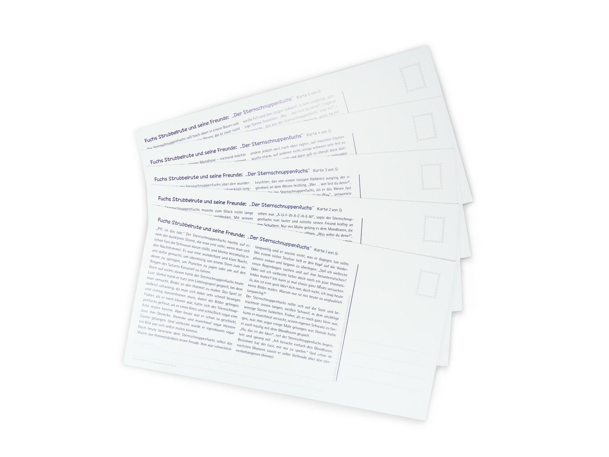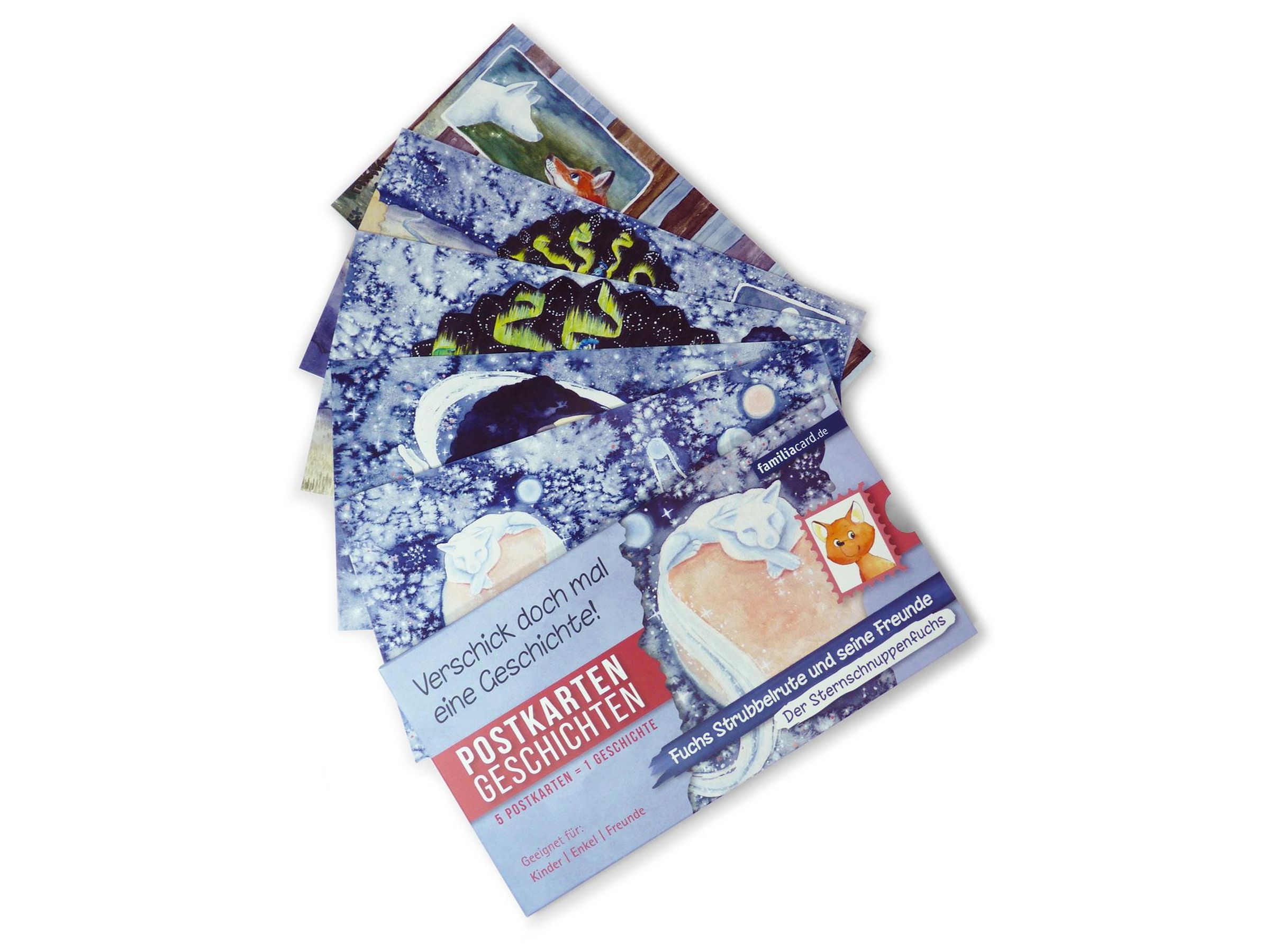 Liebe Grüße ¿ handgeschrieben auf Papier ¿ versus Chats, Emojis und Tweets Wie wäre es hiermit: Grüßt Eure Lieben mit 5 fantasievoll illustrierten Postkarten, die ein Abenteuer aus Fuchs Strubbelrutes Welt erzählen. Seine Abenteuer sind nun ganz originell als Postkartengeschichten erhältlich, denn schöne Geschichten müssen nicht immer Buchform daherkommen. Begebt euch gemeinsam mit dem quirligen Fuchs, seinem neuen Freund, dem Wald- und Wiesenoktopus, und weiteren Tieren, auf eine spannende Entdeckungsreise. Jedes Set ist einerseits kindgerechte Vorlesegeschichte, andererseits ein wunderbares Geschenk, z. B. für liebe Freunde und Verwandte. Mit den mittlerweile 4 erhältlichen Postkartensätzen begeistert Strubbelrute seine großen und kleinen Fans.