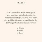 Hunde sind seit Urzeiten treue Begleiter der Menschen, und auch heute können sich viele ein Leben ohne vierbeinige Freunde kaum vorstellen. Vom Dackel bis zum Dalmatiner, vom Mops bis zum Jack Russell, vom Mischling bis zum Rassehund - das lustige Quiz rund um die unwiderstehlichen Lieblinge erzählt ihre Geschichte und ihre Geschichten, weiß alles über ihre Eigenarten und hat auch so manch verblüffenden Erziehungstipp auf Lager. Hier schmilzt garantiert jedes Hunde-Herz!
