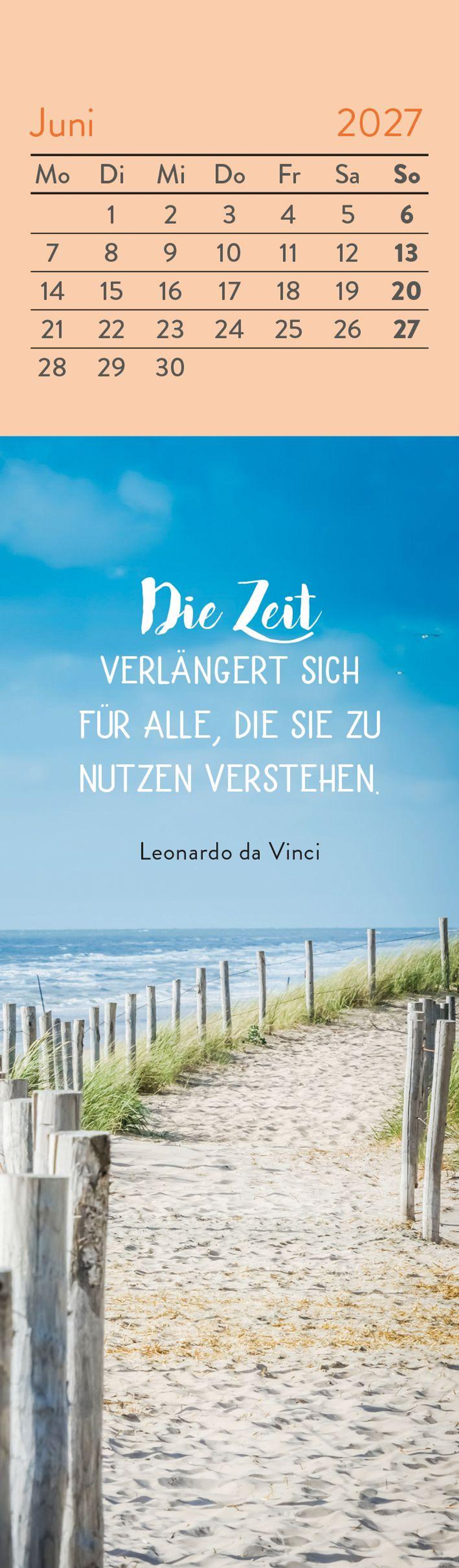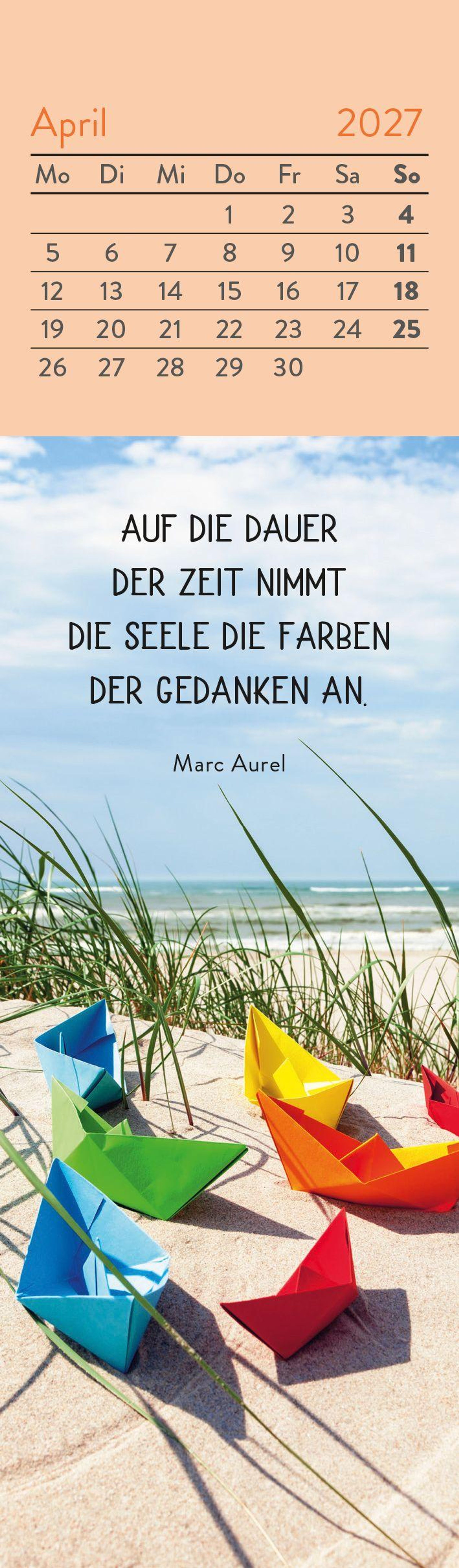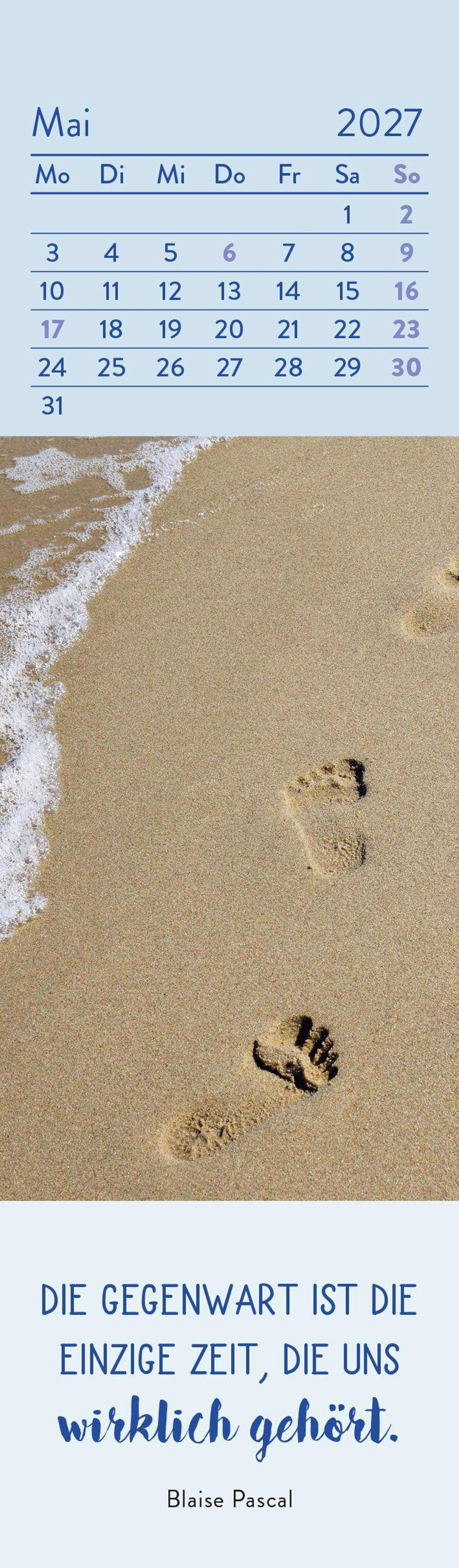Der Lesezeichenkalender Ein wenig Zeit für dich 2027 lädt mit zwölf stimmungsvollen Fotos vom Meer und entspannten Zitaten zum Träumen ein. Nach Ablauf des Monats werden die stabilen Seiten einfach abgetrennt und als Lesezeichen weiterverwendet. Der kleine Monatskalender mit maritimen Motiven kann für das Jahr 2027 als Wandkalender oder als Tischkalender zum Aufstellen genutzt werden. Dank des schmalen Formats findet er überall ein Plätzchen und eignet sich wunderbar als Mitbringsel im Advent oder als Wichtel-Geschenk.