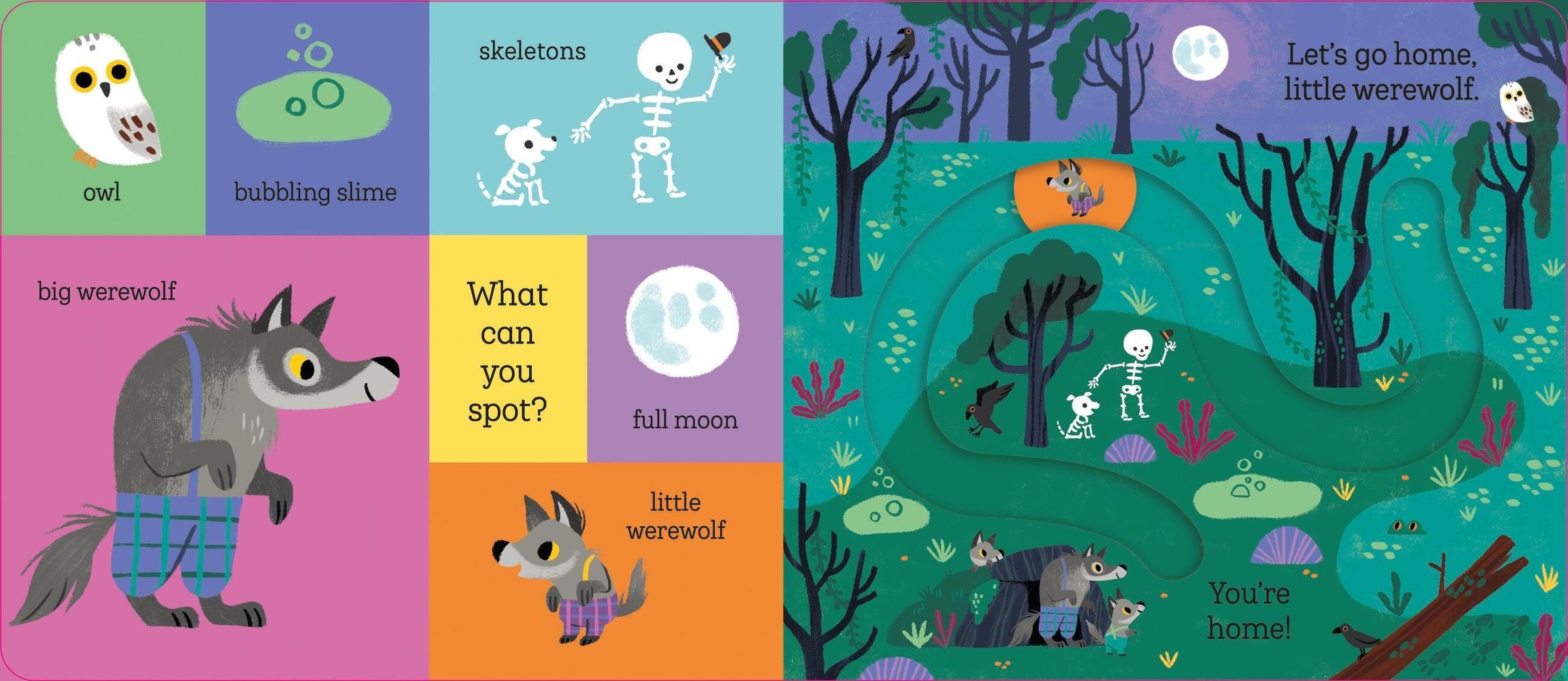 Help four little ghouls and goblins find their way home on Halloween in the newest book in this fun moving slider series!
