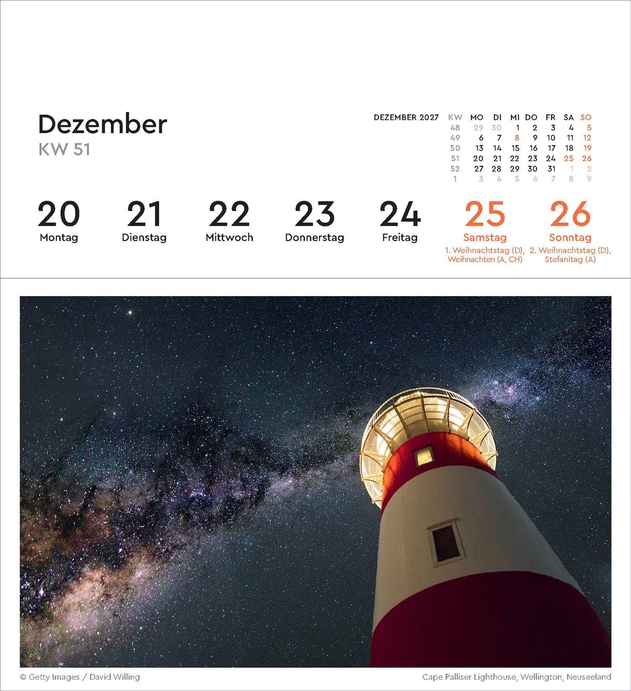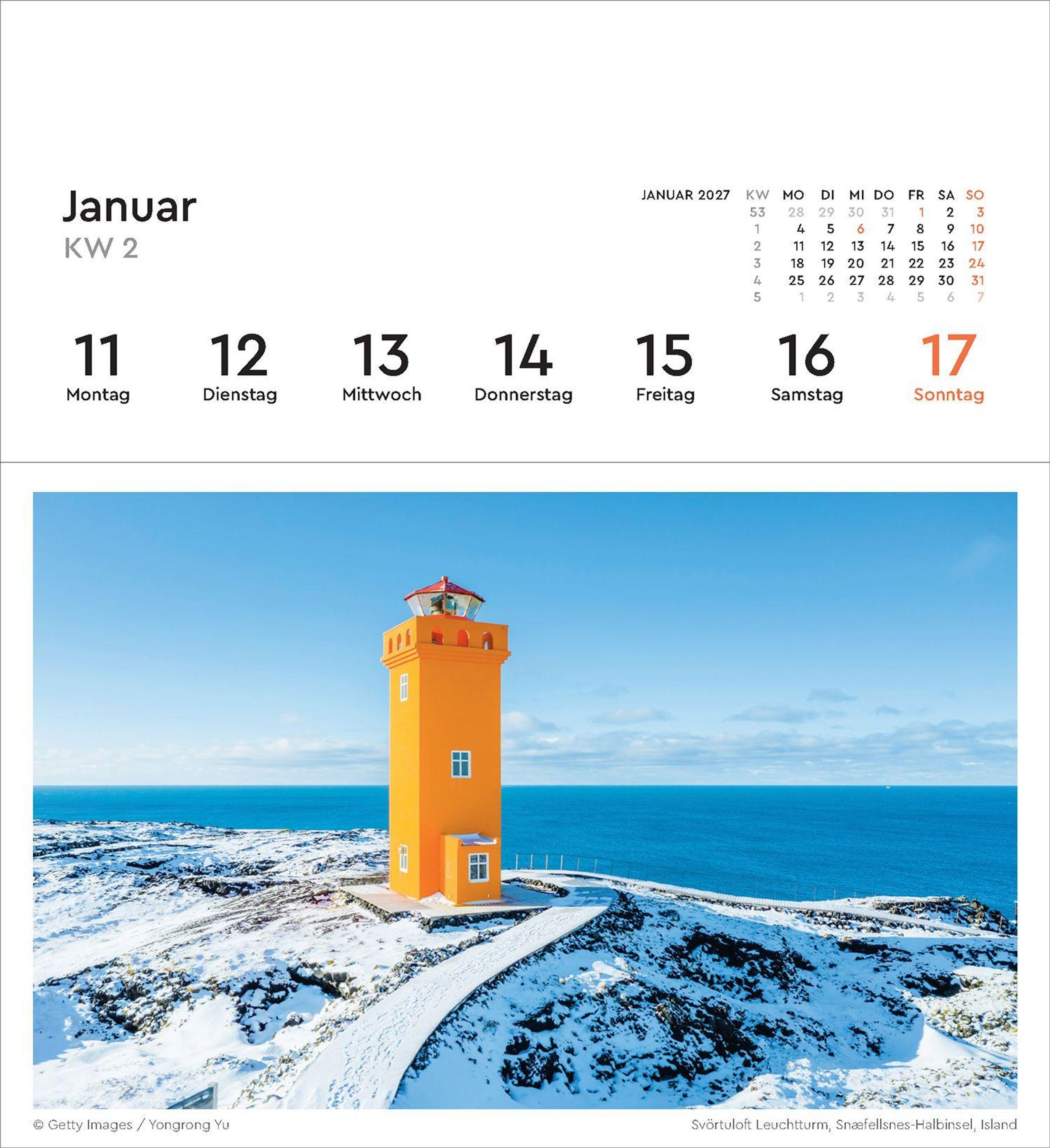 Woche um Woche begleitet dieser KUNTH Postkartenkalender "Leuchttürme" 2027 mit atemberaubenden Bildern durch das Jahr - auf dem Schreibtisch oder als Hingucker an der Wand. Die Grußkarten zum Herauslösen können dann gesammelt oder versendet werden, oder als liebevolle Ergänzung zu einem Geschenk dienen. Rund um die Welt weisen seit Jahrhunderten Leuchttürme den Schiffen ihren Weg und halten selbst gegen die Wellen der sturmgepeitschten See stand. Nicht nur ihre Symbolkraft, auch die teils exponierte Lage oder architektonische Harmonie machen sie heute noch zu einem beliebten Motiv.