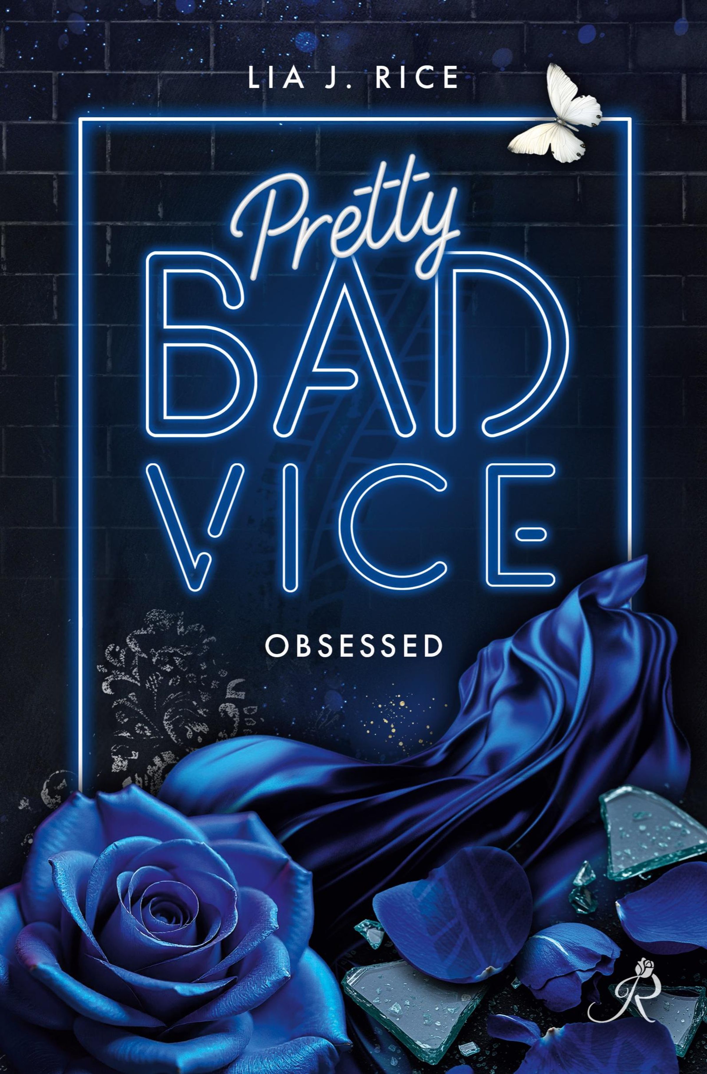"Pretty Bad Vice: OBSESSED. Lia J. Rice." Eine blaue Rose, zerbrochenes Glas, blaue Stoffbahn und ein weißer Schmetterling., Buch