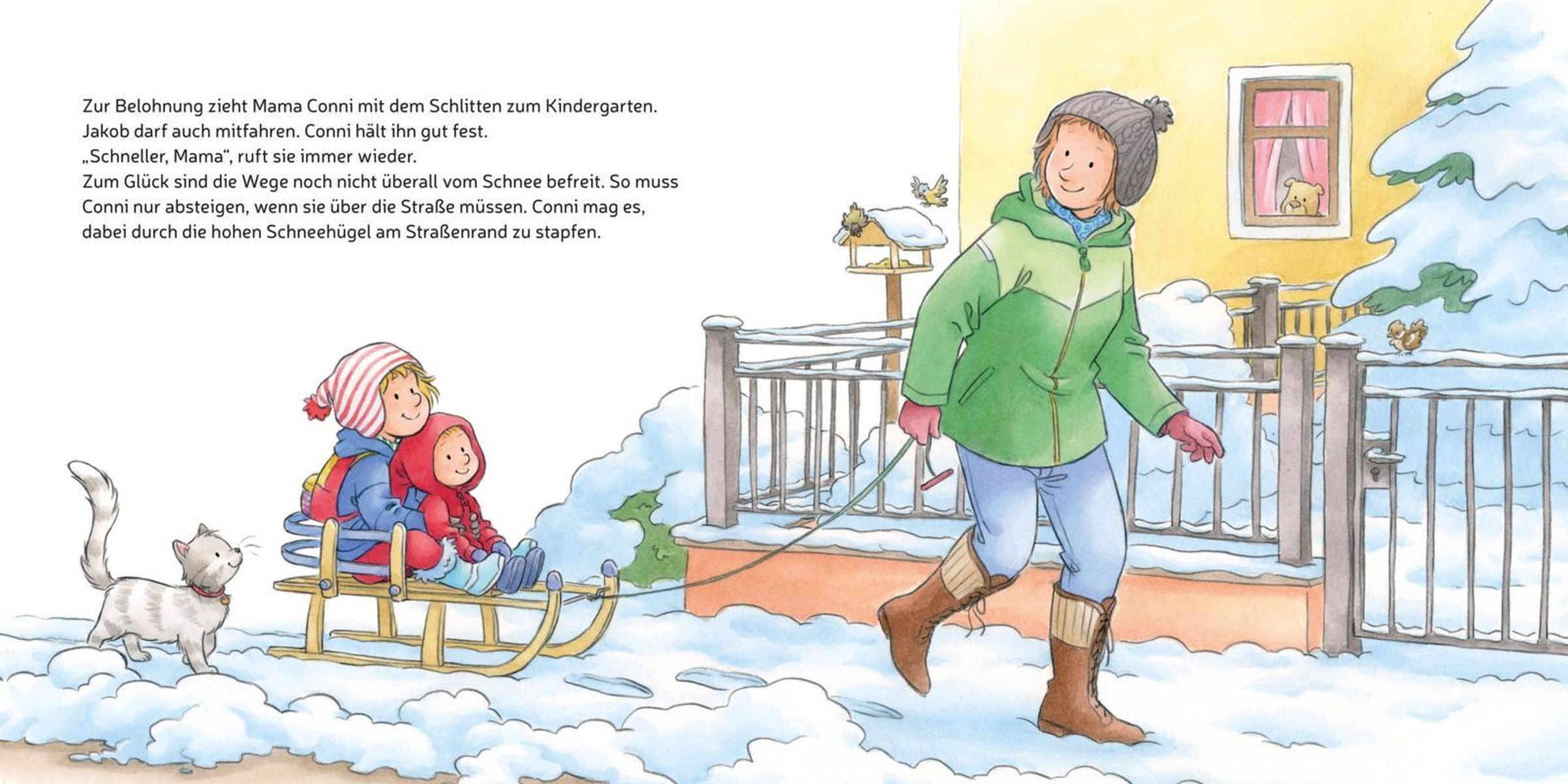 Als Conni aus dem Fenster schaut, traut sie ihren Augen kaum. Es hat geschneit! Schnell zieht sie Mütze, Schal und Handschuh an und dann ab nach draußen. Was man da alles machen kann: einen Schneemann bauen, mit dem Schlitten zum Kindergarten fahren, rodeln gehen und natürlich eine Schneeballschlacht. Klar, dass Conni findet: So macht der Winter Spaß!