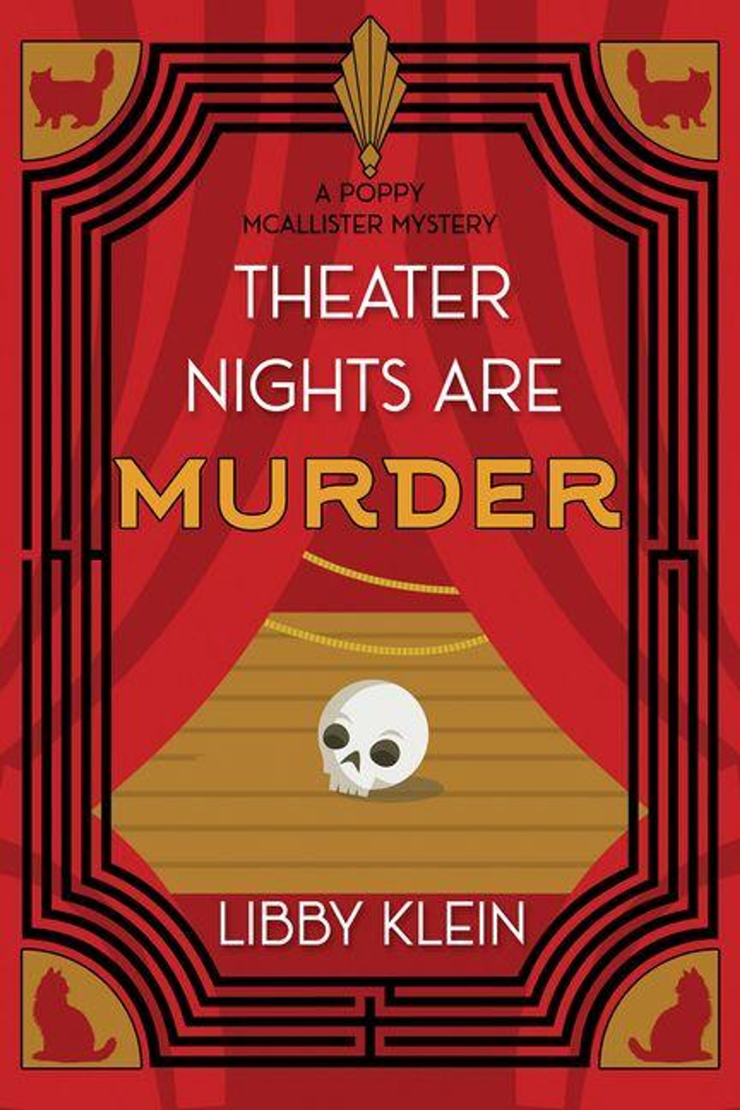 Der Text lautet: "A Poppy McAllister Mystery, Theater Nights Are Murder, Libby Klein." Ein Schädel liegt auf einer Theaterbühne., Buch