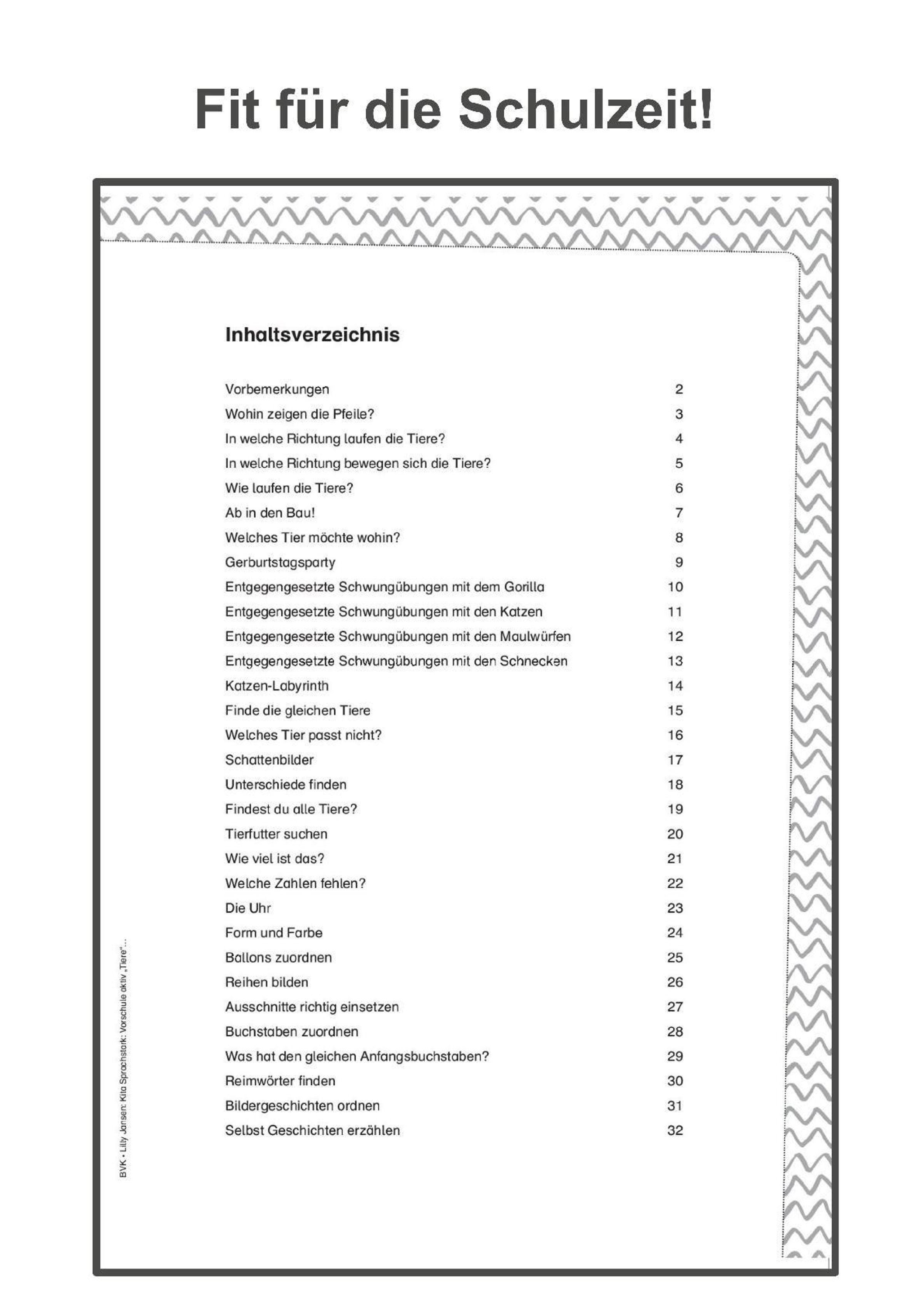 Aus dem Inhalt: In welche Richtung laufen die Tiere? - Entgegengesetzte Schwungübungen - Wie viel ist das? - Labyrinth - Schattenbilder - Erkenne die Kategorie - Welche Zahlen fehlen? - Die Uhr - Form und Farbe - Buchstaben zuordnen - Reihen bilden - Bildergeschichten ordnen ...