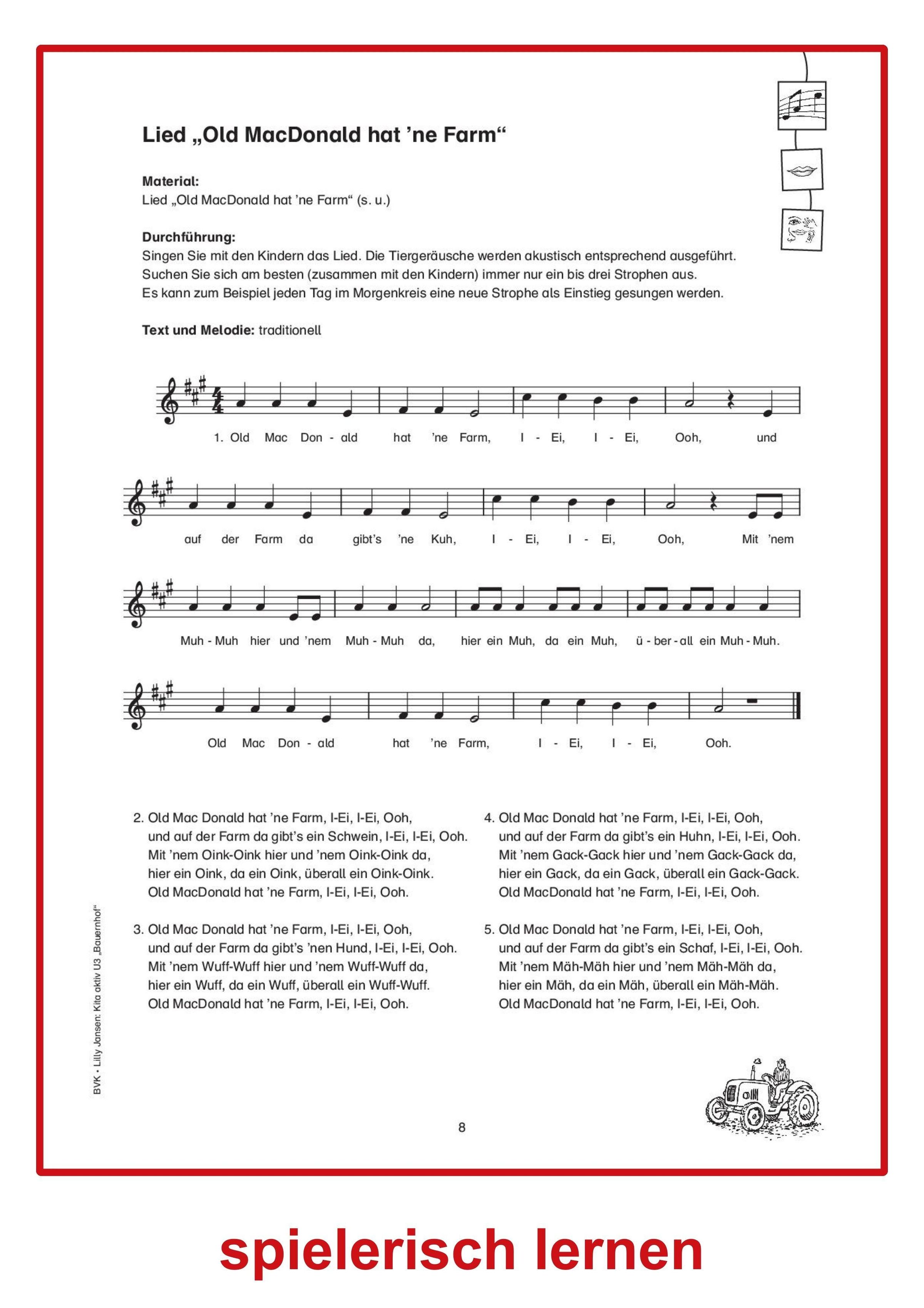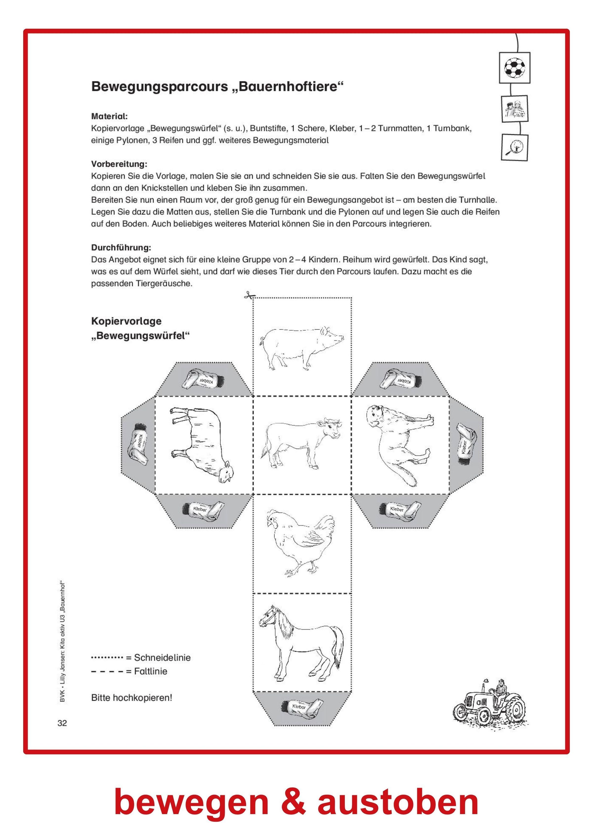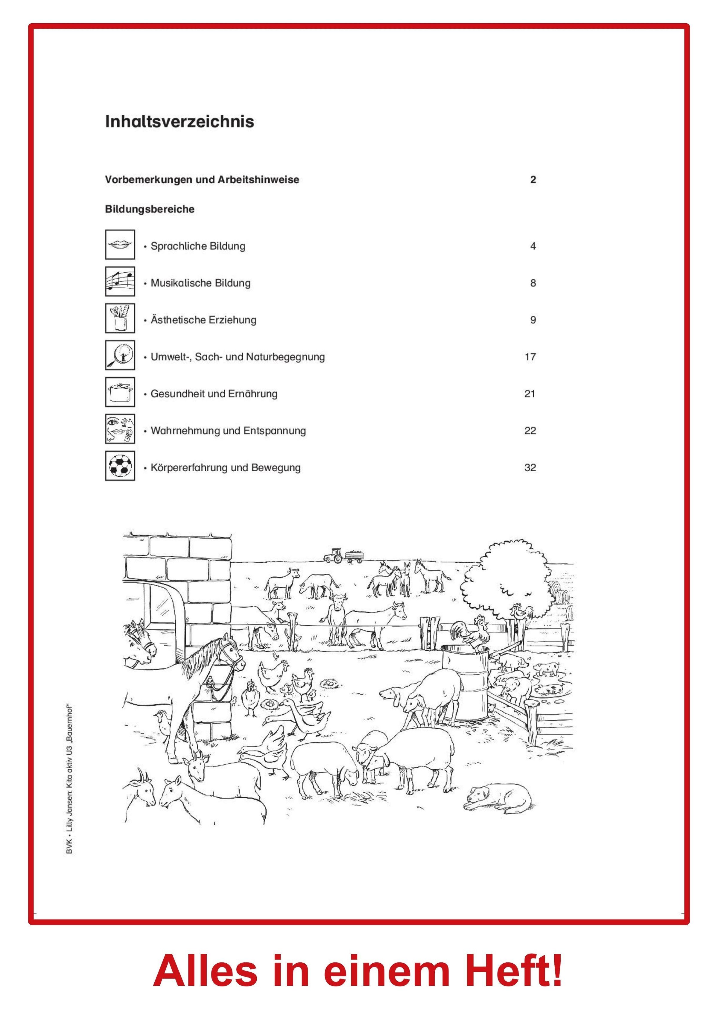 Aus dem Inhalt: Einführungsgeschichte "Ein Tag auf dem Bauernhof" - Eier pusten - Ein Schaf basteln - Zuordnungsspiel "Von welchem Tier ist was?" - Welches Tier gehört auf den Bauernhof? - Tiere tasten im Heu und im Stroh - Aktionswanne: Bauernhoffahrzeuge - Kugelbahn im Hühnerstall - Bewegungsparcours "Bauernhoftiere" ...