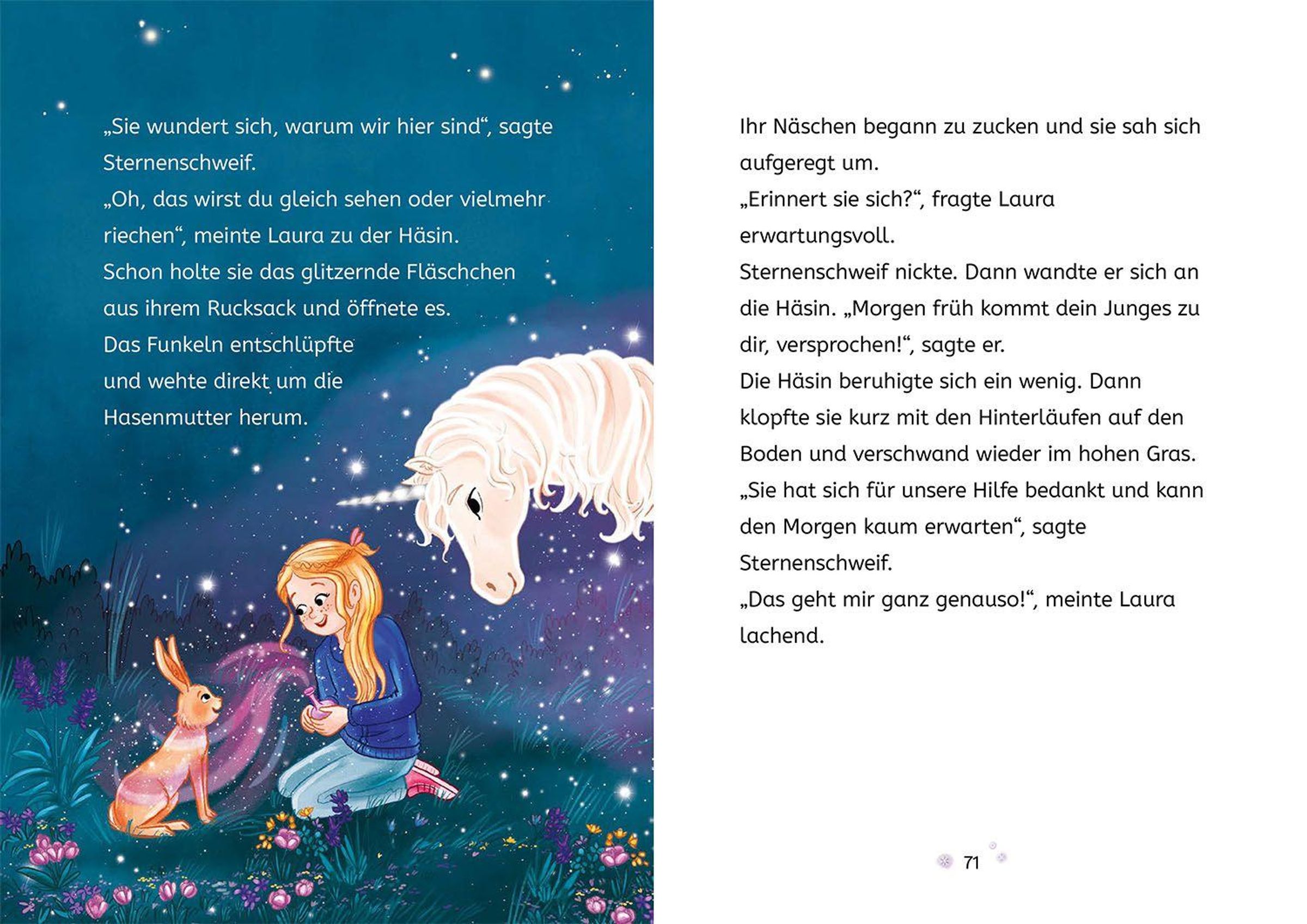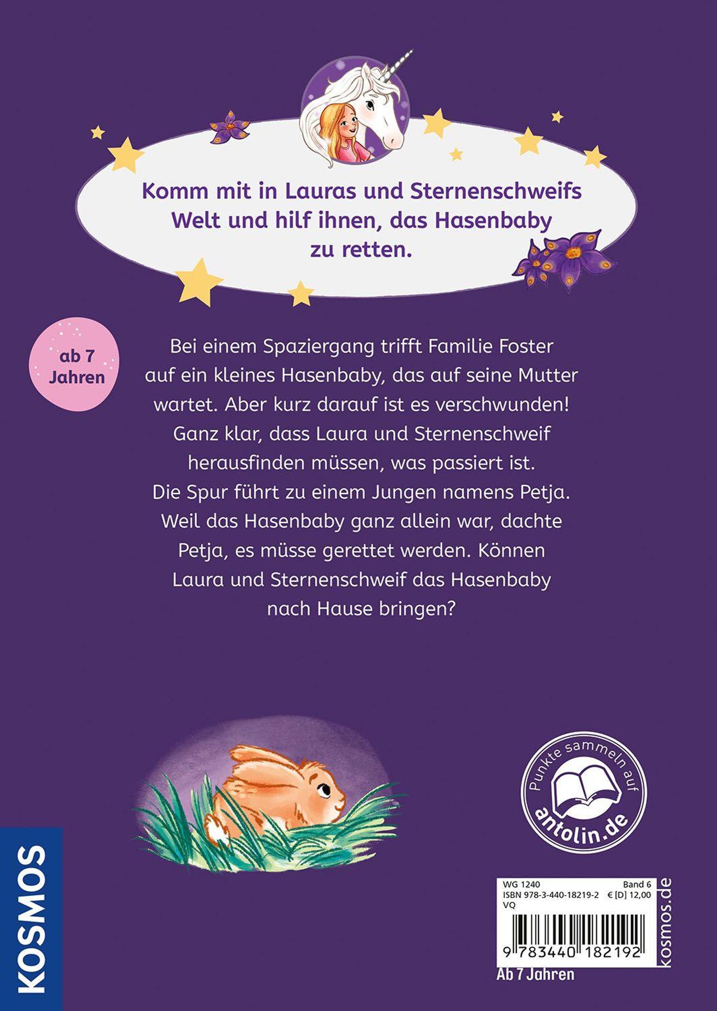 Bei einem Spaziergang entdeckt Laura gemeinsam mit ihrer Familie ein kleines Hasenbaby. Ganz allein sitzt es im Gras und wartet auf seine Mutter. Doch wenig später ist es plötzlich verschwunden. Zum Glück sind Laura und ihr Einhorn Sternenschweif zur Stelle. Die Spur führt zu einem Jungen, der das Häschen mitnehmen wollte, um ihm zu helfen. Doch nun ist das Hasenbaby in Gefahr, denn Wildtiere erkennen ihre Jungen oft nicht wieder, wenn sie von Menschen berührt wurden. Mit Unterstützung der Försterin und einem besonderen Zauber setzen Laura und Sternenschweif alles daran, Mutter und Kind wieder zu vereinen. Eine magische Einhorn-Geschichte zum Träumen für Kinder ab sieben Jahren - leicht lesbar durch Fibelschrift und mit liebevoll gestalteten, farbigen Illustrationen.