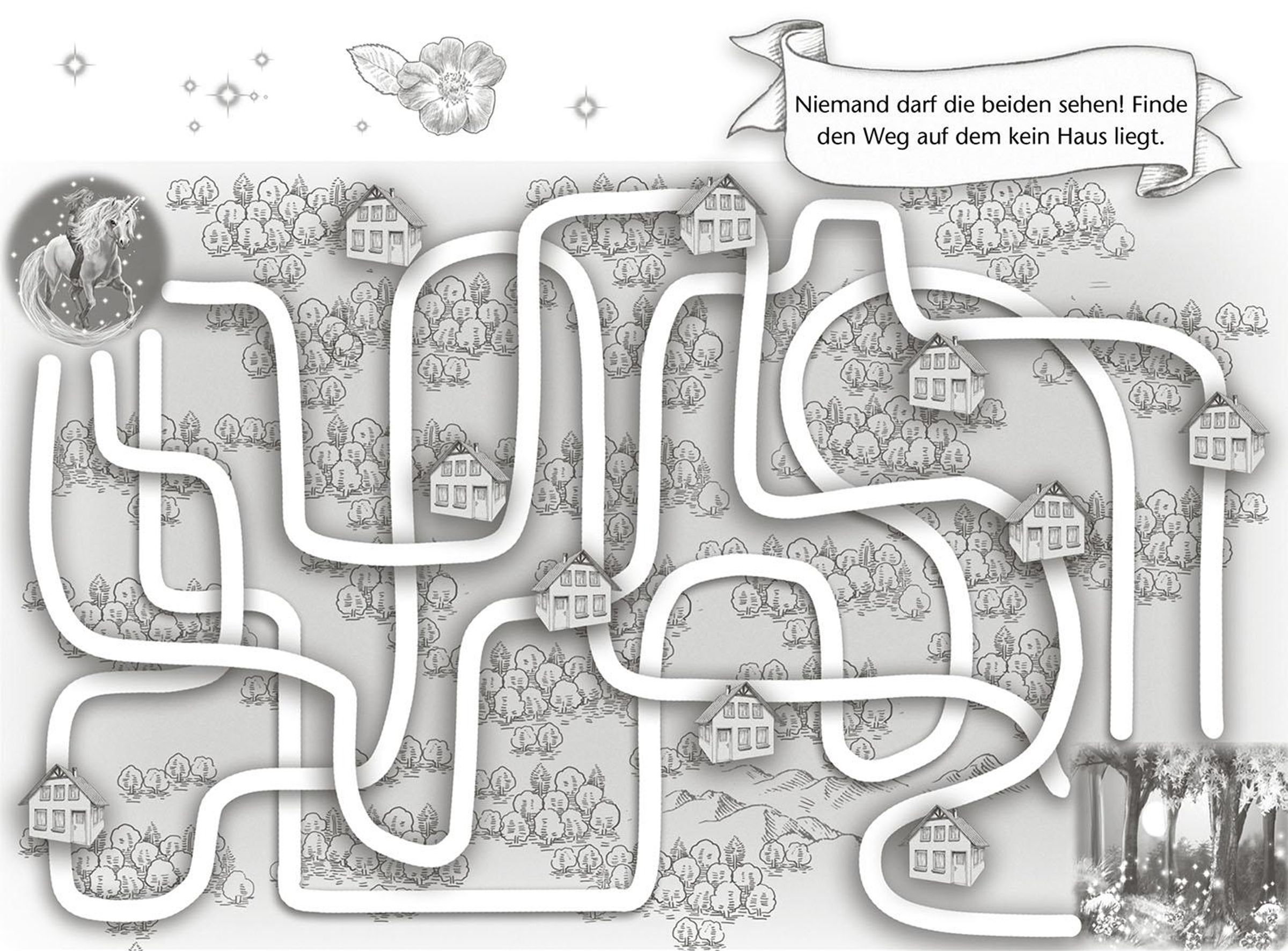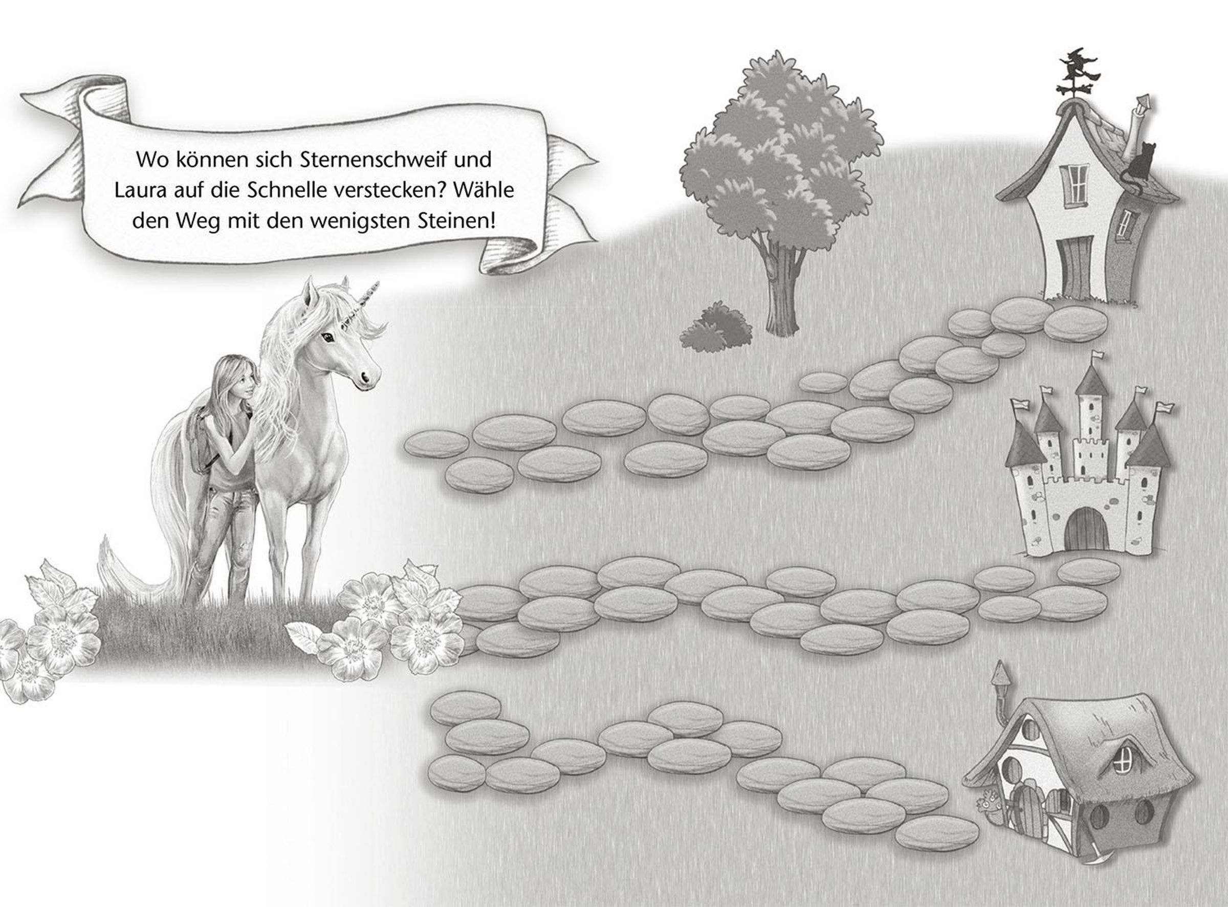 Ein altes, leeres Eintragbuch aus dem Trödelladen fängt plötzlich an, Laura Rätsel zu stellen und Anleitungen zu geben. Bald stellt sich heraus: Es ist ein magischer Auftrag der Ältesten aus Arkadia. Er führt Laura und Sternenschweif zu einem geheimnisvollen, unbeschreiblich schönen Pony, das in einem Märchenpark hinter hohen Mauern lebt. Die beiden möchten das Pony befreien, doch dazu brauchen sie die Hilfe ihrer kleinen Leserinnen. Nur gemeinsam mit ihnen können sie die Rätsel lösen, die hinter den verschlossenen Seiten stecken.