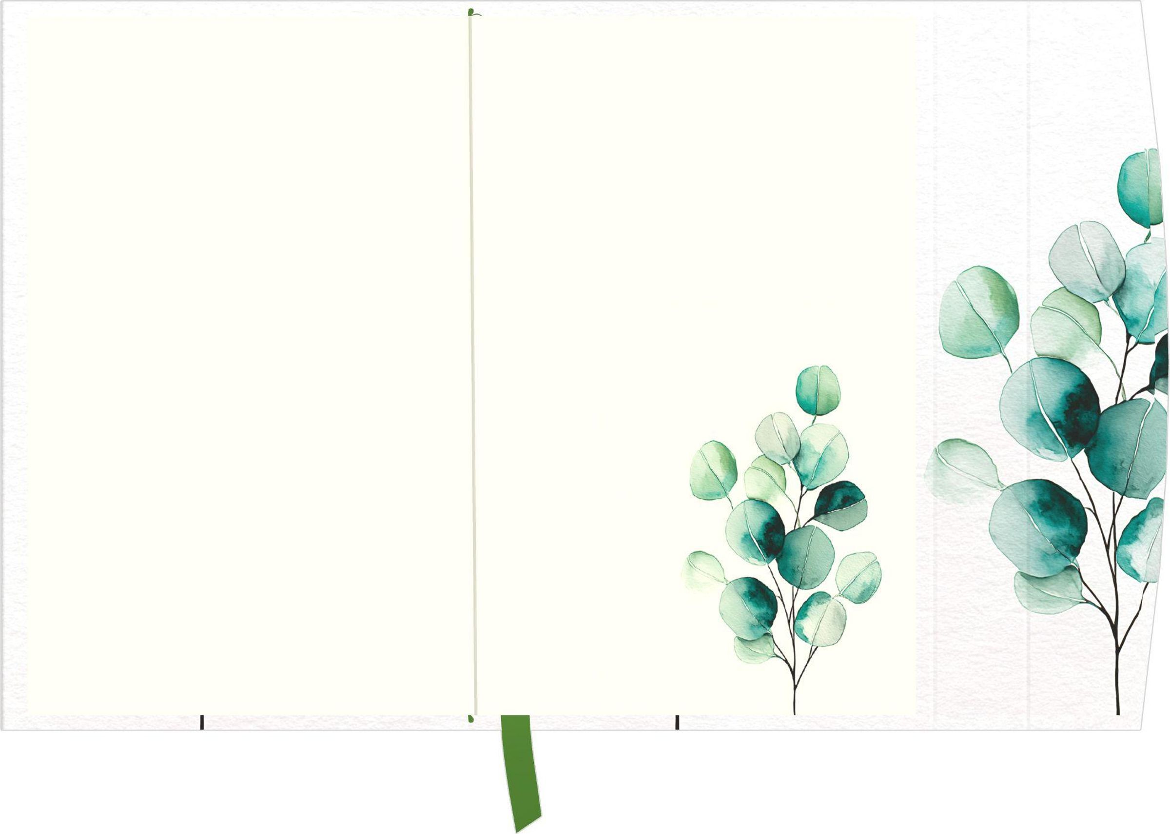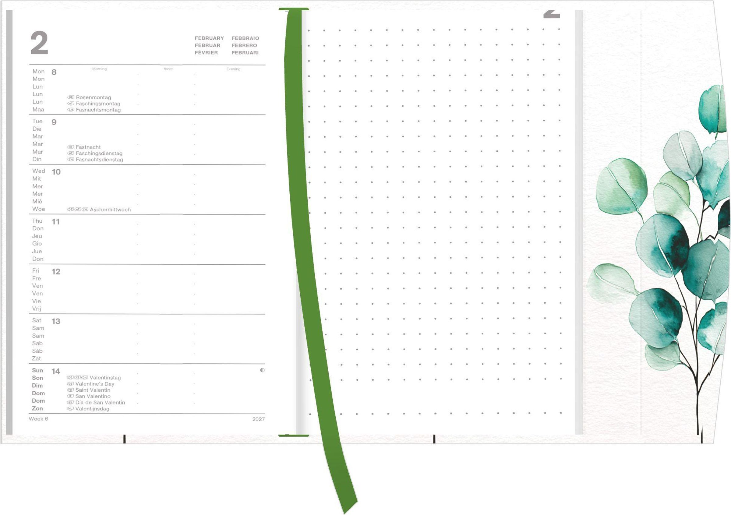 "2027" steht oben. Aquarell-Illustration von grünen Zweigen mit runden Blättern auf weißem Hintergrund., Kalender