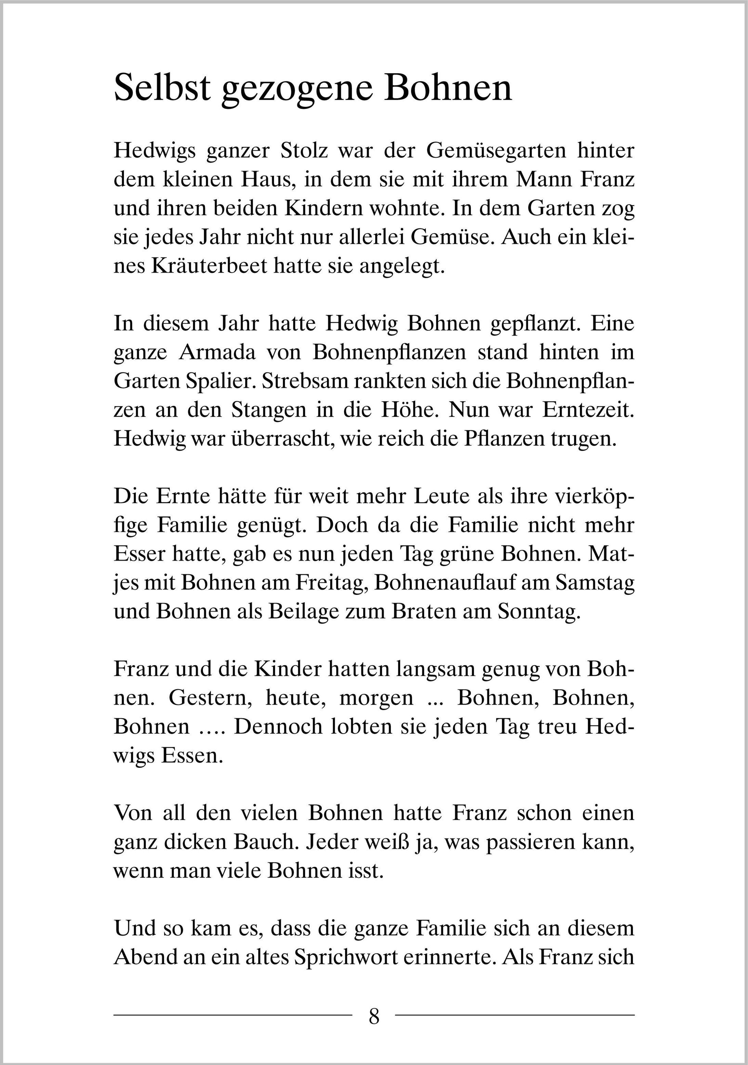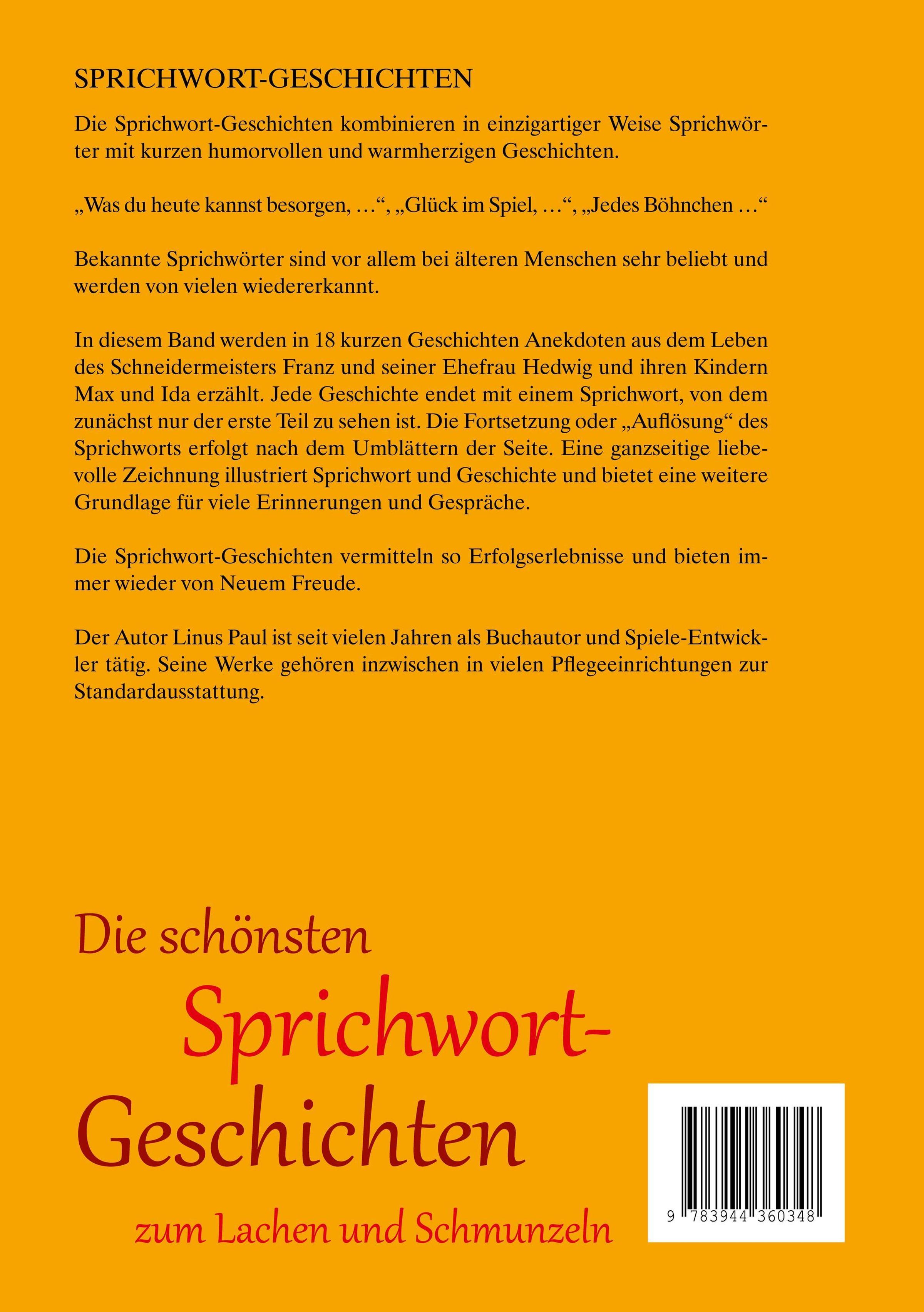 Die Sprichwort-Geschichten kombinieren die aus der Pflege bekannten Aktivierungskarten mit dem Konzept der (Vor-)Lesebücher: Kurze Geschichten münden in einem Sprichwort, von dem zunächst nur der erste Teil zu sehen ist. die Fortsetzung oder "Auflösung" des Sprichworts erfolgt nach dem Umblättern der Seite. Die Sprichwort-Geschichten vermitteln so Erfolgserlebnisse, machen Spaß und bieten Angehörigen und dementiell erkrankten Menschen die Möglichkeit das Buch spielerisch zu entdecken.