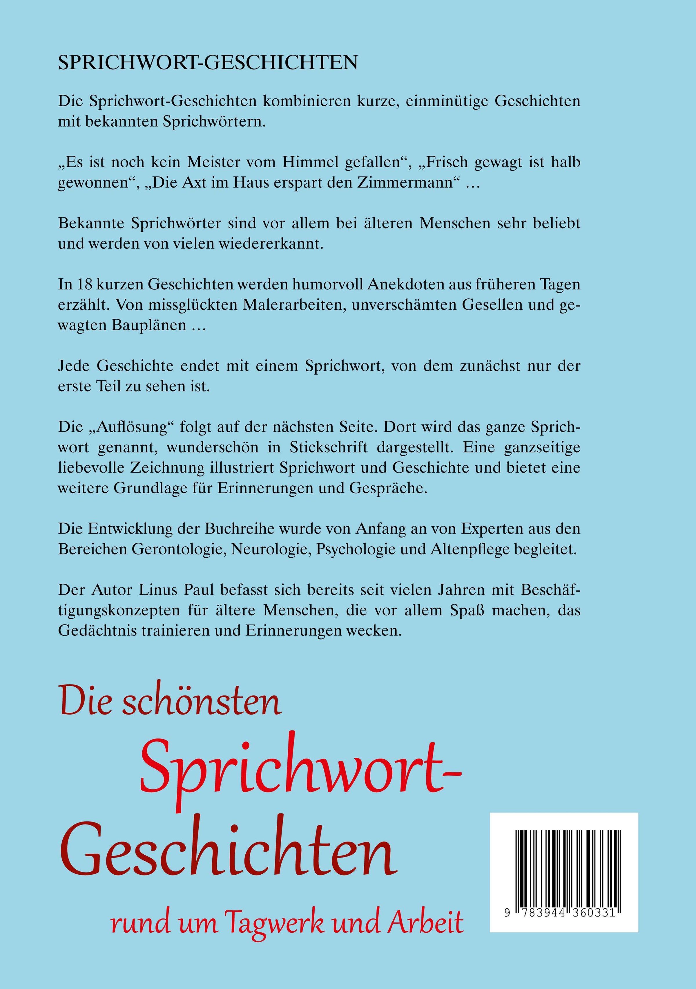 - Die schönsten Sprichwort-Geschichten von Arbeit und Handwerk - das sind 18 kurze, einminütige Geschichten, die in einem Sprichwort münden.