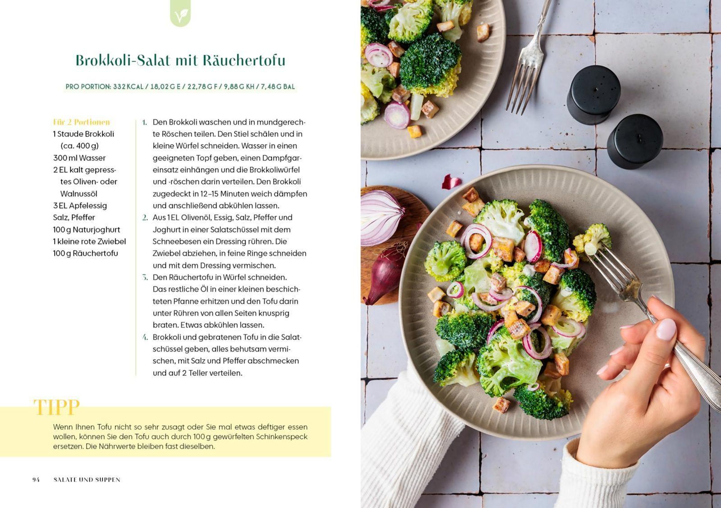 - Sättigende Salate wie Brokkoli-Salat mit Räuchertofu, Sommersalat mit Wassermelone oder Curry-Eiersalat mit Radieschen
