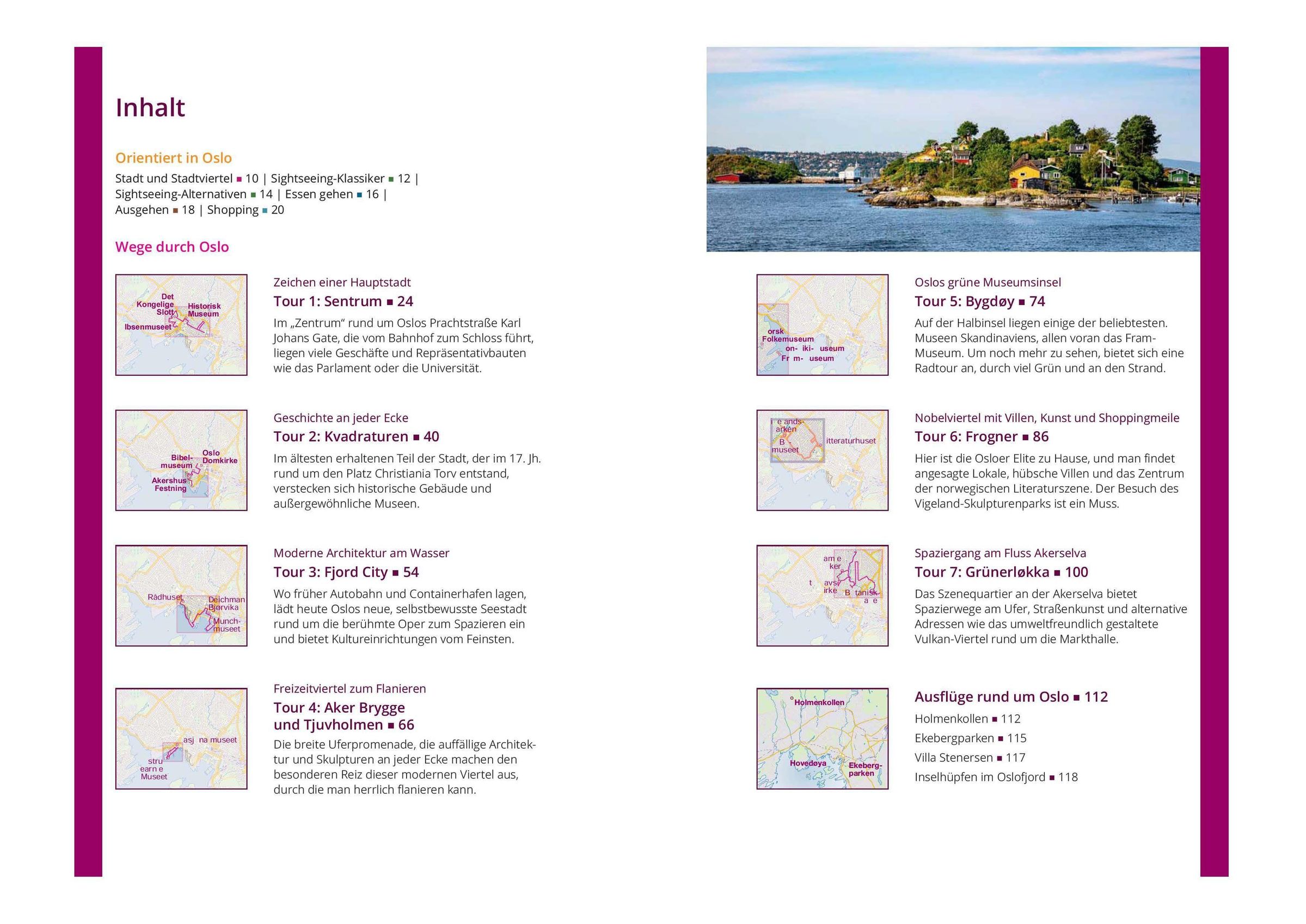 Flanieren Sie durch die Fjord City vorbei an der berühmten Oper, entdecken das Szeneviertel Grünerløkka und genießen Highlights der New Nordic Cuisine. Der City-Guide nimmt Sie mit ins historische Kvadraturen, zum Vigeland-Skulpturenpark nach Frogner, ins moderne Aker Brygge und auf die Museumshalbinsel Bygdøy. Vier Ausflüge führen in die nähere Umgebung, nach Holmenkollen, in den Ekebergparken, zur Villa Stenersen und zum Oslofjord.