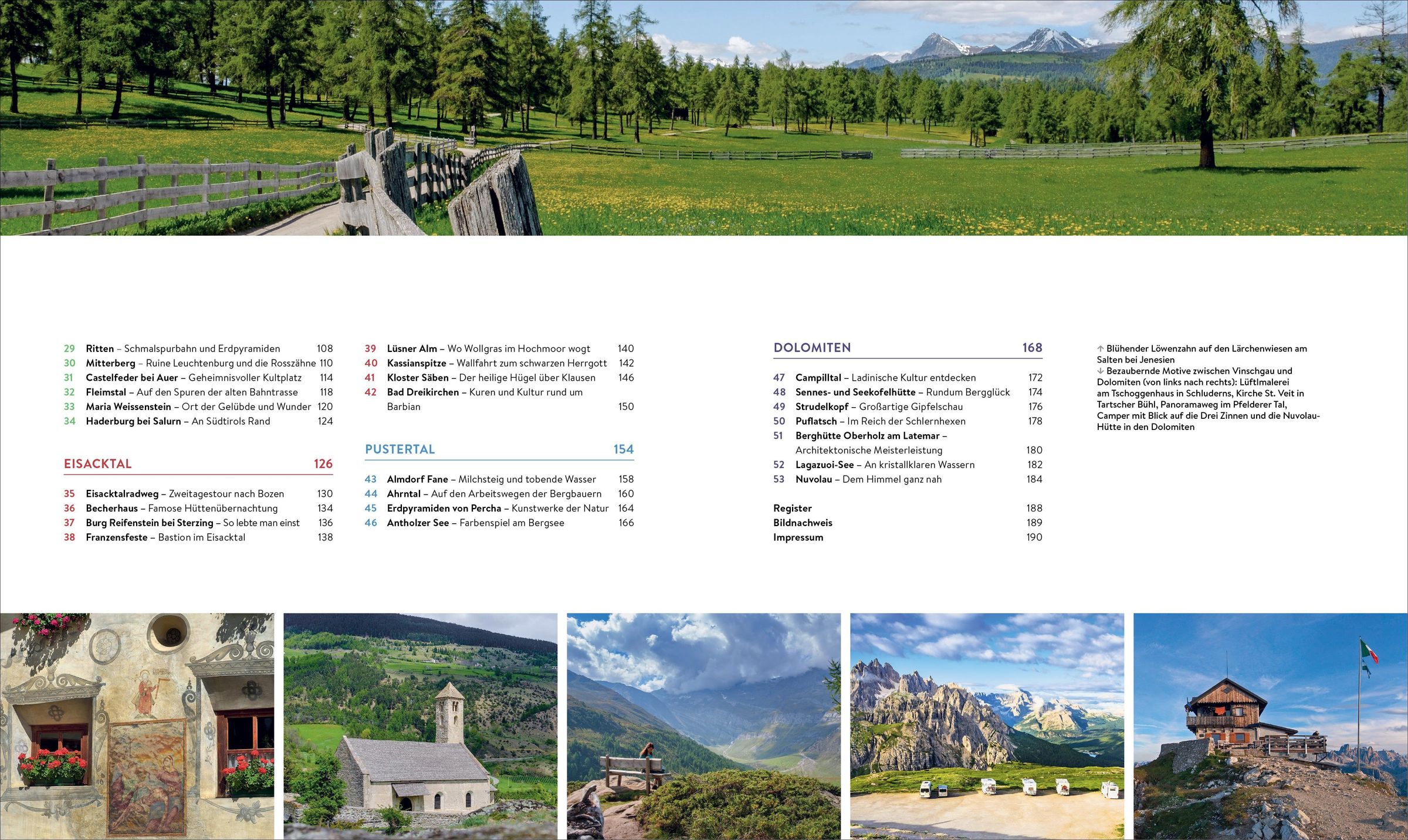 Besucht die geheimen Winkel Südtirols! Mit dem Wohnmobil geht es abseits der ausgetretenen Pfade in ein Land voller Kontraste: zwischen urigen Bergdörfern und italienischem Dolce Vita, zwischen schneebedeckten Gipfeln und sonnenverwöhnten Weinbergen. Versteckte Plätze, stille Täler und geheimnisvolle Seen wollen entdeckt werden. Ja, Südtirol lässt sich jenseits der Touristenströme bereisen, mit vielen Stell- und Campingplätzen - frei, individuell und ganz nah am echten Leben.