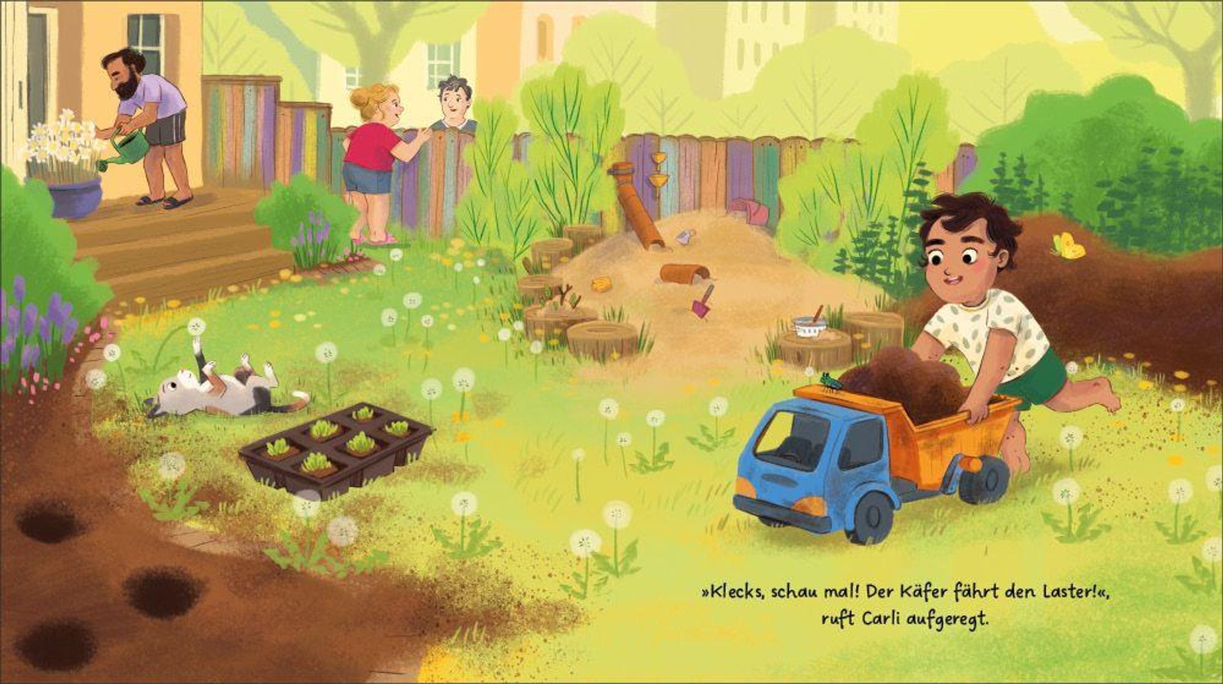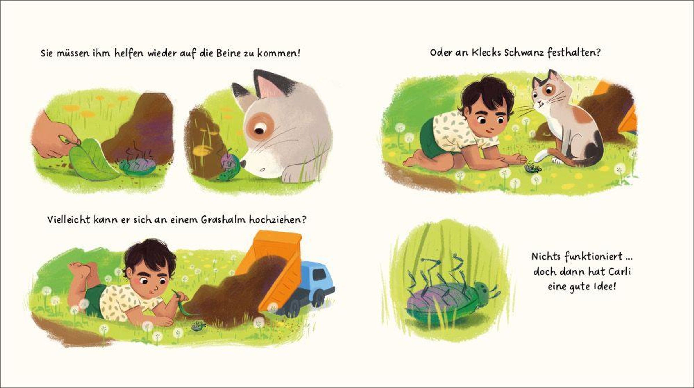 Carli und Klecks finden im Garten einen kleinen Käfer, der zappelnd auf dem Rücken liegt. Sie müssen ihm helfen! Carli passt gut auf, dass Klecks nicht übers Ziel hinausschießt, und tatsächlich kann das kleine Krabbeltier bald wieder fliegen.
