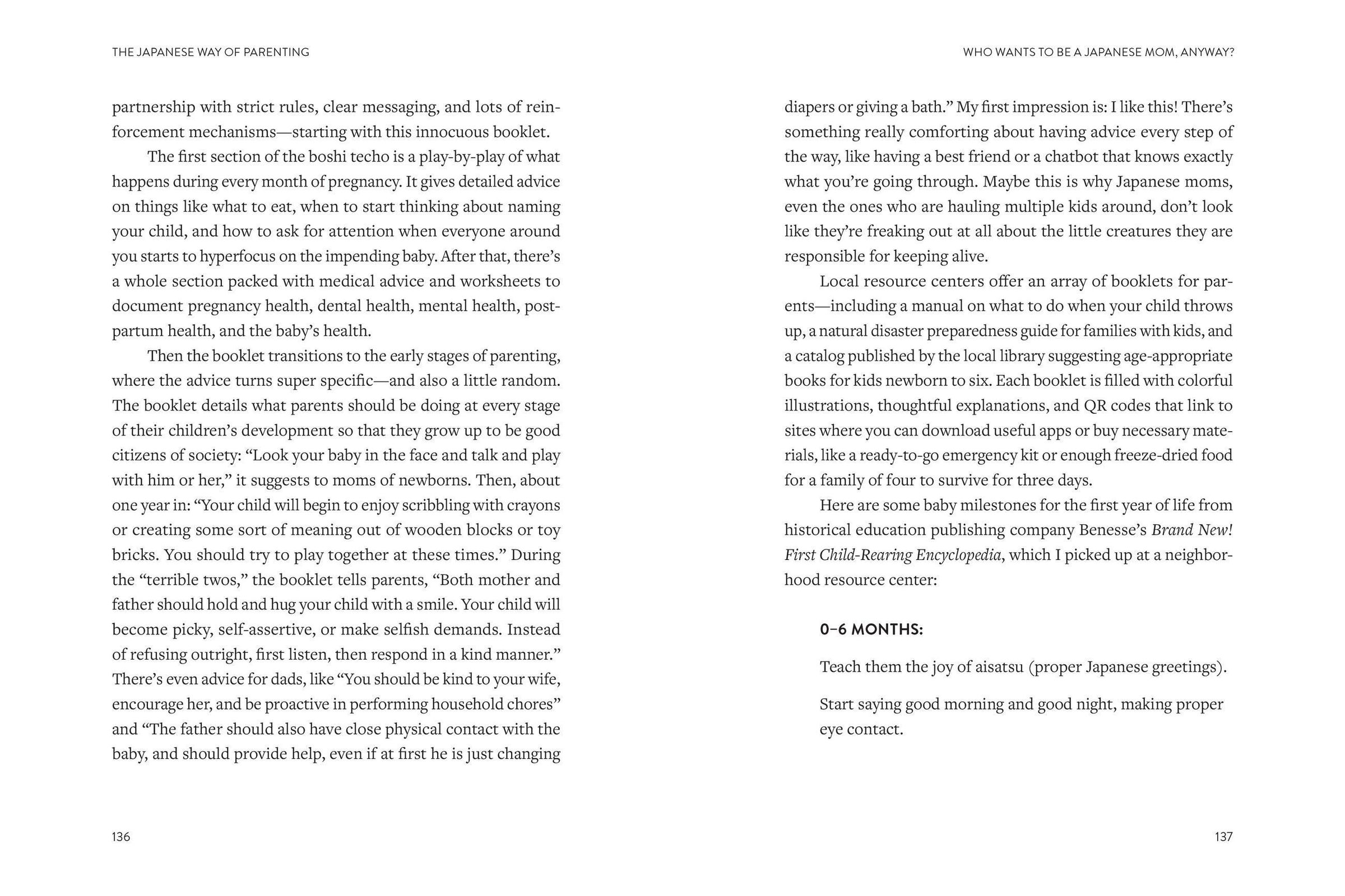 While Bringing Up Bébé introduced readers to the French way of raising obedient children who are seen but not heard, and Battle Hymn of the Tiger Mother shared an in iron-will parental approach to creating high-achieving kids, Lisa Katayama's Parenting the Japanese Way brings the principles of Japanese parenting to Americans, emphasizing unconditional love, community, and harmony with nature, to nurture children who are well-behaved, respectful, and creative.