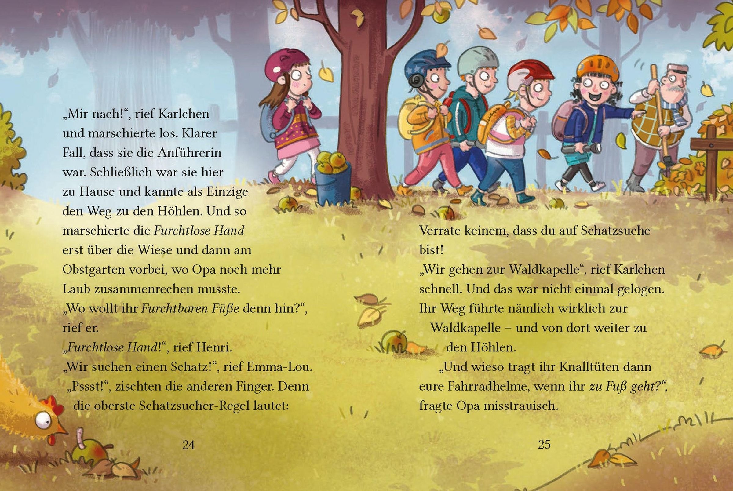 Karlchens Bande, die Furchtlose Hand, darf wieder ein ganzes Wochenende auf Karlchens Bauernhof verbringen und Abenteuer erleben. "Hurra!", rufen Karlchen, Briska, Emma-Lou, Henri und Maria. Doch was nicht kommen will, ist ein Abenteuer ... Zum Glück hat Karlchen eine Spitzenidee, und schon geht die Furchtlose Hand auf Schatzsuche. Allerdings findet sich der Schatz ganz anders als gedacht, und mir nichts dir nichts steckt die Furchtlose Hand mitten im schlimmsten Banden-Zoff aller Zeiten. Karlchen sitzt plötzlich allein im Baumhaus, mit einem Herzen so schwer wie ein Felsbrocken. Aber so darf die Furchtlose Hand doch nicht enden, oder?