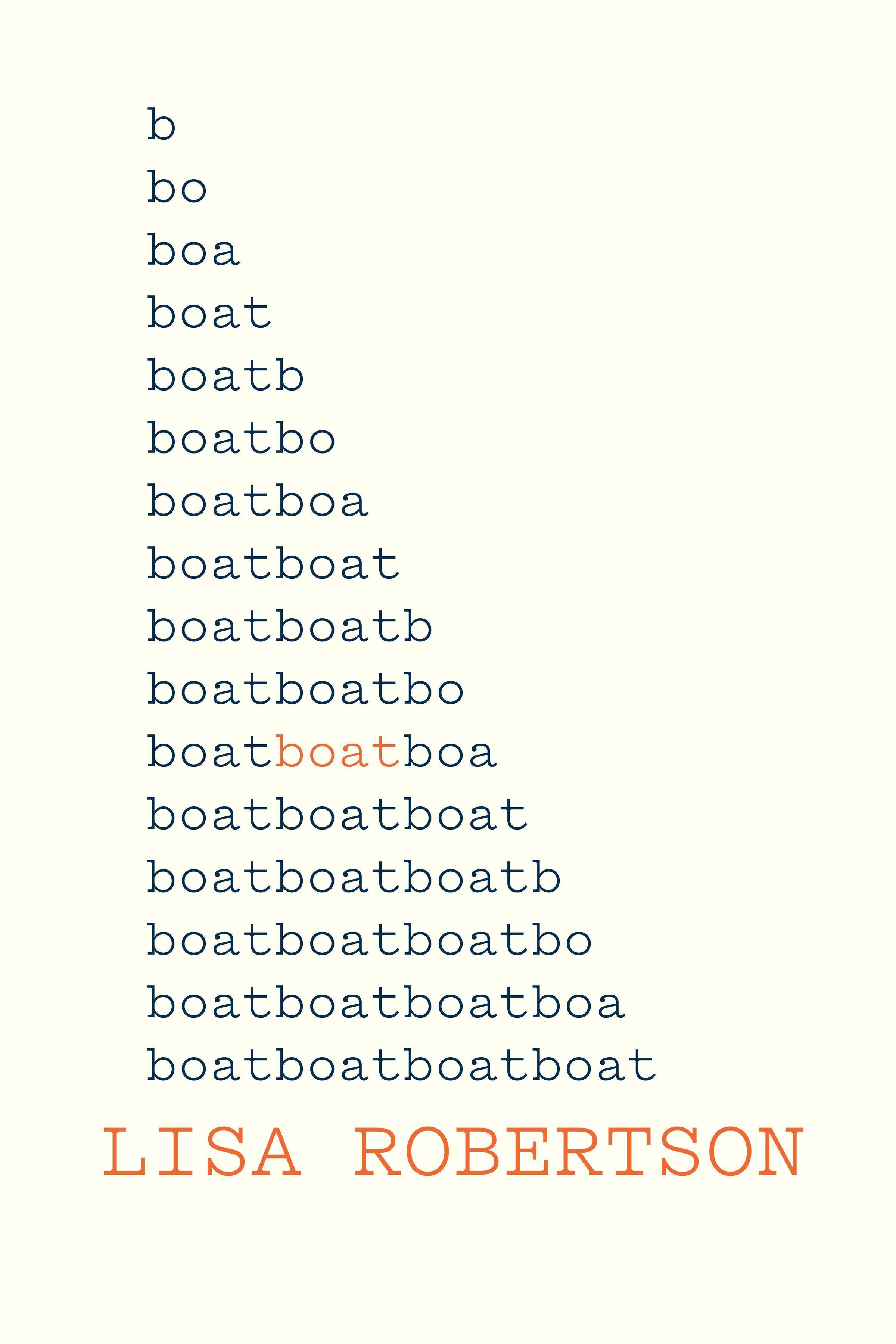 "In 2004, boldly original poet Lisa Robertson published a chapbook, Rousseau's Boat, poems culled from years of notebooks that are, nevertheless, by no means autobiographical. In 2010, she expanded the work into a full-length book, R's Boat. During the pandemic, she was drawn back into decades of journals to shape Boat. These poems bring fresh vehemence to Robertson's ongoing examination of the changing shape of feminism, the male-dominated philosophical tradition, the daily forms of discourse, and the possibilities of language itself."--