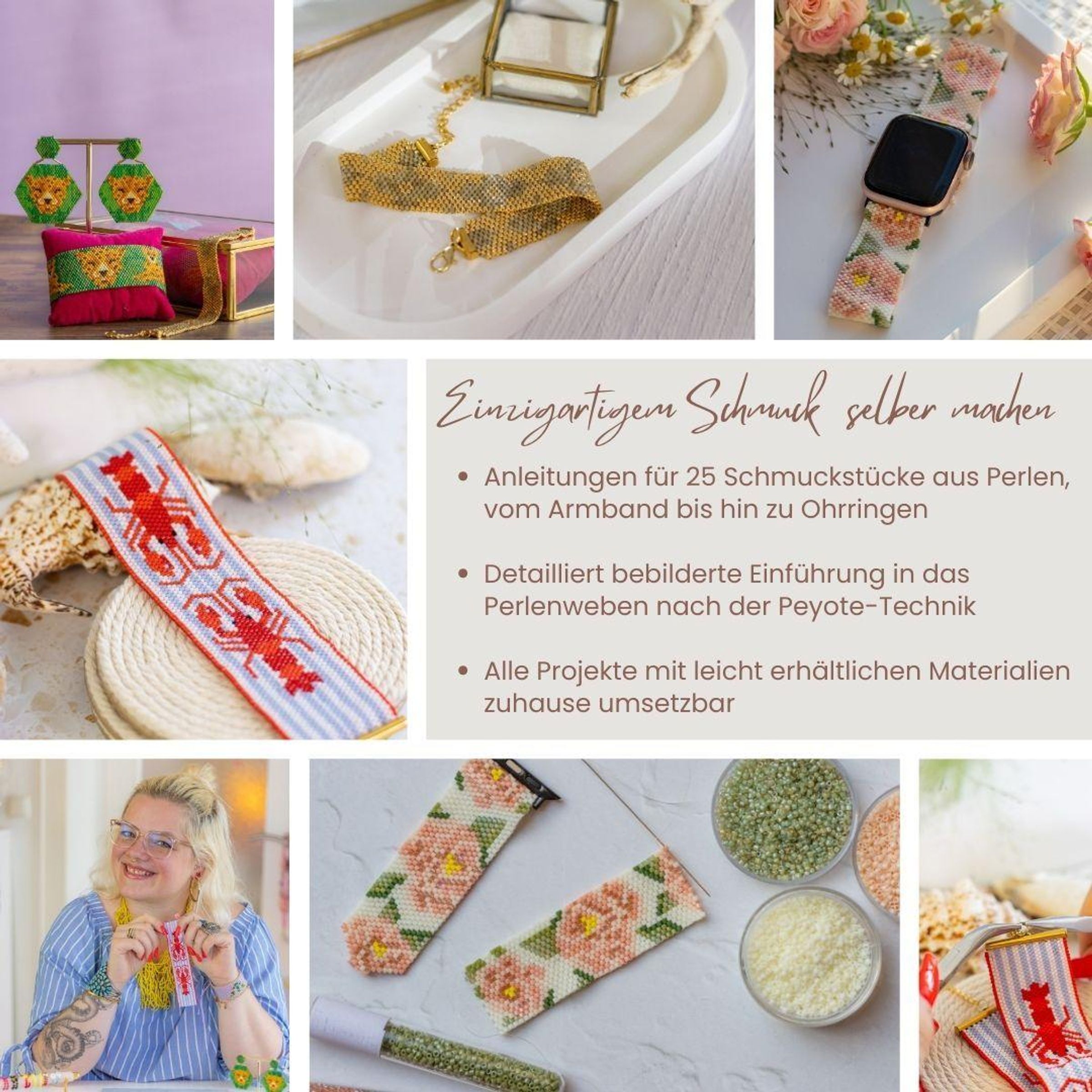 25 detaillierte Projekte: Die Modelle reichen von Armbändern mit Perlen über Ringe, Ketten und Ohrringe bis hin zu Perlenketten, Brillenketten und Smartwatch-Bändern. Jedes Projekt ist bebildert, klar beschrieben und lässt sich mit leicht erhältlichen Materialien zuhause umsetzen.