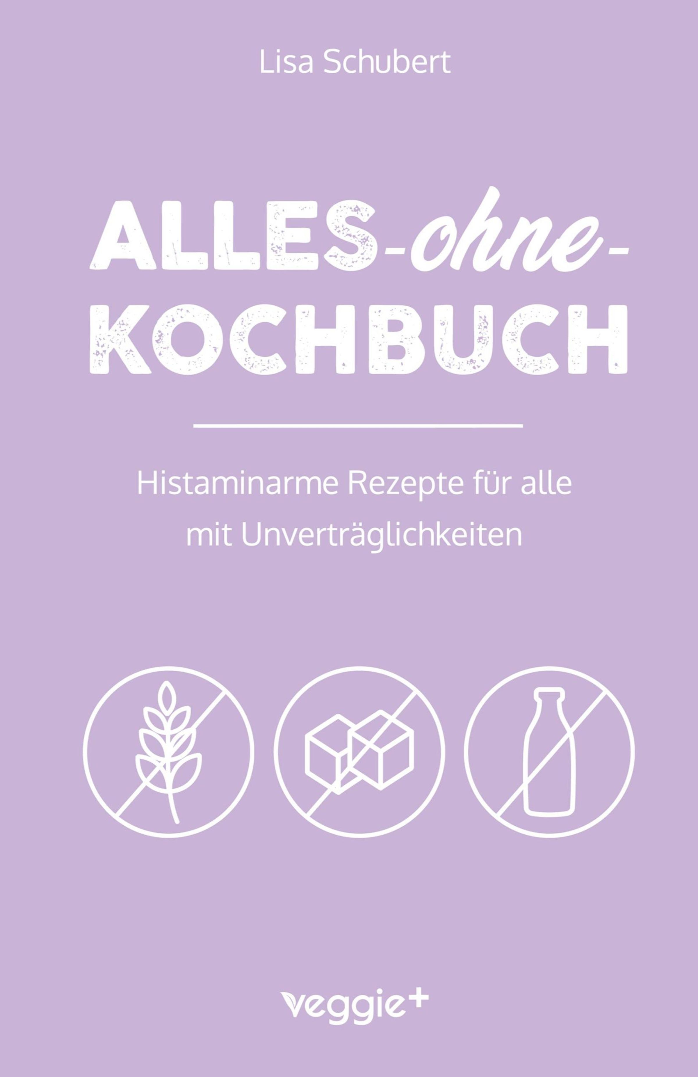 "Lisa Schubert. ALLES-ohne-KOCHBUCH. Histaminarme Rezepte für alle mit Unverträglichkeiten." Drei Symbole: Getreide, Zucker, Milch., Buch