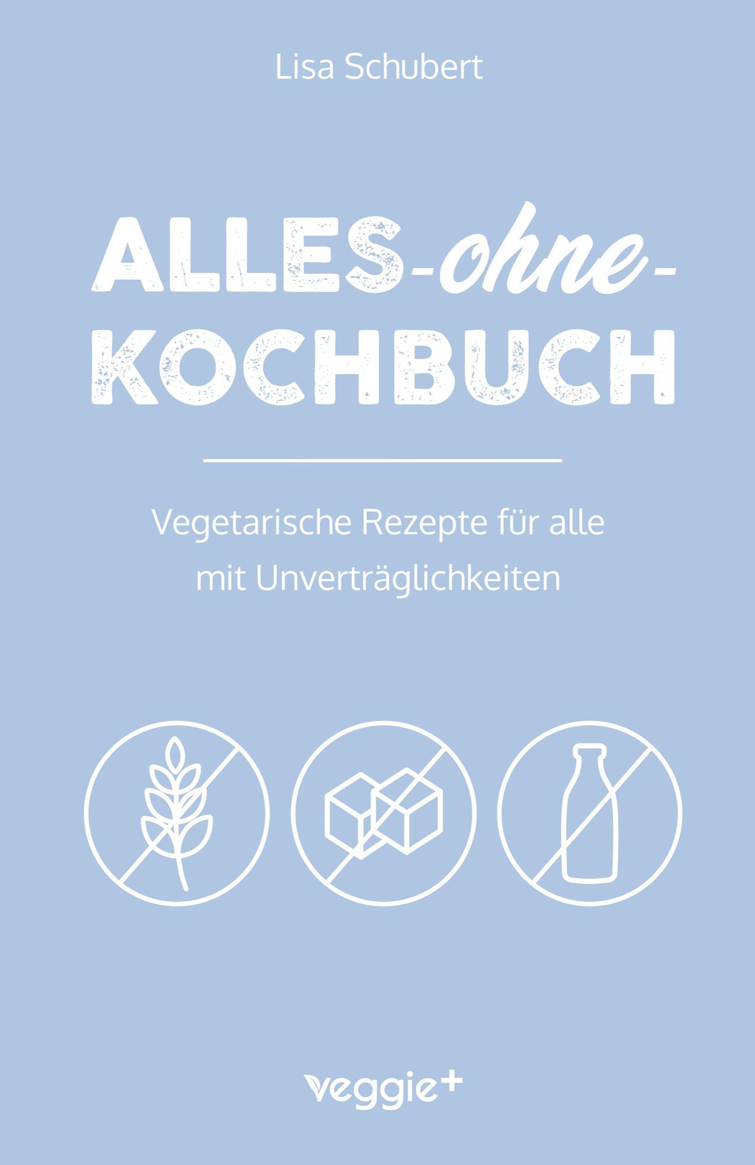 Buchtitel: "Alles-ohne-Kochbuch", vegetarische Rezepte mit Unverträglichkeiten. Drei Symbole: gluten-, zucker-, laktosefrei., Buch