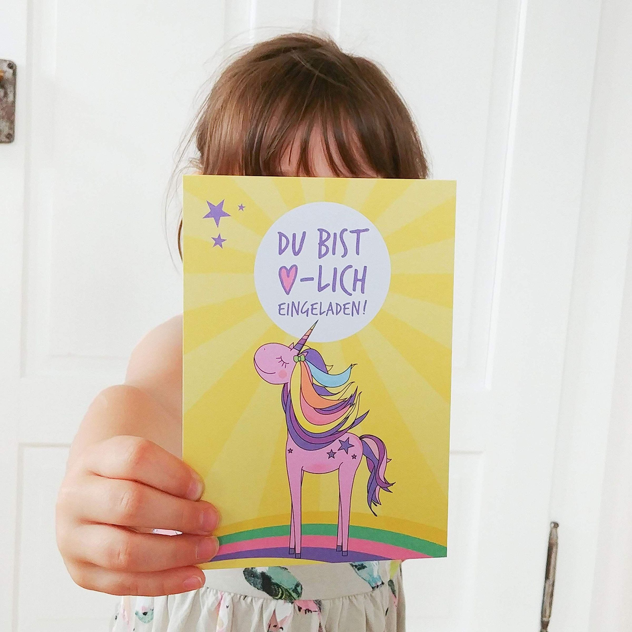 Lieferumfang 12 hochwertige Einladungskarten im klassischen Postkartenformat DIN A6, die auf Vorder- und Rückseite mit einem süßen Einhornmotiv bedruckt sind. Die Geburtstagseinladungen bestehen aus hochwertigem Karton. Zu jeder Einladungskarte gibt es den passenden Briefumschlag (DIN C6), ebenfalls mit Einhornmotiv. Verpackt ist das Set in einer farblich und thematisch passenden geschlossenen Schachtel.
