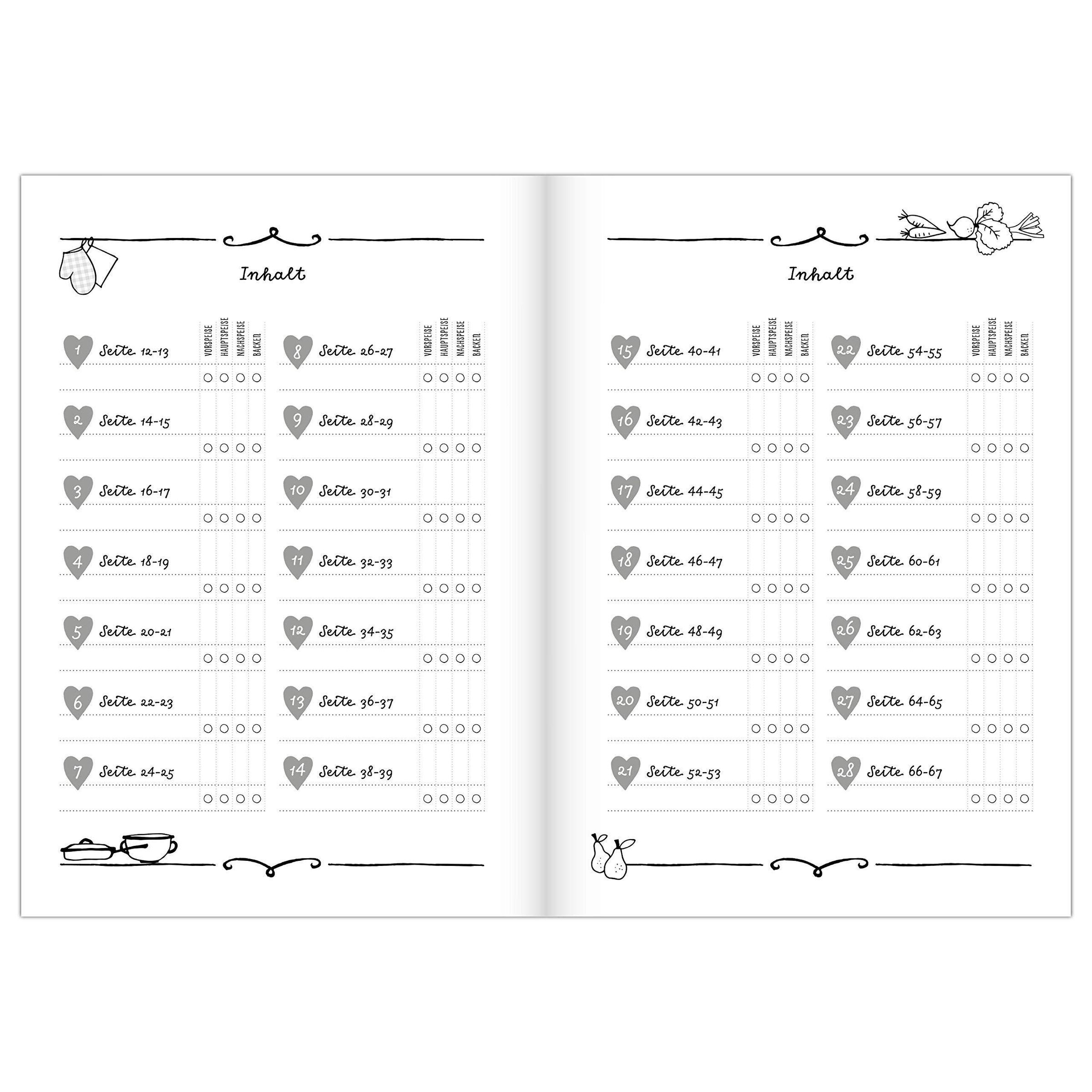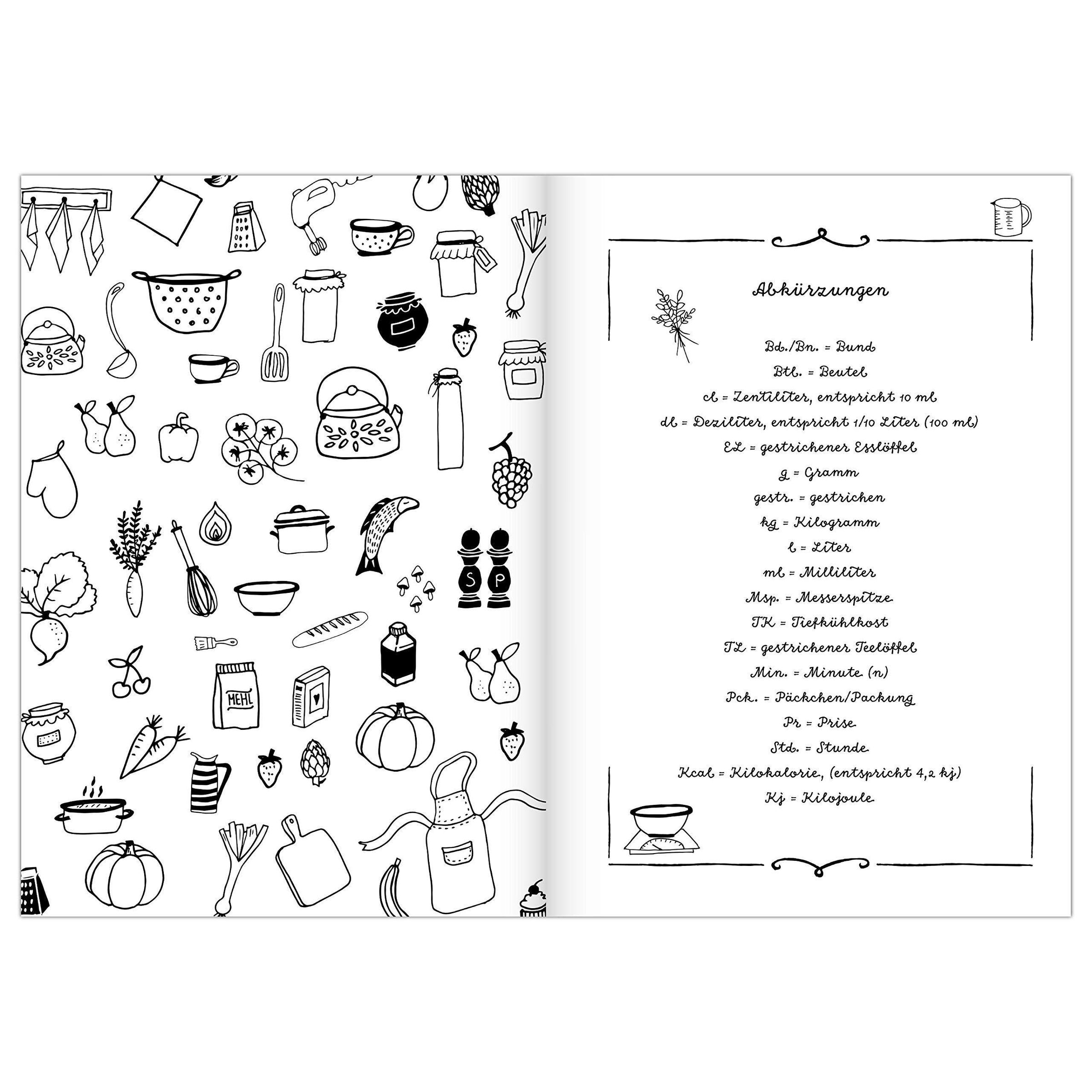 Das Cover und die Innenseiten sind ebenfalls mit viel Liebe von Hand designt und illustriert worden, damit du mit viel Liebe & Freude kochen und backen kannst. Auf den insgesamt 128 Seiten findest du Platz für 50 Rezepte und 6 Menüs. Für jedes Rezept hast du eine Doppelseite auf der du alles Wichtige notieren kannst: