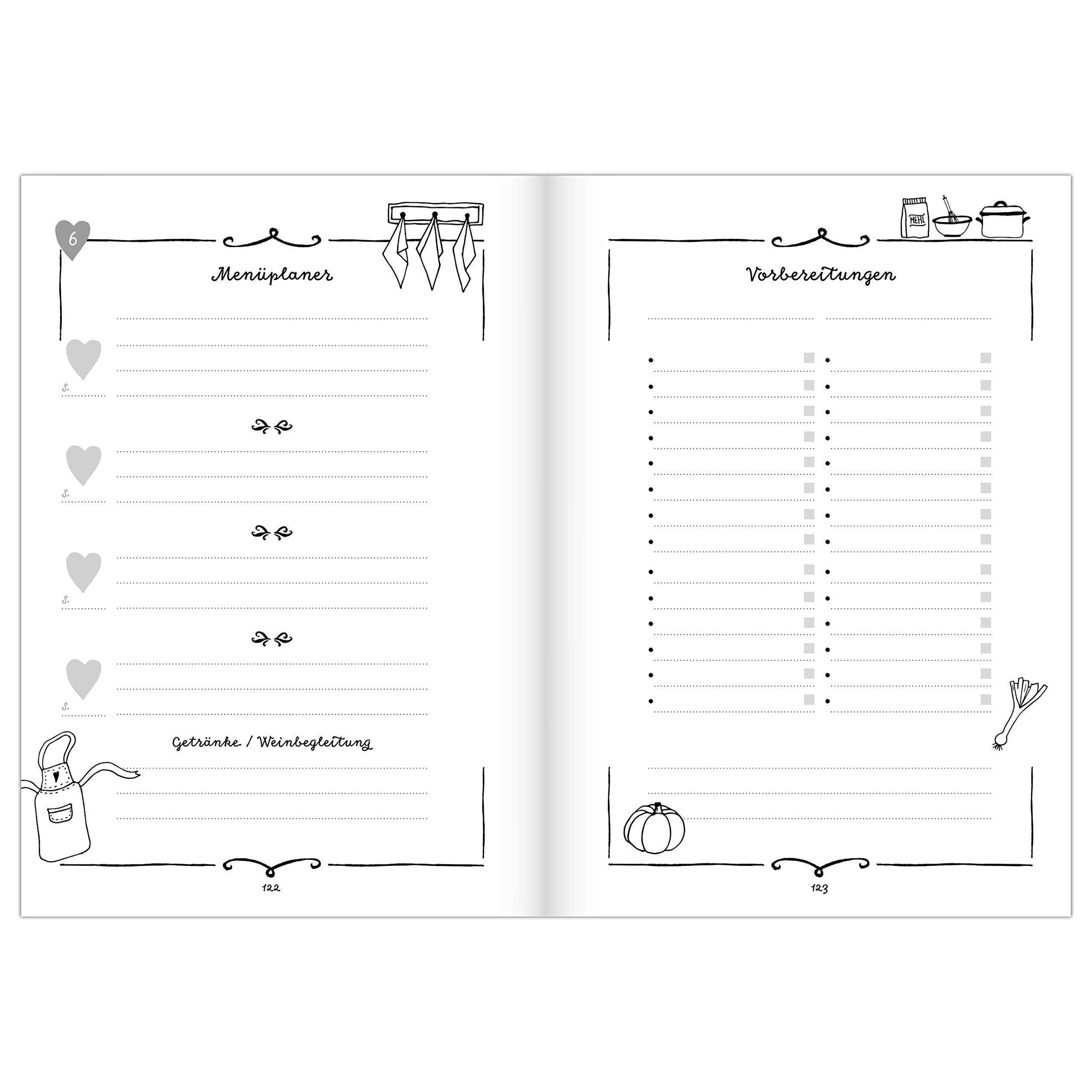 Auf den sechs zusätzlichen Seiten am Ende kannst du ganze Menüs, von der Vorspeise bis zur Nachspeise und den passenden Getränken planen.