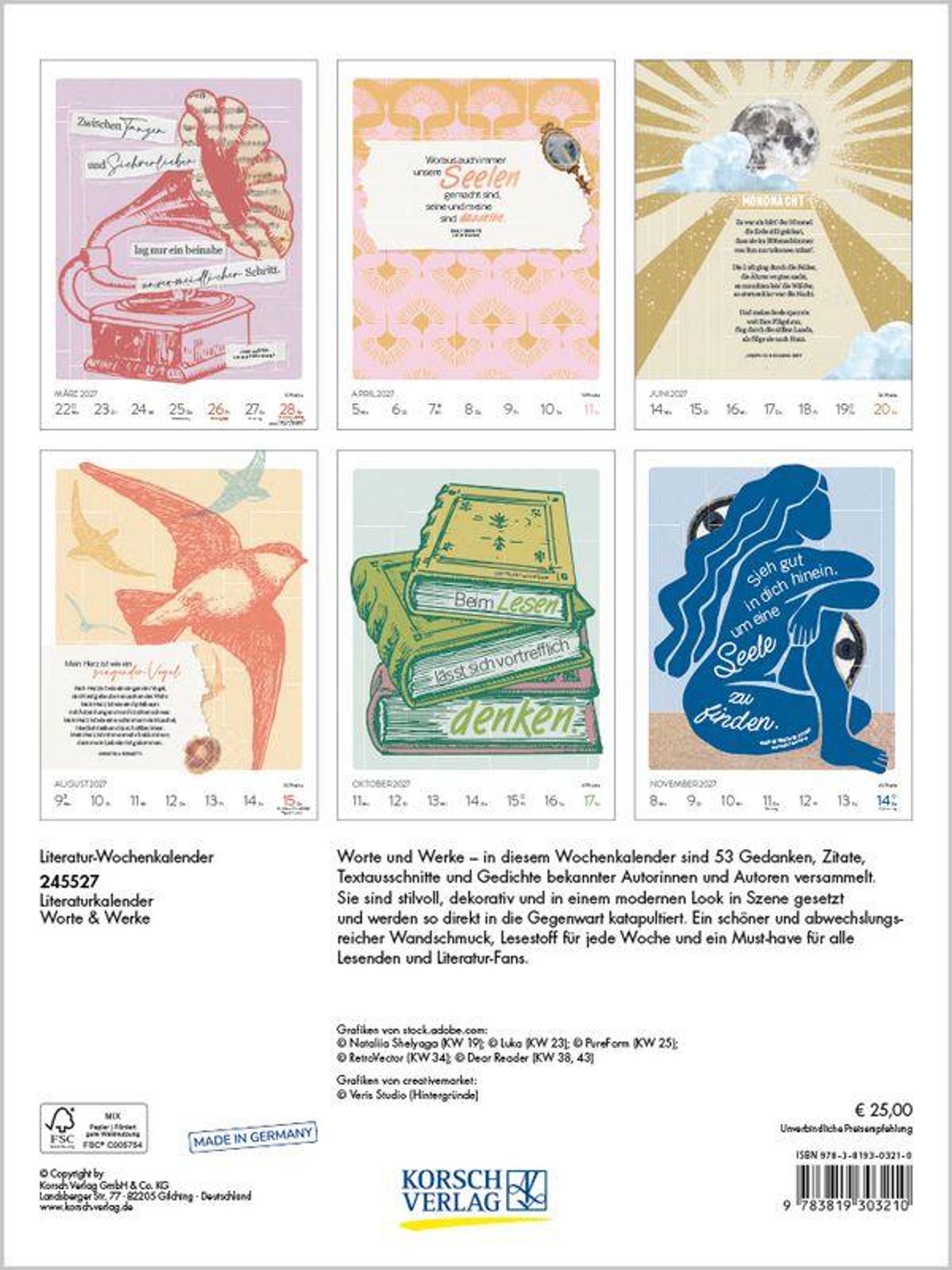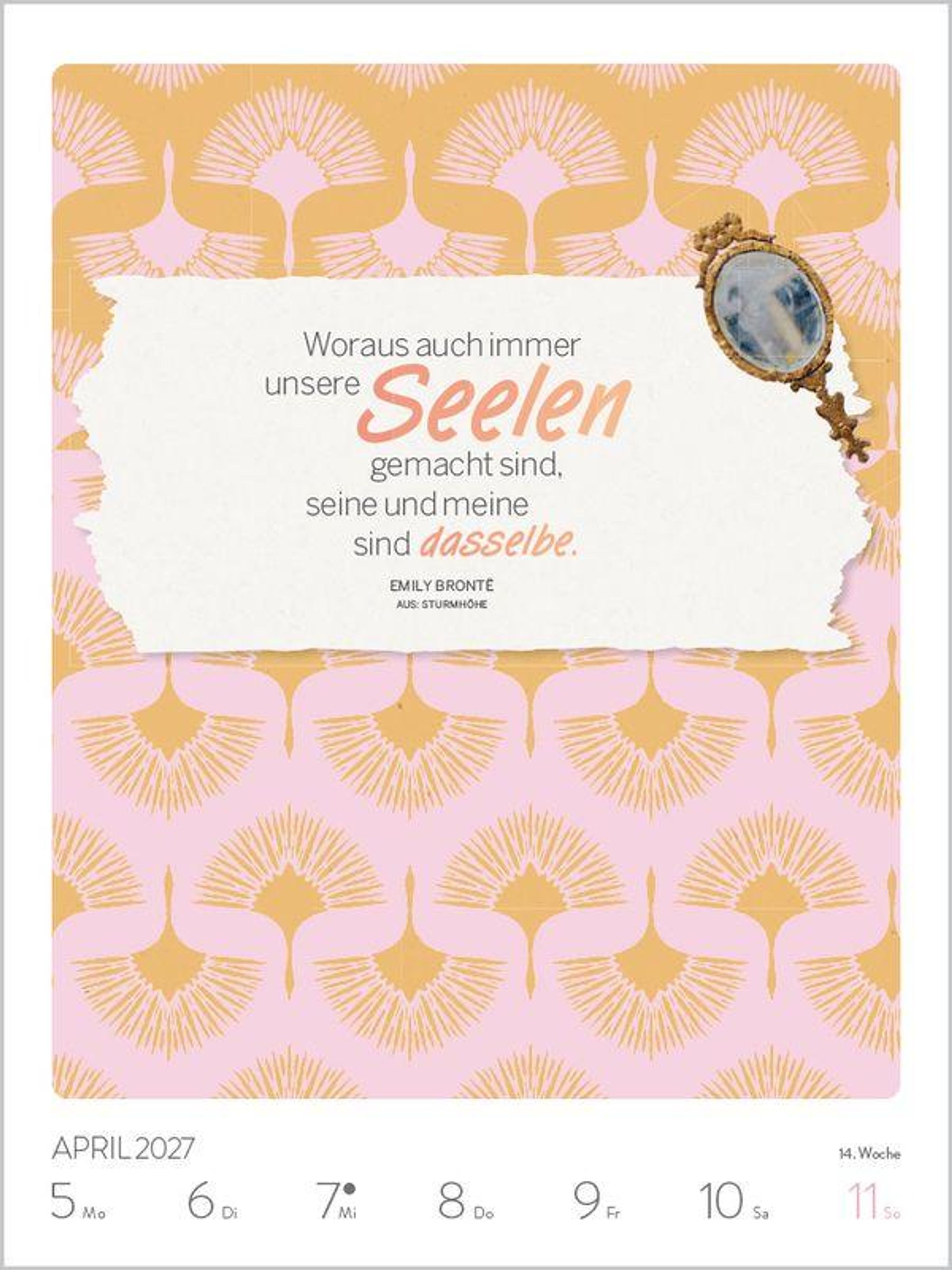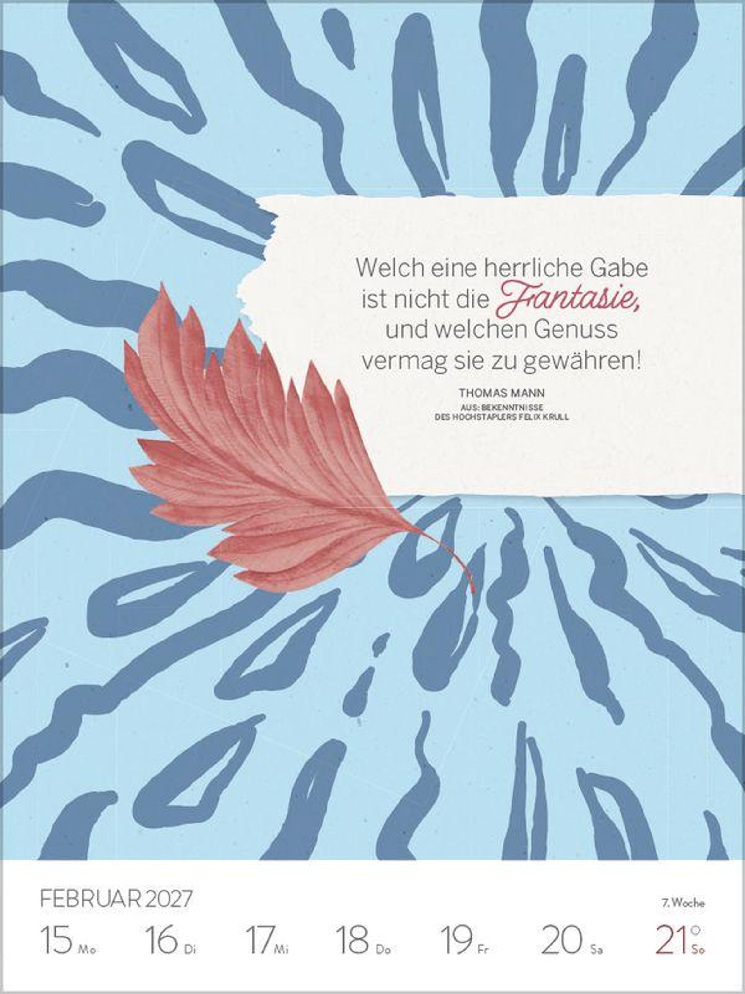 In diesem Wochenkalender sind 53 Gedanken, Zitate und Gedichte bekannter Autorinnen und Autoren in einem modernen Look in Szene gesetzt und werden so direkt in die Gegenwart katapultiert. Wundersch ön gestaltet und ein Must-have für alle Literatur-Fans. Mit Klimabeitrag hergestellt auf nachhaltig produziertem Papier.