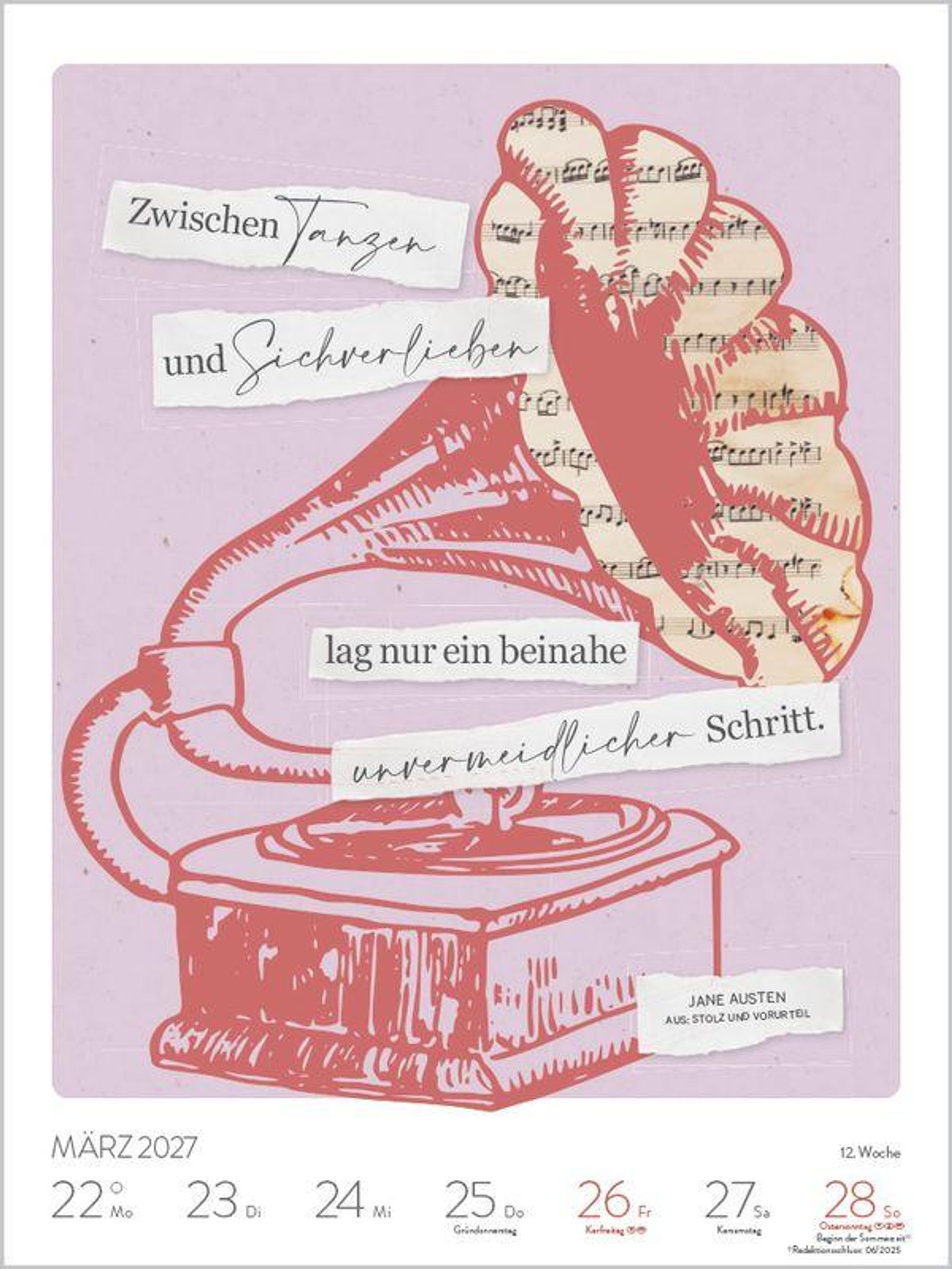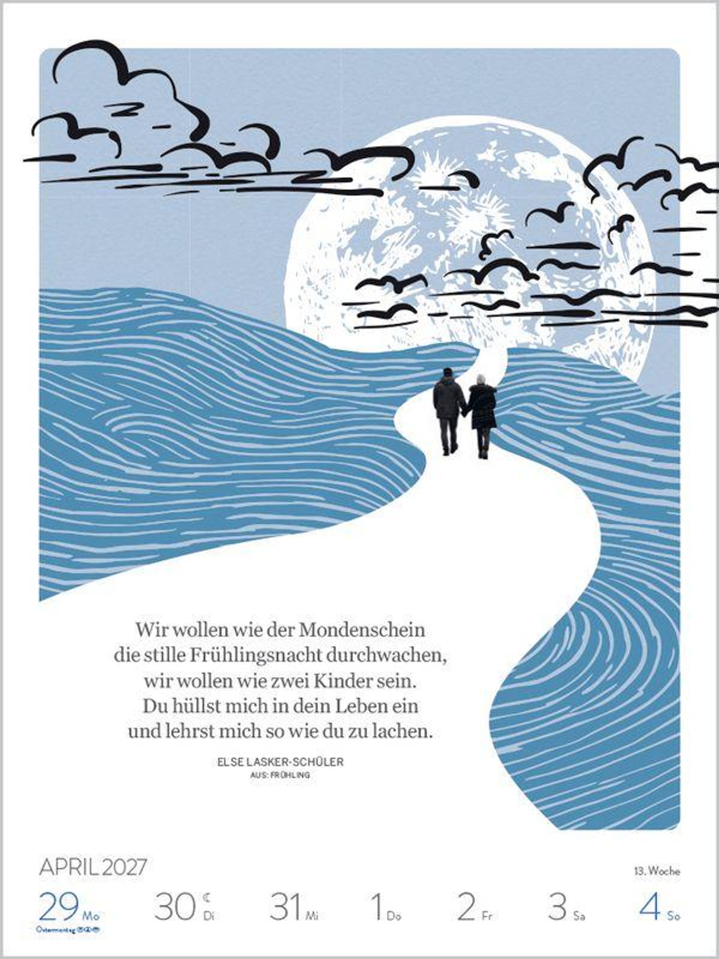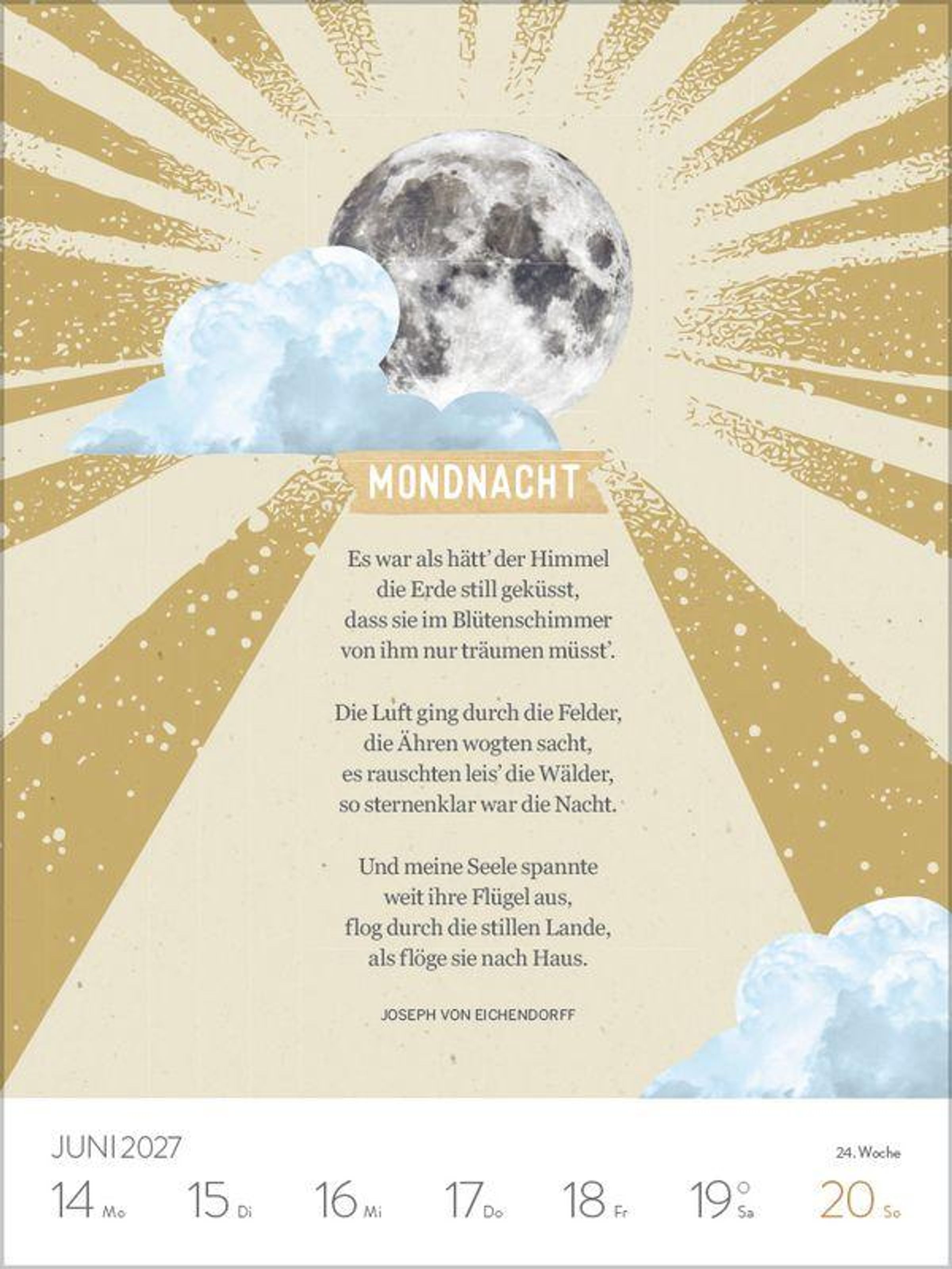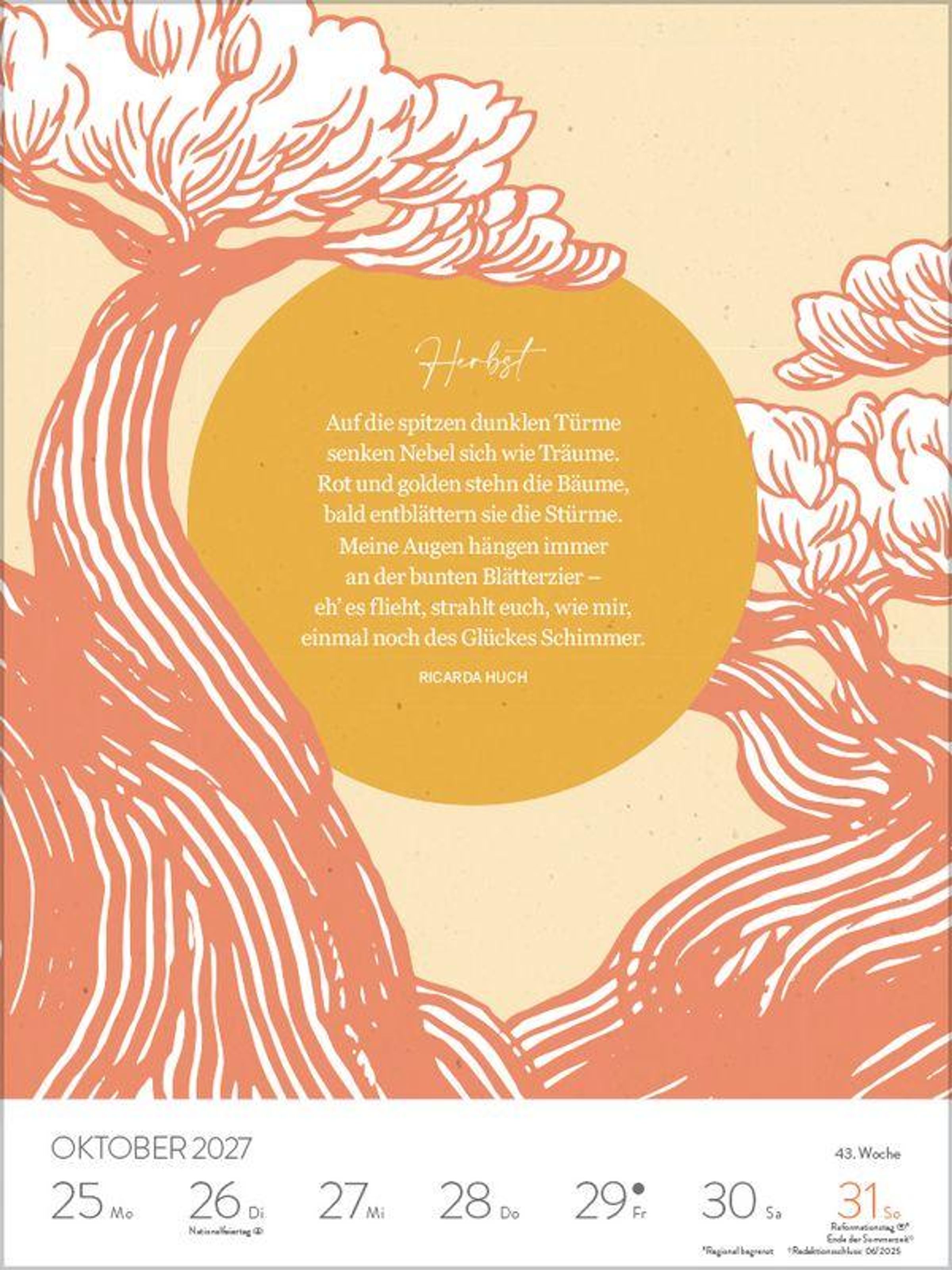 In diesem Wochenkalender sind 53 Gedanken, Zitate und Gedichte bekannter Autorinnen und Autoren in einem modernen Look in Szene gesetzt und werden so direkt in die Gegenwart katapultiert. Wundersch ön gestaltet und ein Must-have für alle Literatur-Fans. Mit Klimabeitrag hergestellt auf nachhaltig produziertem Papier.