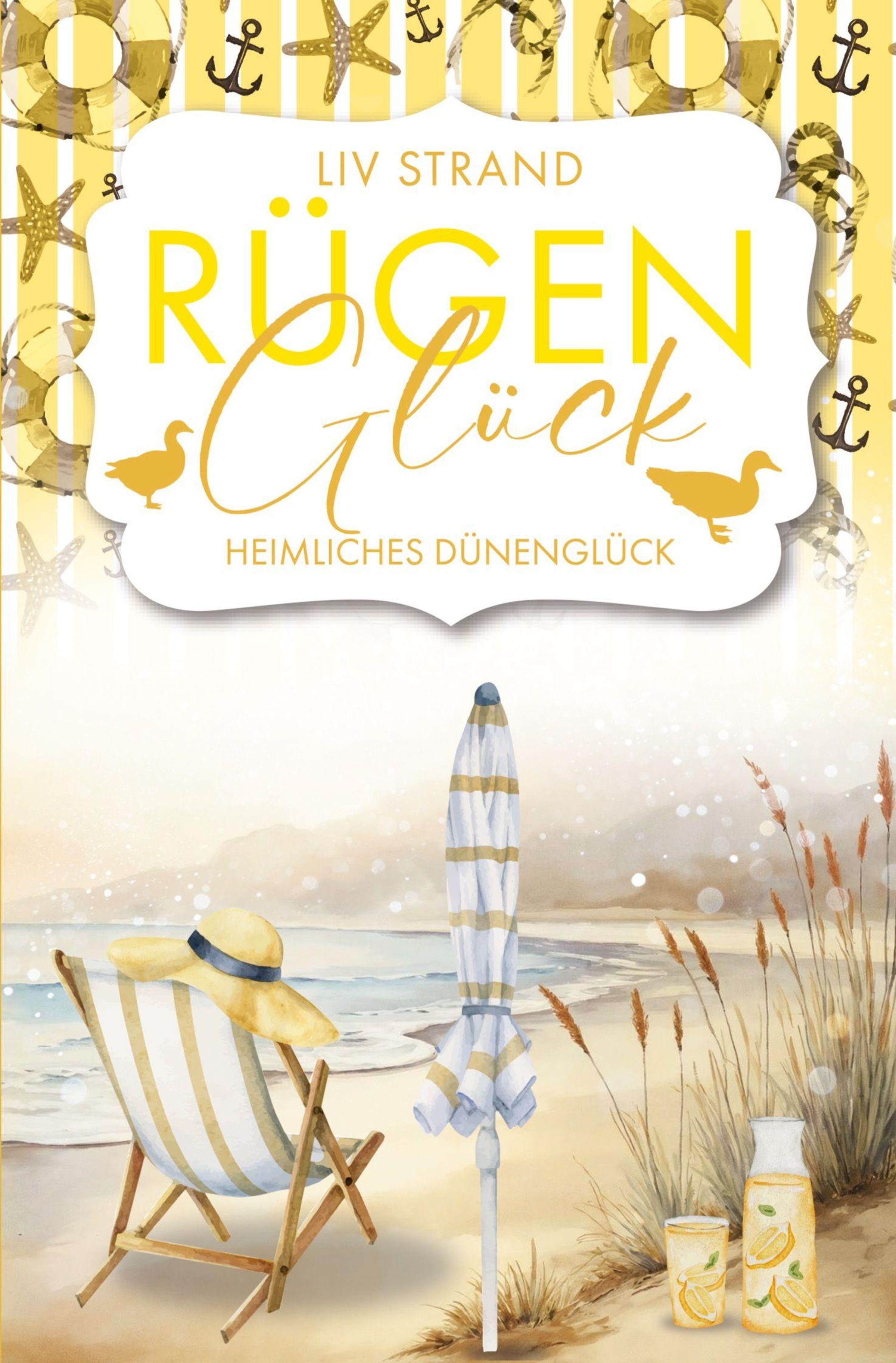 „Rügen Glück“, „Heimliches Dünenglück“, „Liv Strand“. Illustration: Strand mit Liegestuhl, Sonnenschirm, Sand und Meer., Buch
