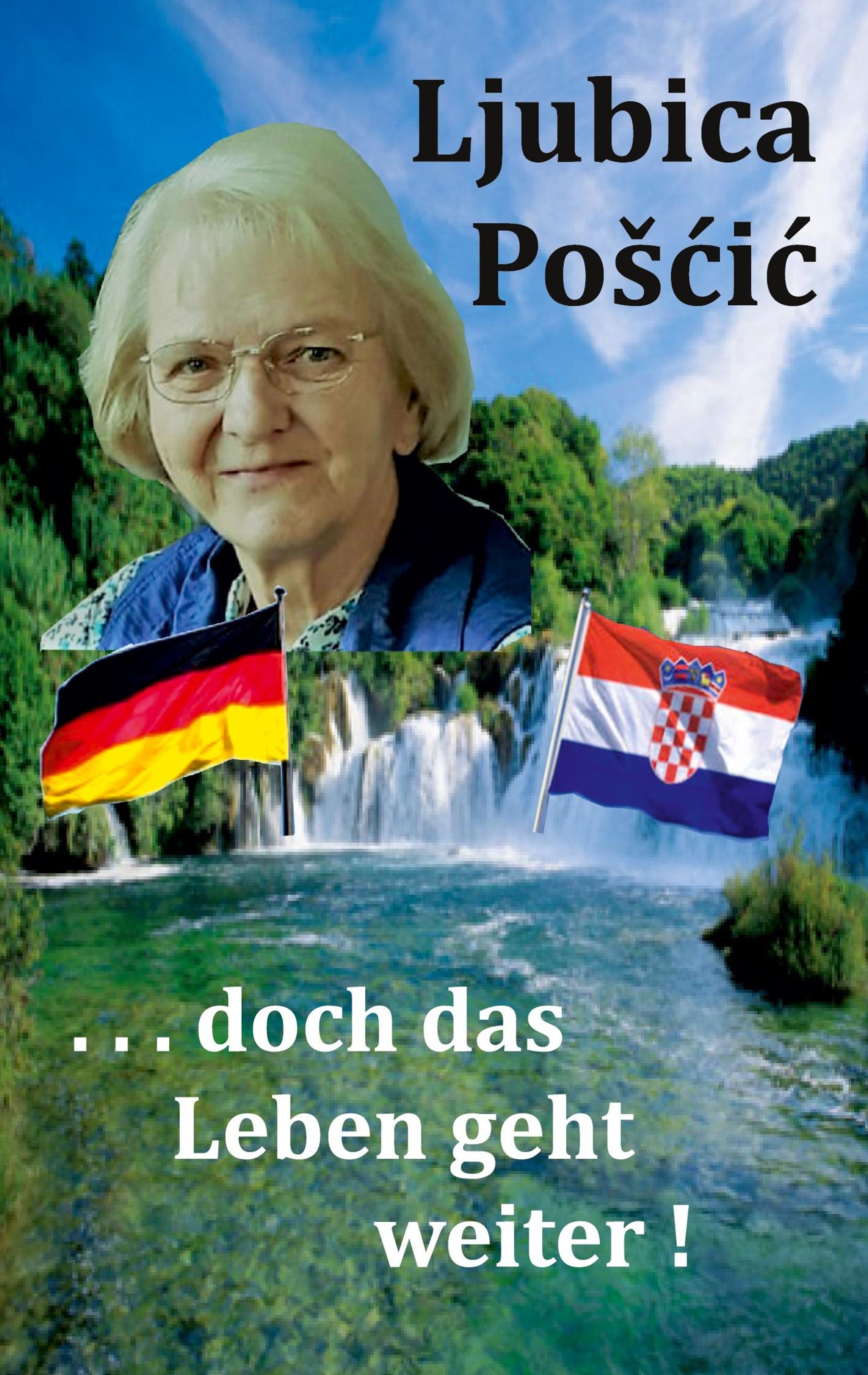 Ein Wasserfall, darüber der Text "Ljubica Poščić", unten "doch das Leben geht weiter!", daneben zwei Flaggen., Buch